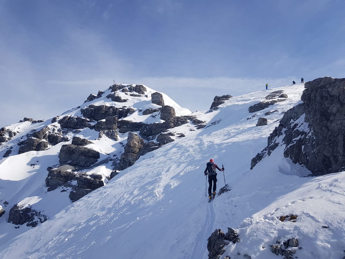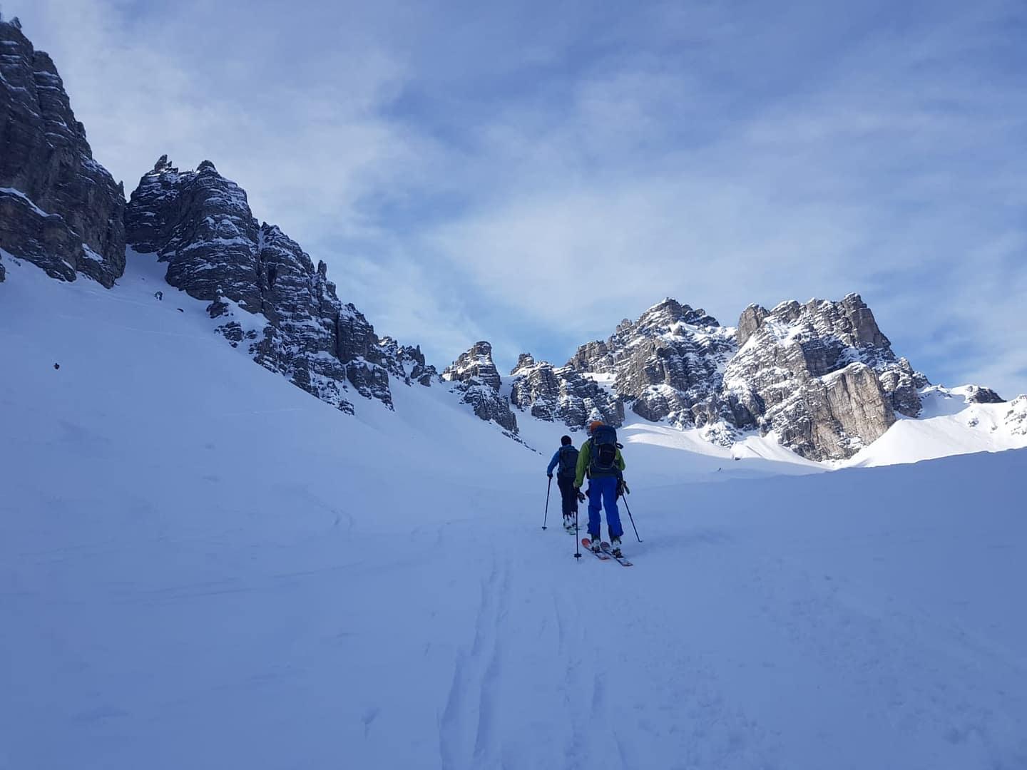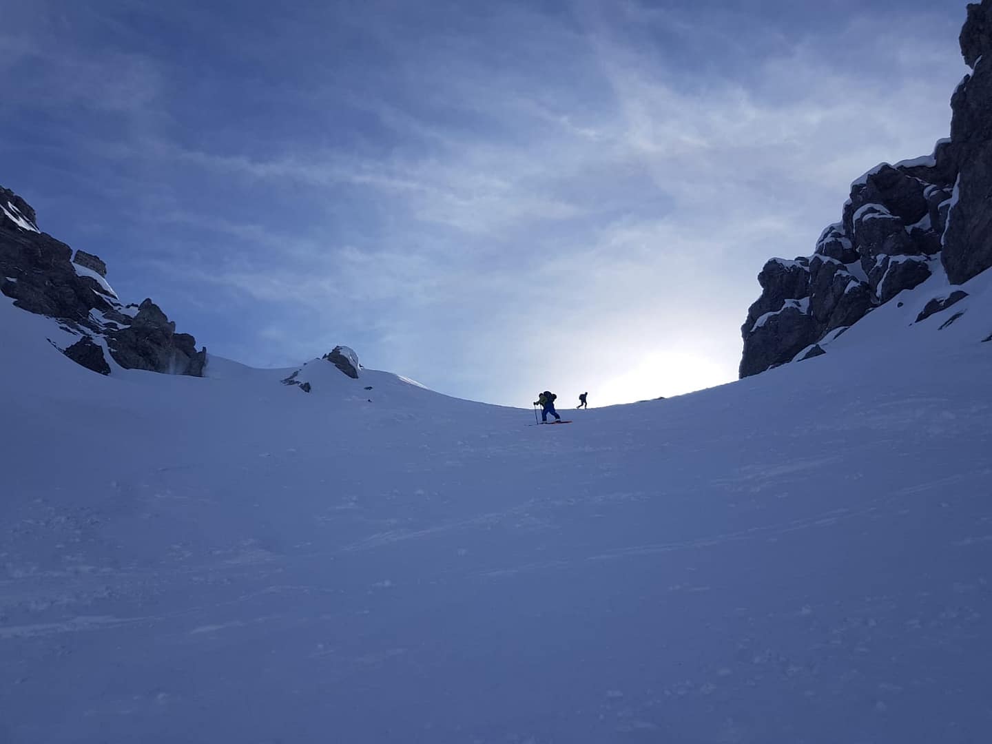 Auf der Höhe von ca. 2.080 m steigen wir links durch eine anfangs breite und sehr steile Rinne auf, hier sind je nach Bedingungen Harscheisen zu empfehlen. Ich habe die tatsächlich für die letzten 20 Höhenmeter für die Rinne dran machen müssen, weil es oben für mich zu eisig war. Oben an der Rinne angekommen, haben wir auf dem Sattel ein Skidepot gemacht.