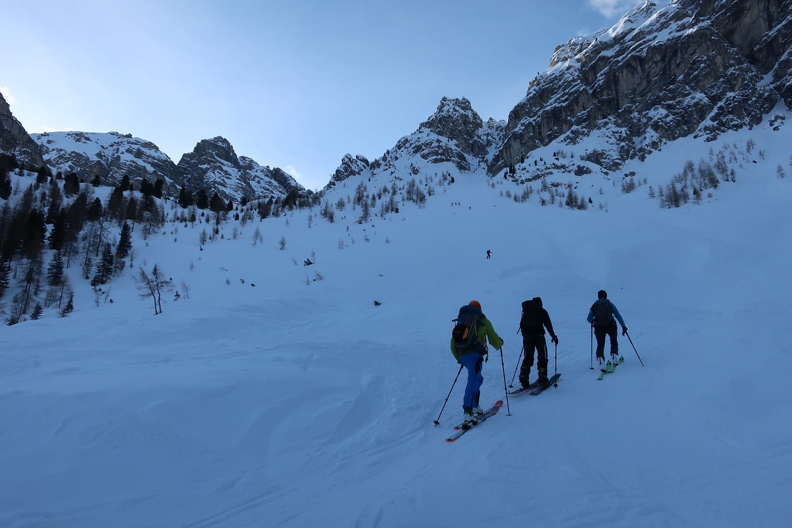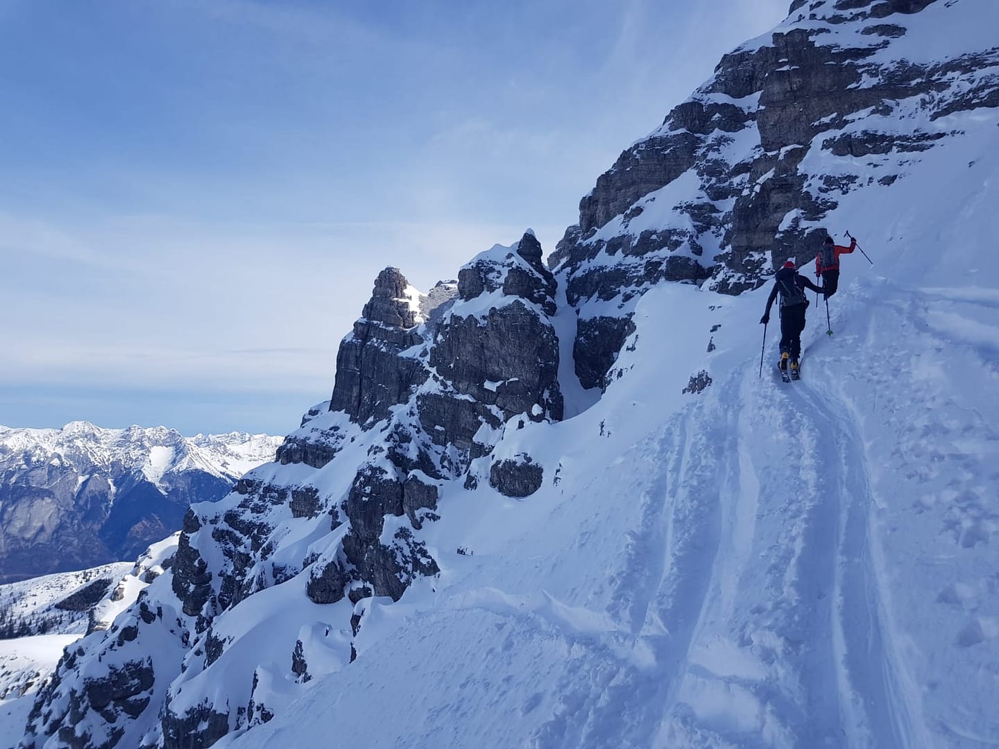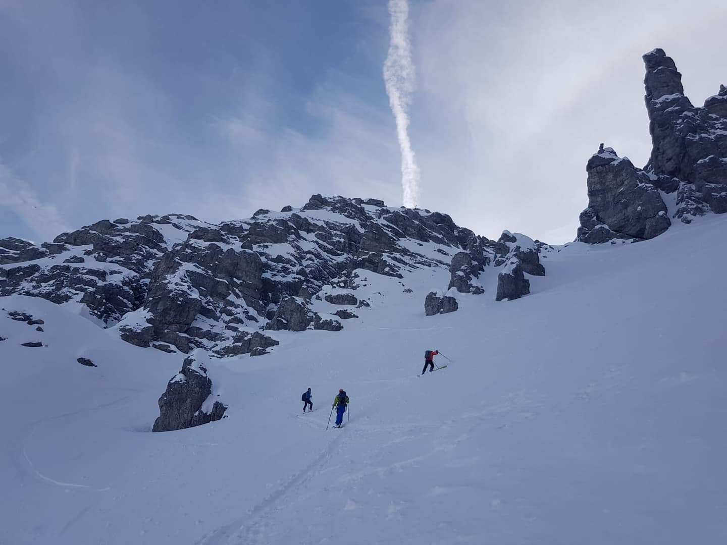 Auf der Höhe von ca. 2.080 m steigen wir links durch eine anfangs breite und sehr steile Rinne auf, hier sind je nach Bedingungen Harscheisen zu empfehlen. Ich habe die tatsächlich für die letzten 20 Höhenmeter für die Rinne dran machen müssen, weil es oben für mich zu eisig war. Oben an der Rinne angekommen, haben wir auf dem Sattel ein Skidepot gemacht.