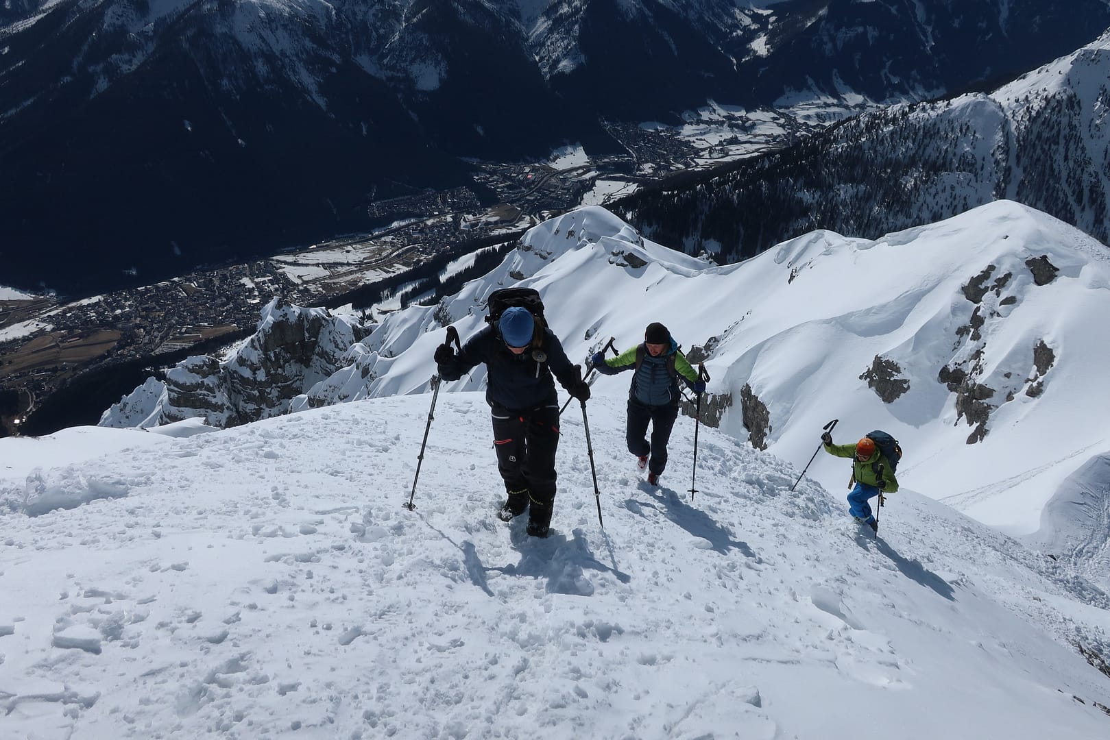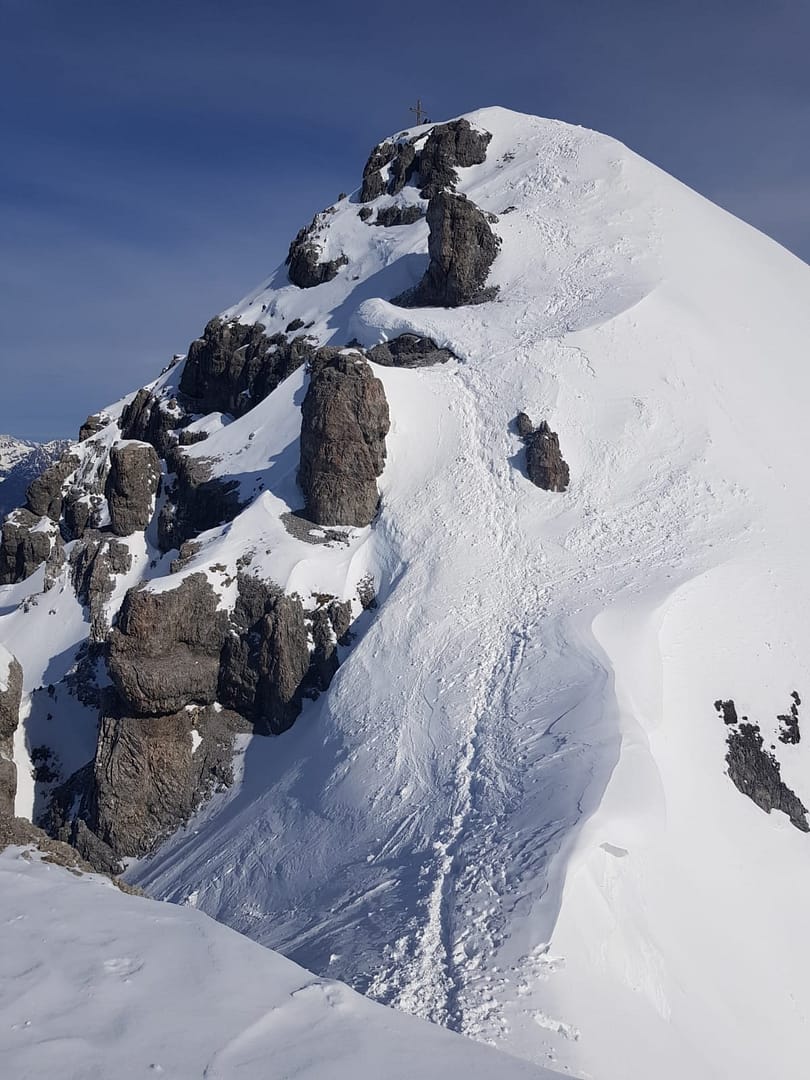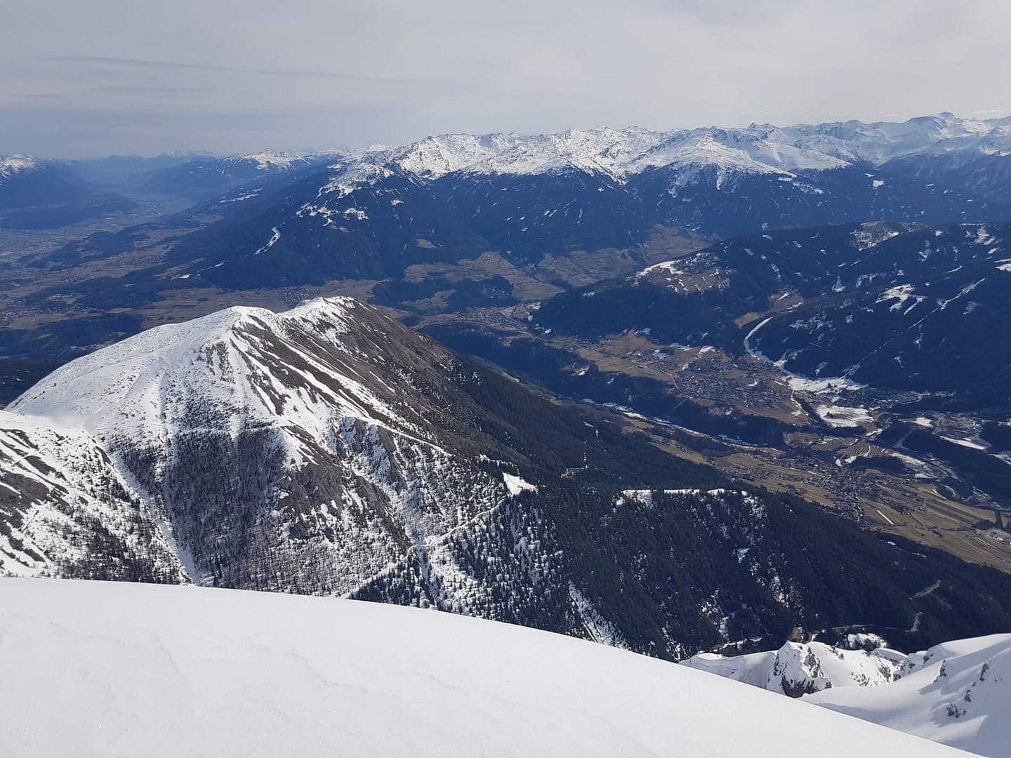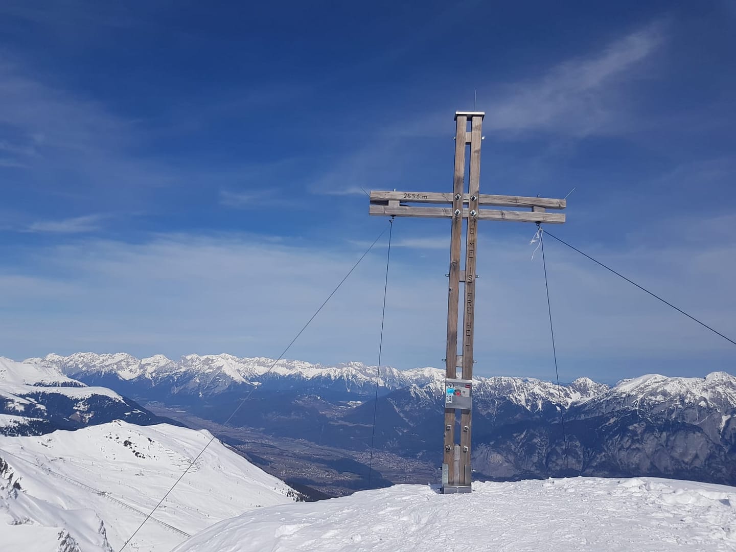 Nach dem Skidepot mussten wir ein paar wenige Meter absteigen, um dann auf der anderen Seite auf der Flanke hoch zum Kreuz zu gelangen. Es war eisig, aber man ist trotzdem gut hoch und wieder runter gekommen. Oben hat man einen sehr tollen 360° Blick auf die umliegenden Berge und ins Inntal.