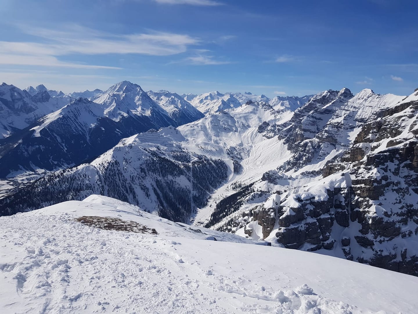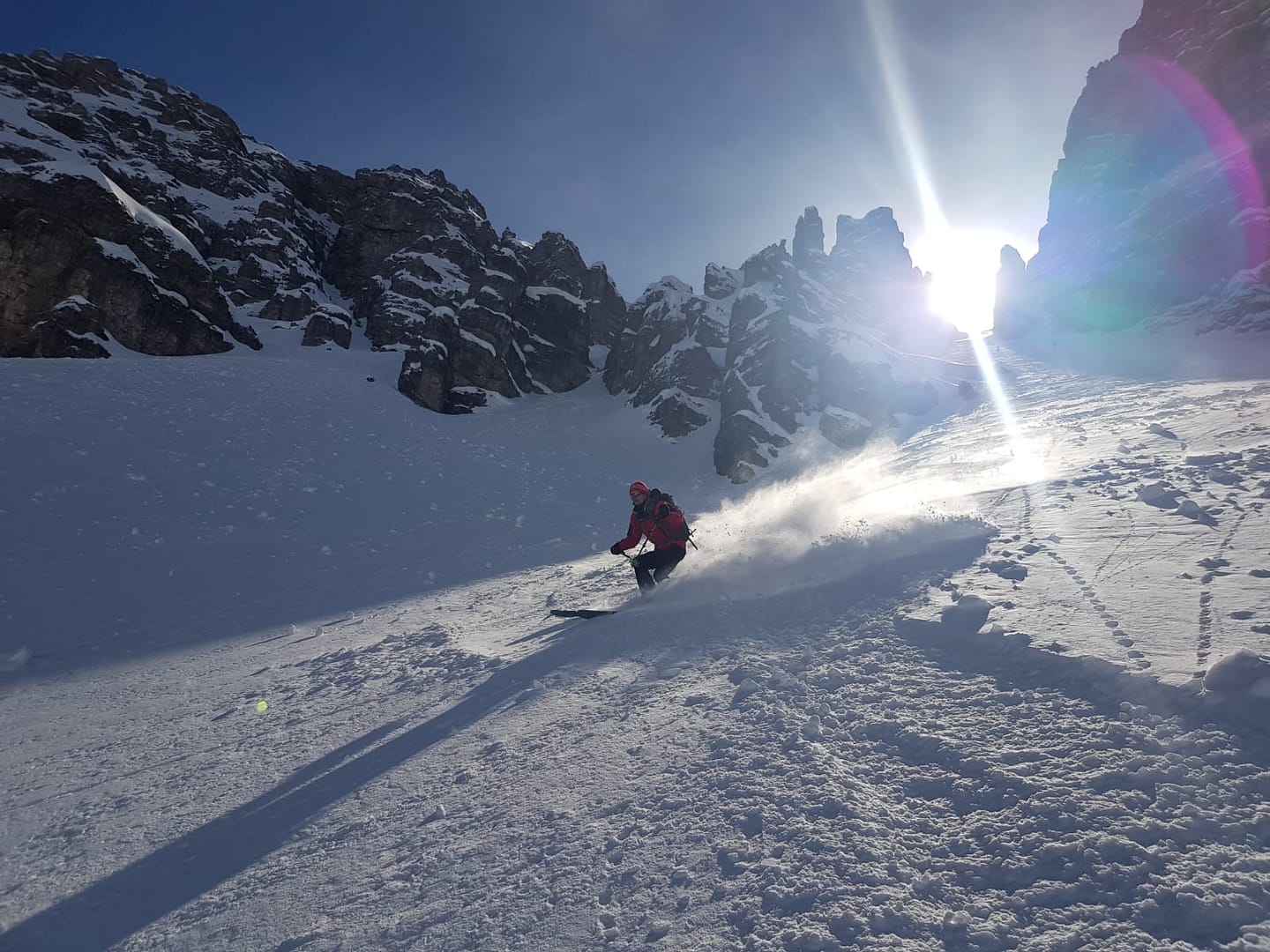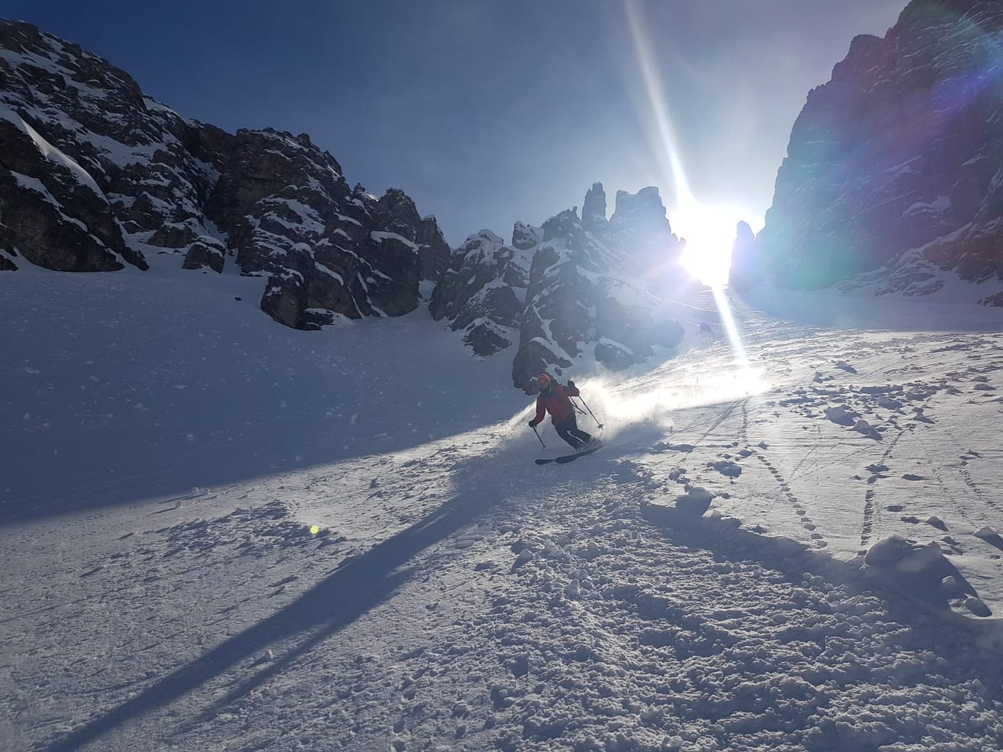 Die Rinne oben war sehr eisig, aber danach haben wir feinsten Powder gefunden, dass der Schnee nur so staubte. Im unteren Teil hatte das Gelände eher pistenähnliche Verhältnisse, zerfahren und buckelig, bis wir dann schlussendlich auf der echten Piste die letzten Meter zurück gelegt haben.