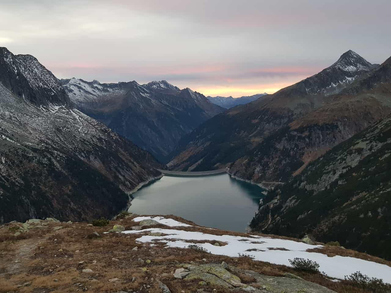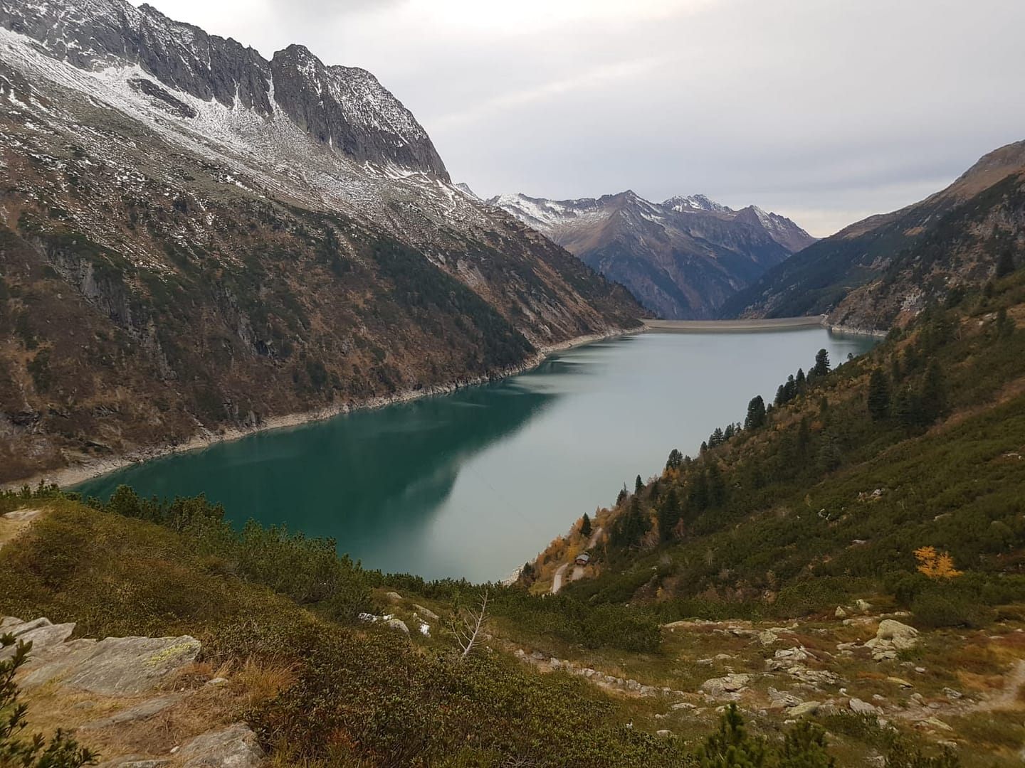 Vom Parkplatz folgen wir dem Wanderweg, halten uns links vom Ziller und steigen im Wald hinauf. nach 1,3 km auf 1.640 m erreichen wir die Fahrstraße, welche wir kurz folgen und biegen schließlich links in den Wald zurück ab. Auf halben Wege sehen wir ein Steinbockgehege, dass wir rechts liegen lassen und gehen weiter bis zum Gasthof Adlerblick. Hier auf der Staumauer angekommen hat man einen tollen Blick auf den Speichersee.