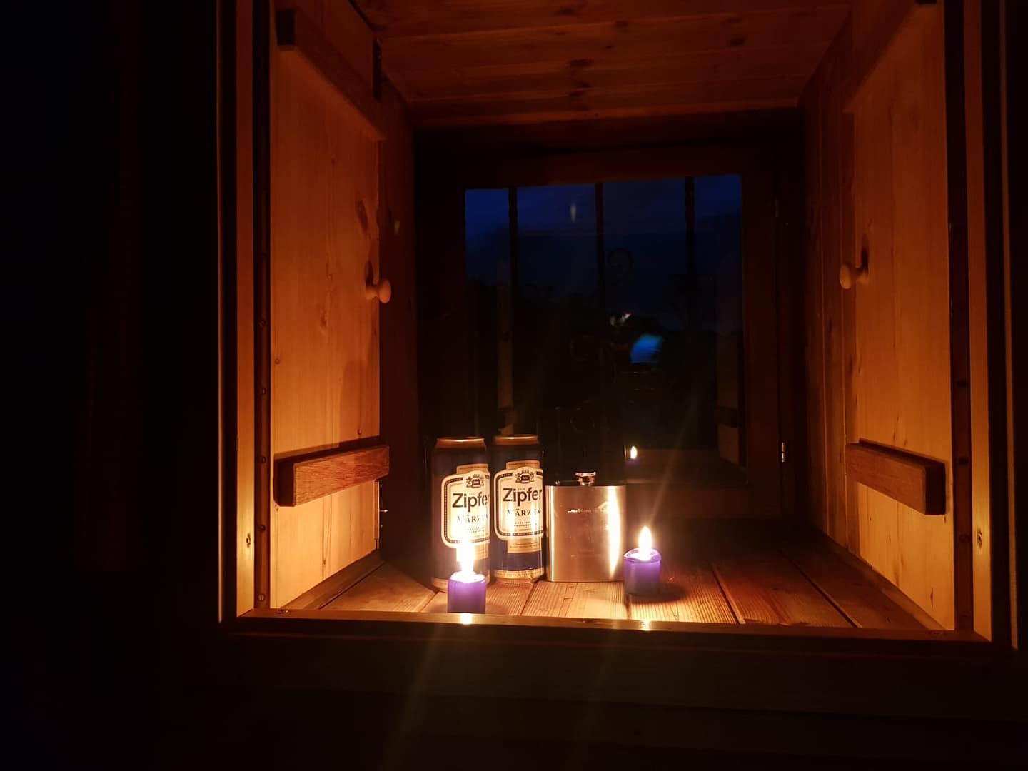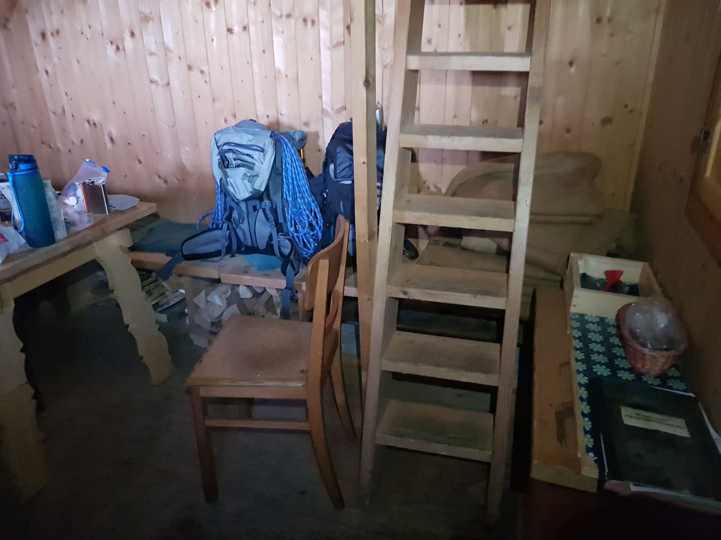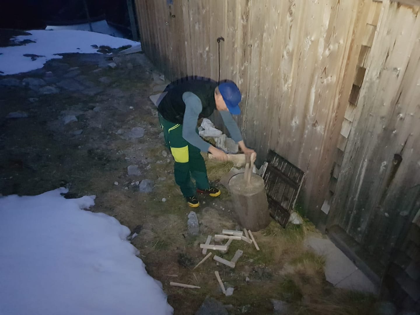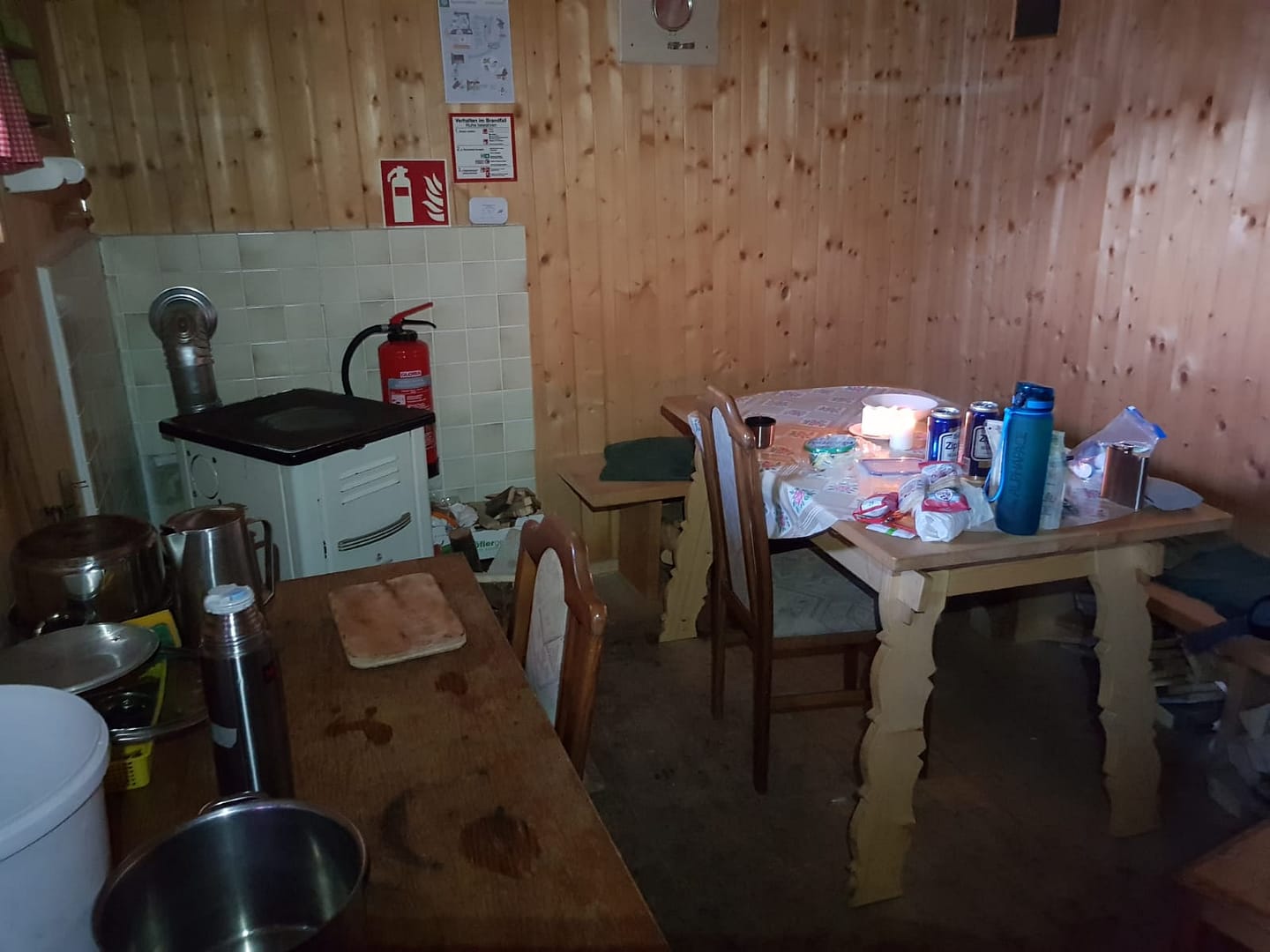 Der Winterraum der Plauener Hütte ist klein aber oho, gemütlich und romantisch – es ist alles da: Gemütliche Sitzecke, kleiner Ofen, Töpfe, Teller, Besteck, Tassen und Gläser. Oben gibt es Schlafplätze für ca. 5 Personen, aber es wird kuschelig. Damit wir den Ofen anfeuern konnten habe wir erst einmal kleine Holzstückchen gehackt, leider waren die meisten Holzscheite zu lang und haben nicht in den Ofen gepasst. Links oberhalb der Hütte gibt es einen Bach, wo man Wasser holen kann. Kerzen / Licht sollte nicht vergessen werden.