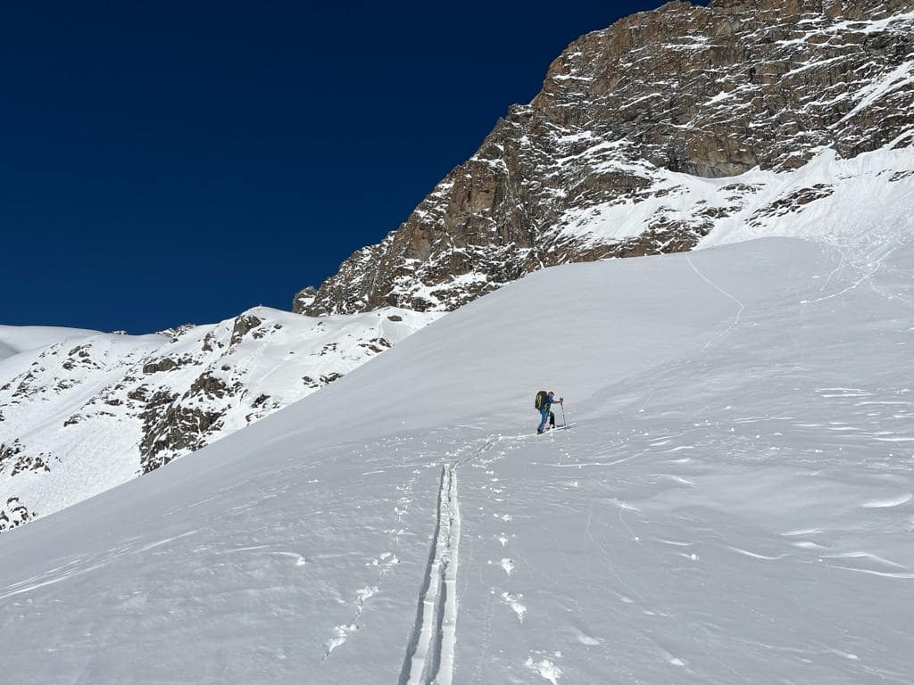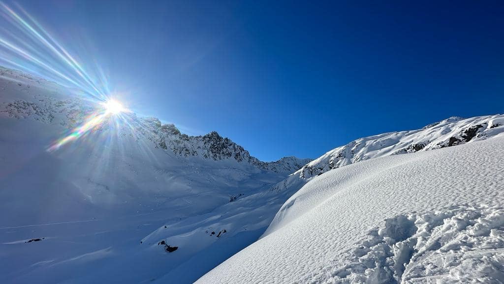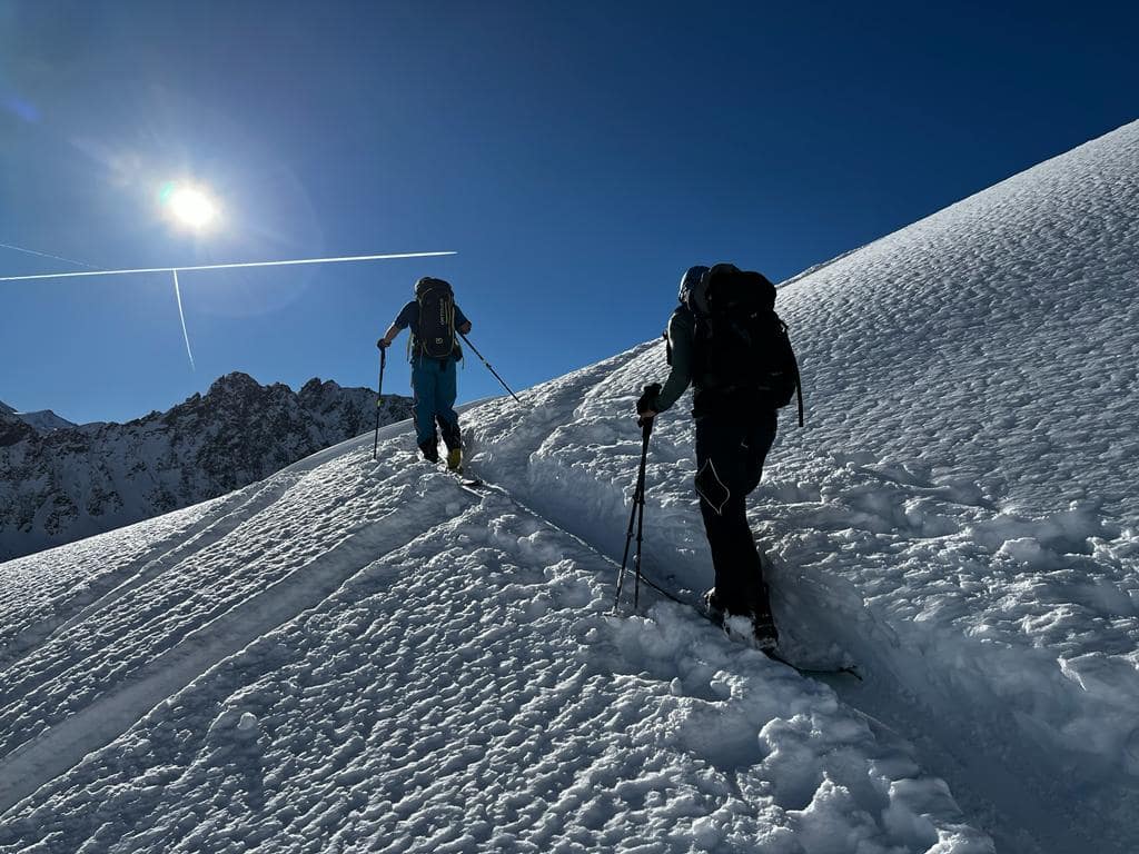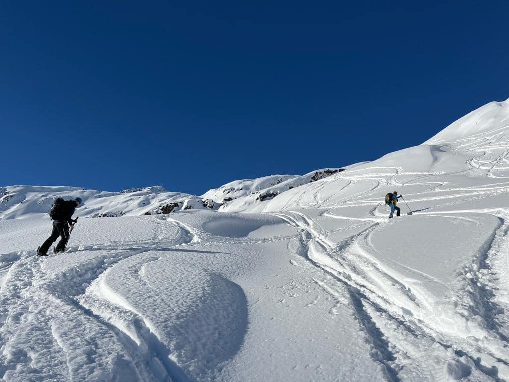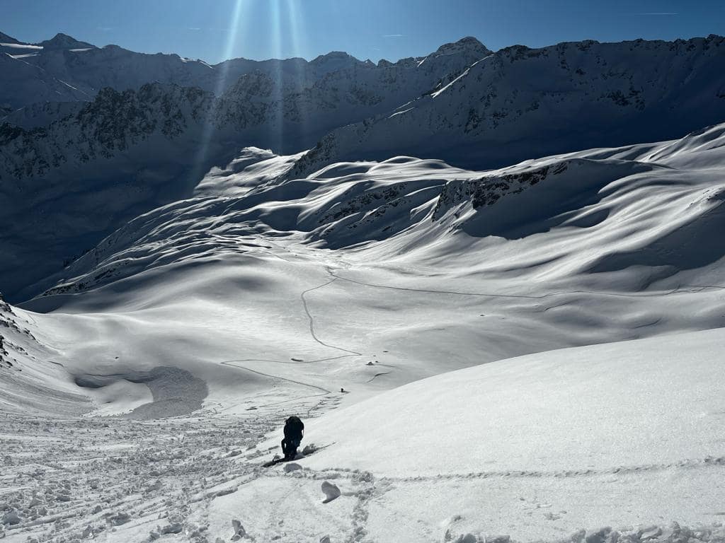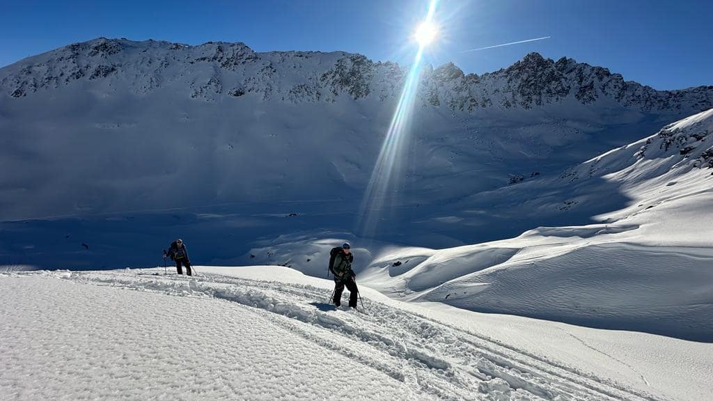 An dieser Stelle steht die Entscheidung an: entweder weiter auf den bereits erklommenen K2 oder auf einen neuen, unbekannten Gipfel dem Rostizkogel. Obwohl die Lawinenstufe theoretisch von 3 auf 2 gesunken war, zeigte die praktische Situation eine andere Dynamik. Die Gruppe entschied sich, dem steilen Hang unterhalb des Seekogels eine Chance zu geben. Der Schnee rutschte wiederholt von den Felsen oberhalb herab, was anfangs keine große Abschreckung darstellte. Erst als ein Schneebrett in unmittelbarer Nähe abging, wurde die Tour abgebrochen.