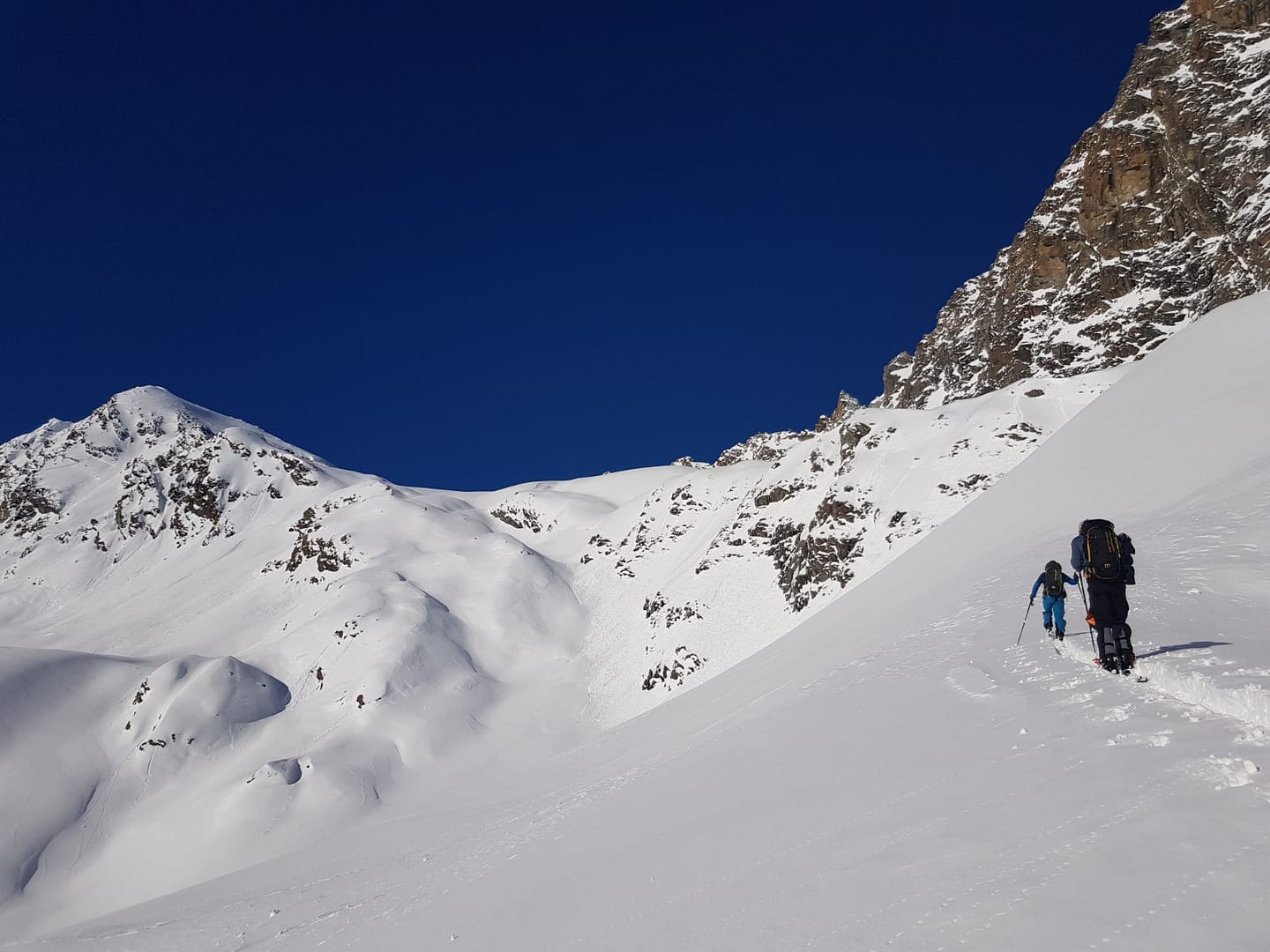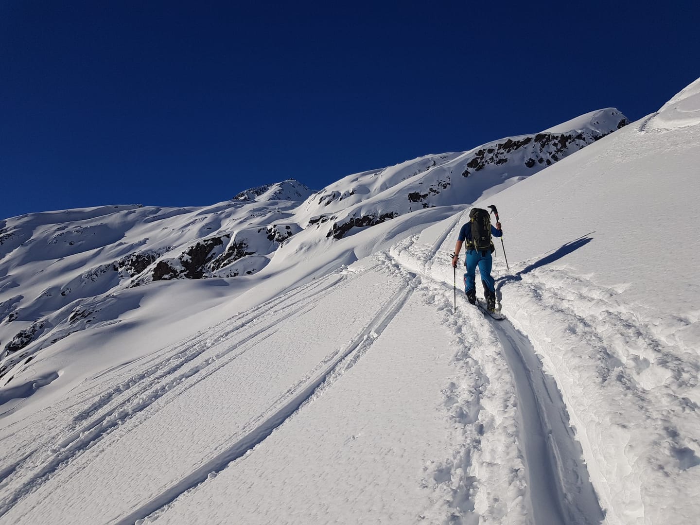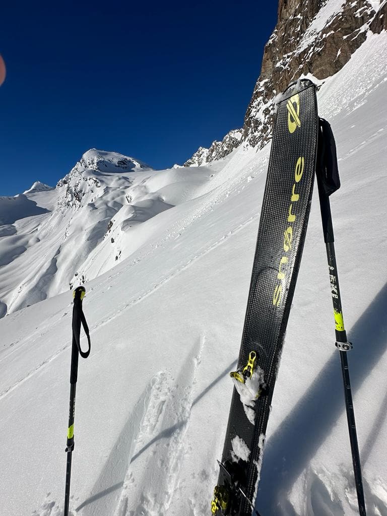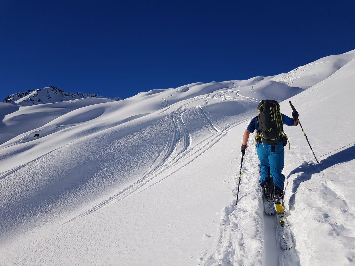 - Skitourenausrüstung: LVS, Sonde, Schaufel, Stöcke, Felle, evtl. Harscheisen