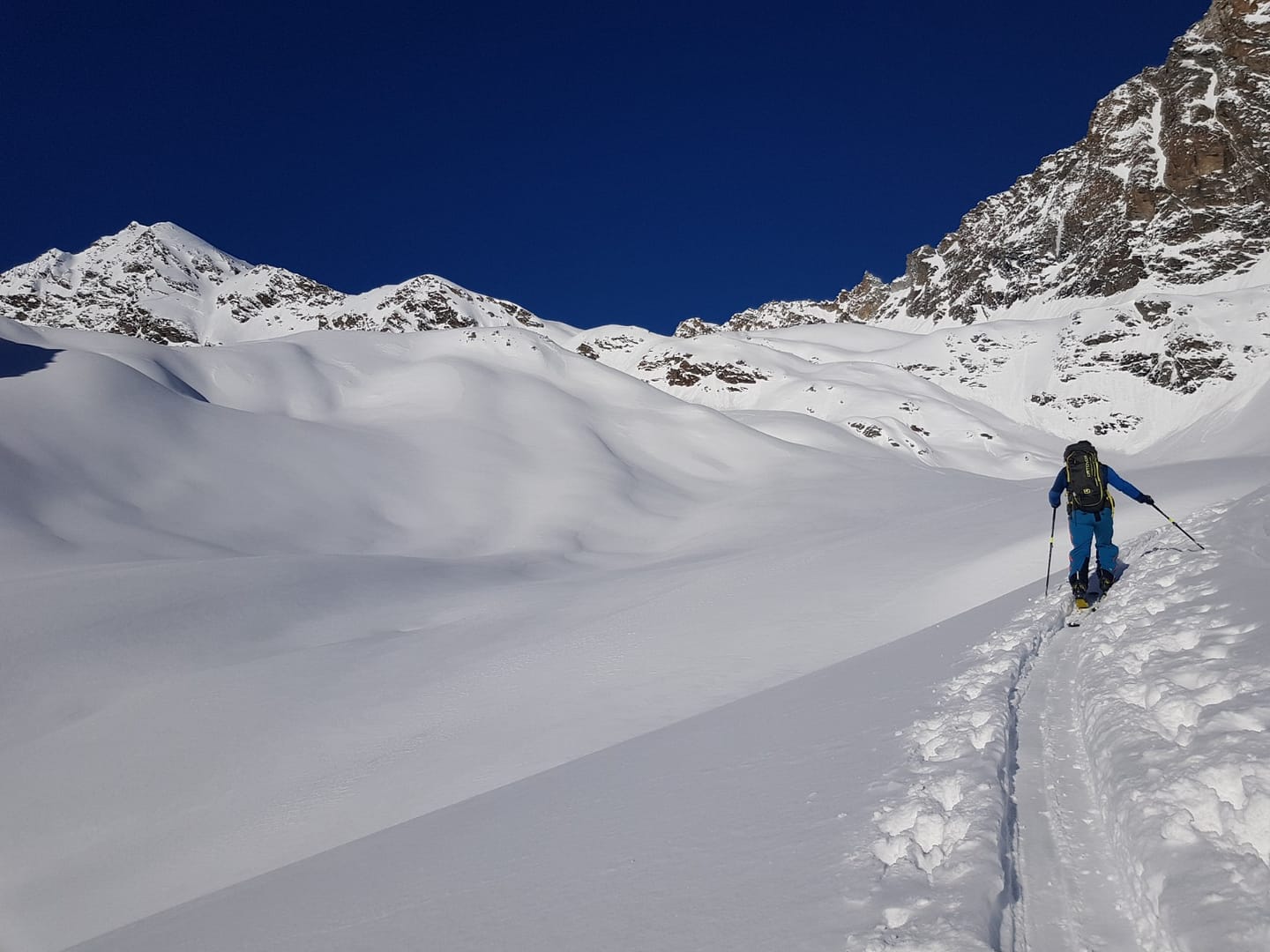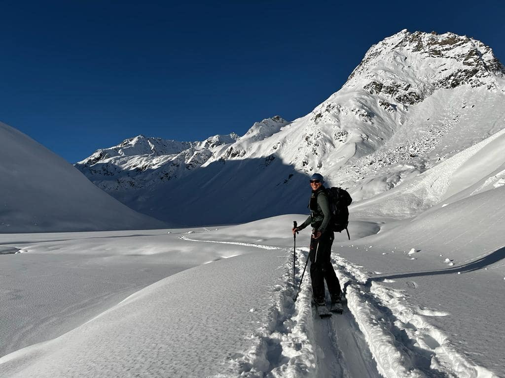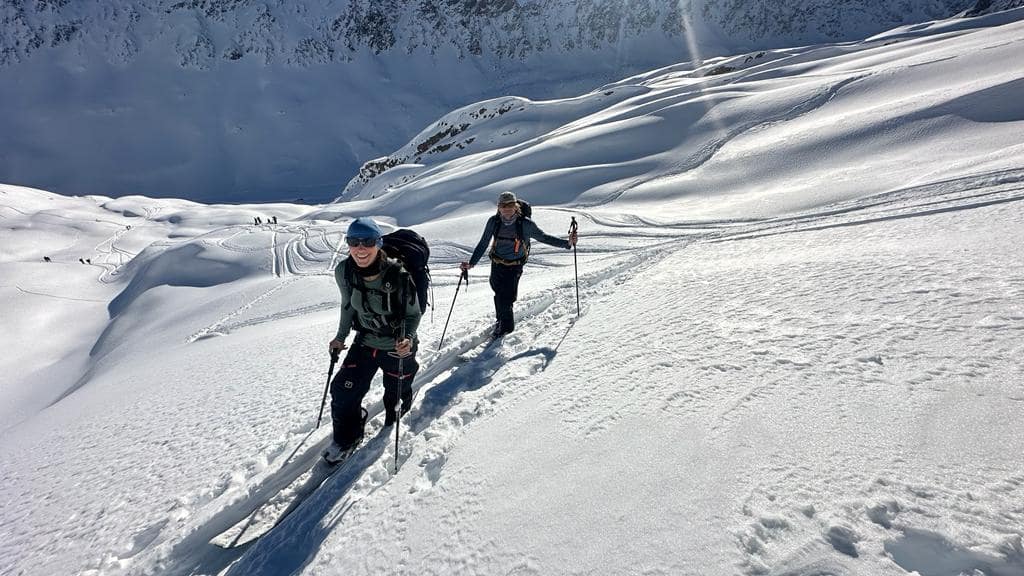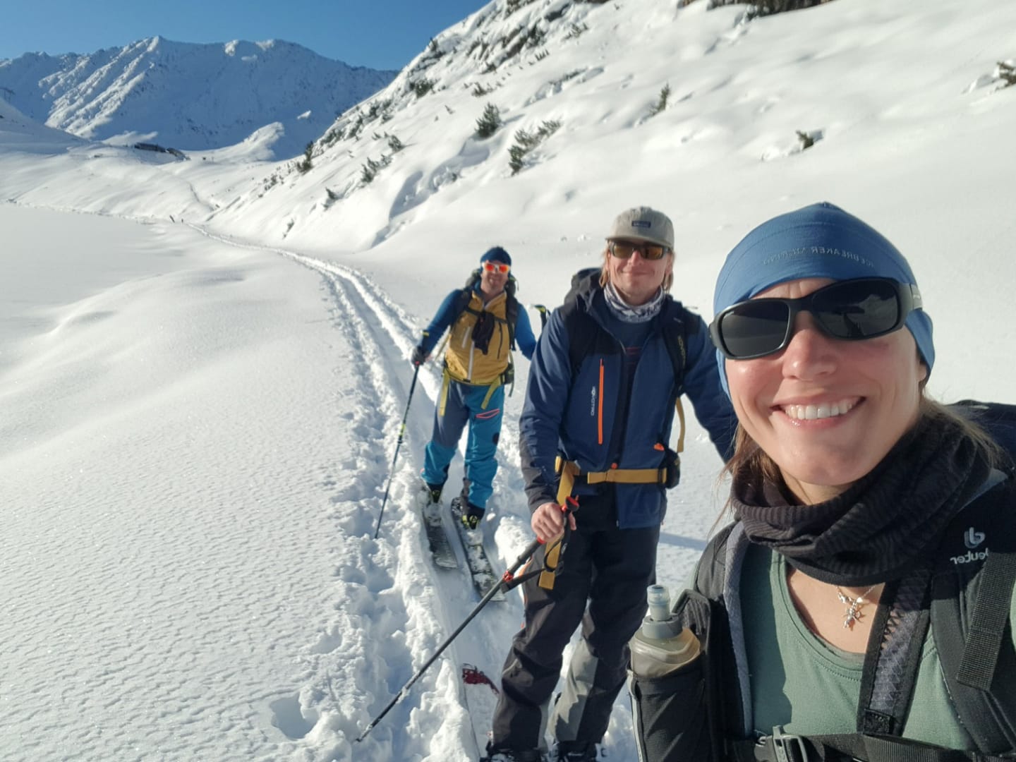 - Skitourenausrüstung: LVS, Sonde, Schaufel, Stöcke, Felle, evtl. Harscheisen