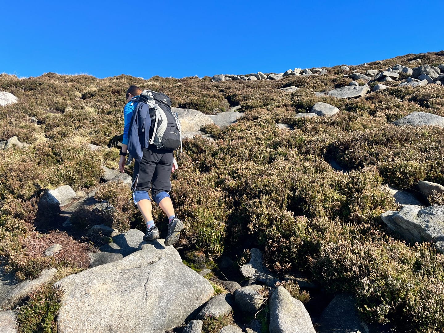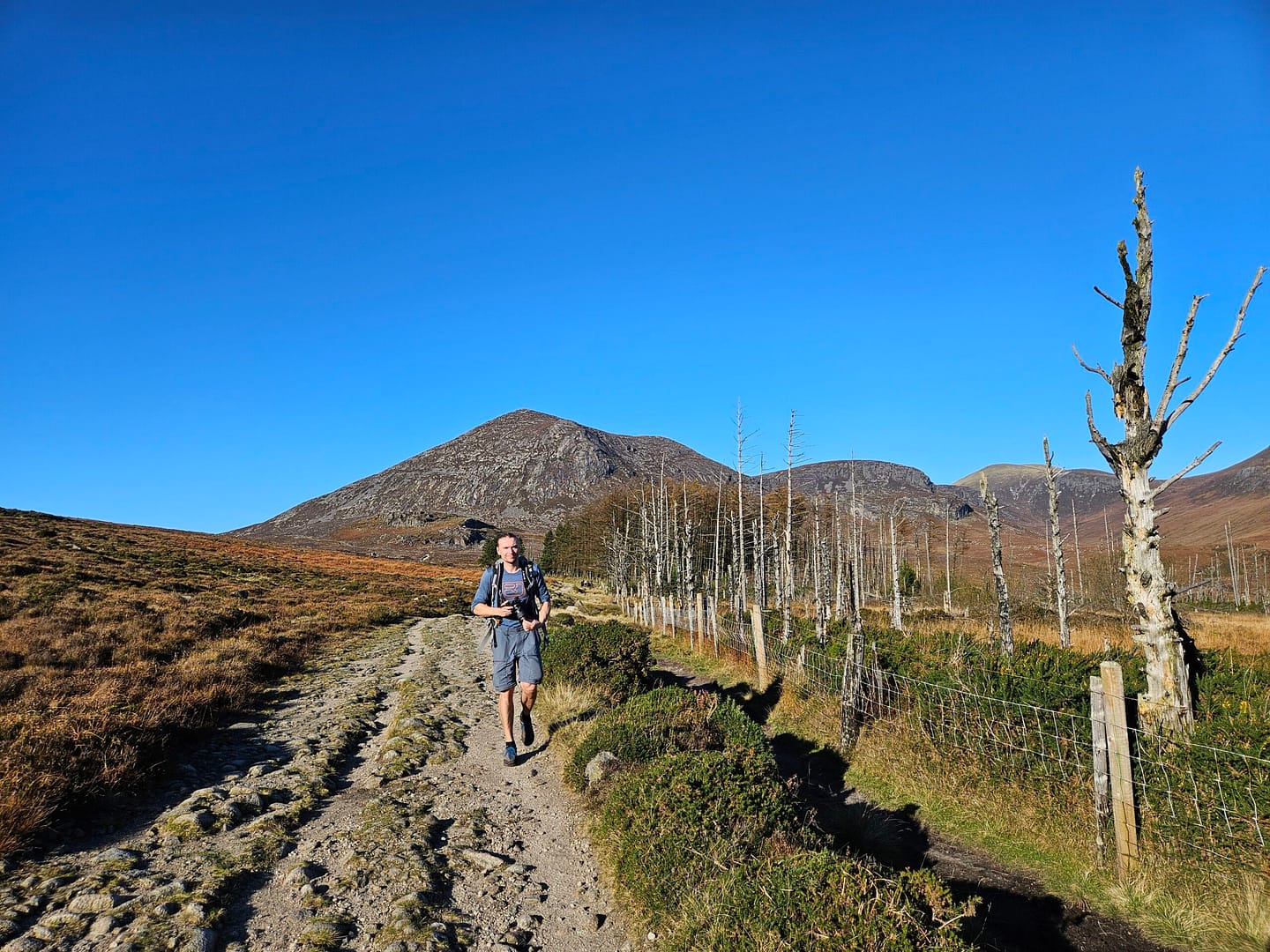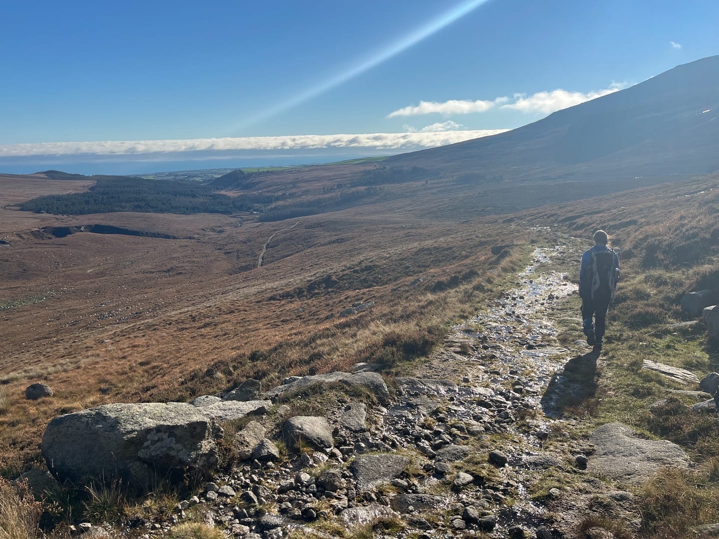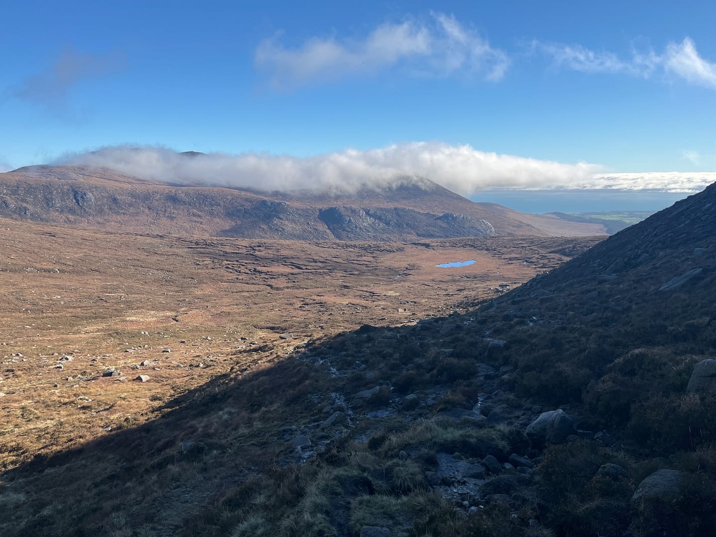 Vom Gipfel aus wanderten wir nach Norden zum Slieve Binnian North Tor und stiegen anschließend auf etwa 390 m ab. Doch lange blieben wir nicht unten – direkt auf der gegenüberliegenden Seite ging es wieder steil, teils weglos, hinauf: nächste Station, Slievelamagan, 702 Meter hoch. Wir überschritten den Gipfel und stiegen auf der anderen Seite wieder ab. Auf etwa 550 Metern erreichten wir eine Abzweigung, die wir nach rechts nahmen. Der Weg schlängelte sich in einem weiten Bogen zurück Richtung Ausgangspunkt.