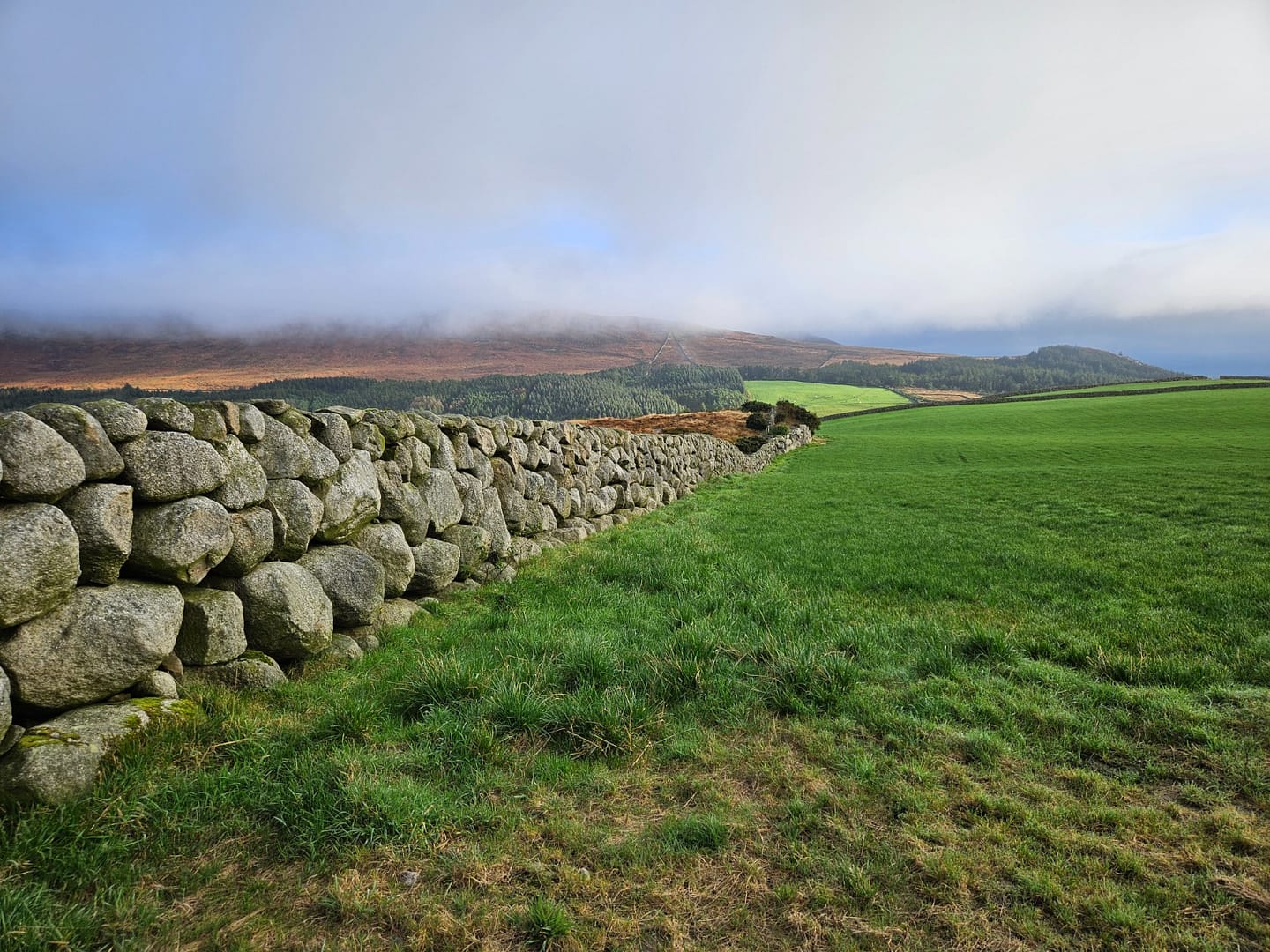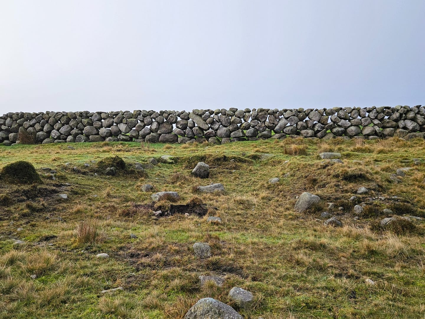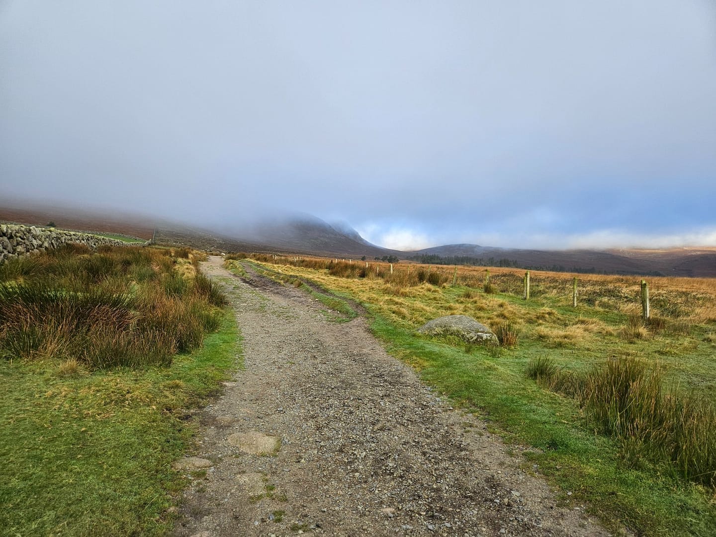 Unsere Wanderung begann beim Carrick Little Glamping Car Park. Die ersten rund 700 Meter führten uns noch gemächlich über Asphalt, ehe der Weg in eine Forststraße überging. Nach weiteren 400 Metern zweigten wir links ab und folgten einem zunehmend steinigen Pfad – stets begleitet von der Mourne Wall, einer über 35 Kilometer langen Trockensteinmauer, die sich durch die Berge schlängelt wie ein stummer Chronist der Zeit. Zunächst ging es durch Heide und Wiesen, dann wurde das Gelände felsiger. Mit jedem Höhenmeter wuchs die Dramatik der Landschaft. Je näher man dem Gipfel kam, desto eindrucksvoller das Schauspiel aus Granit, Nebel und Licht.