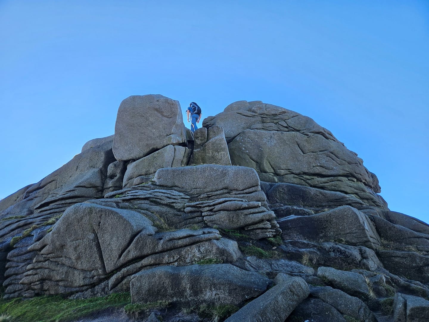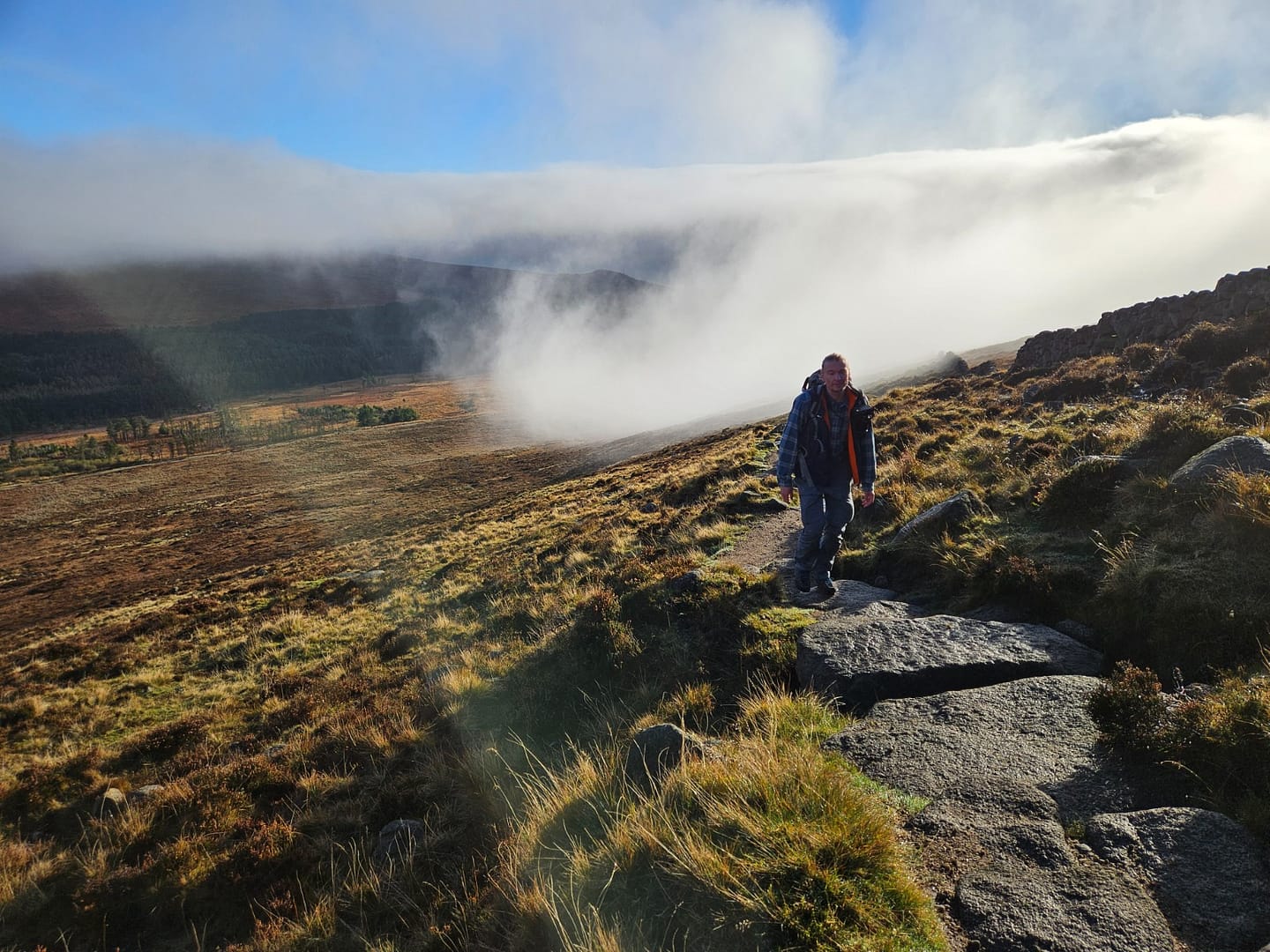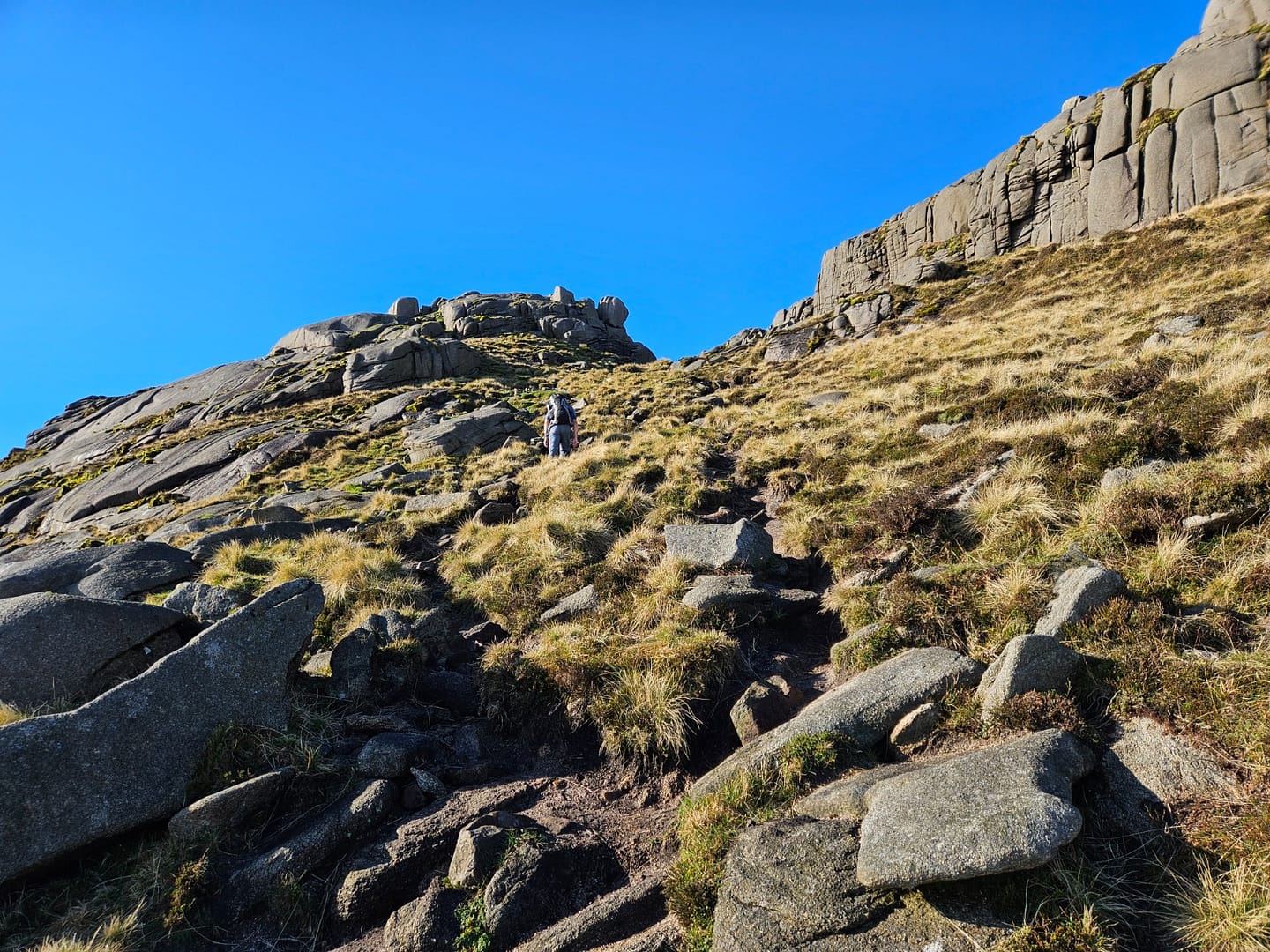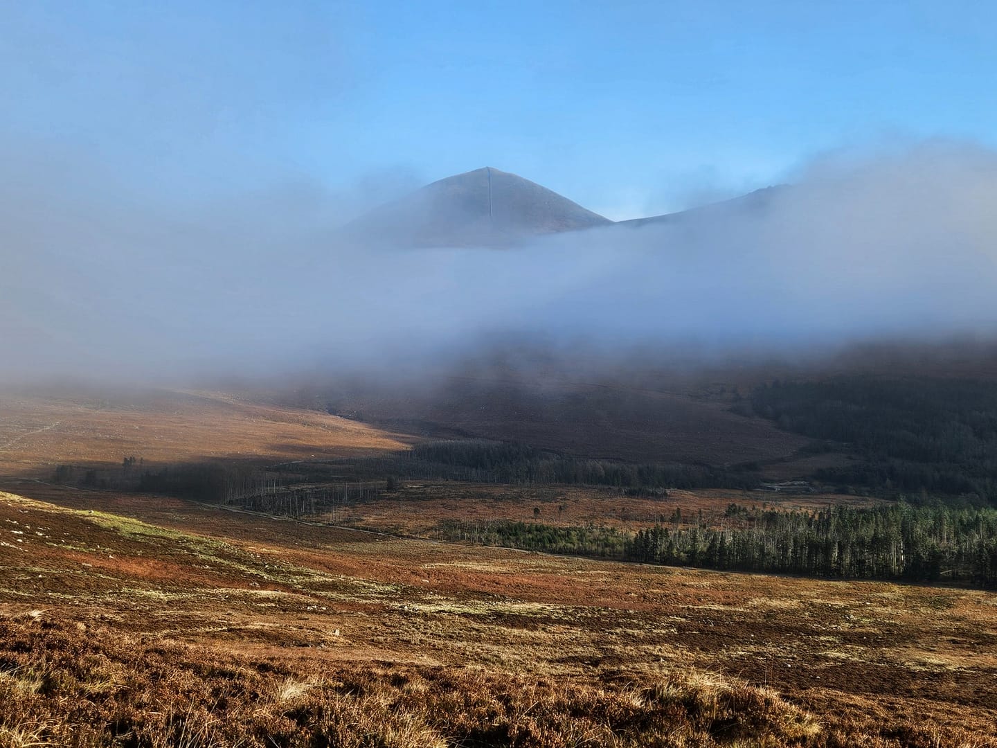 Unsere Wanderung begann beim Carrick Little Glamping Car Park. Die ersten rund 700 Meter führten uns noch gemächlich über Asphalt, ehe der Weg in eine Forststraße überging. Nach weiteren 400 Metern zweigten wir links ab und folgten einem zunehmend steinigen Pfad – stets begleitet von der Mourne Wall, einer über 35 Kilometer langen Trockensteinmauer, die sich durch die Berge schlängelt wie ein stummer Chronist der Zeit. Zunächst ging es durch Heide und Wiesen, dann wurde das Gelände felsiger. Mit jedem Höhenmeter wuchs die Dramatik der Landschaft. Je näher man dem Gipfel kam, desto eindrucksvoller das Schauspiel aus Granit, Nebel und Licht.