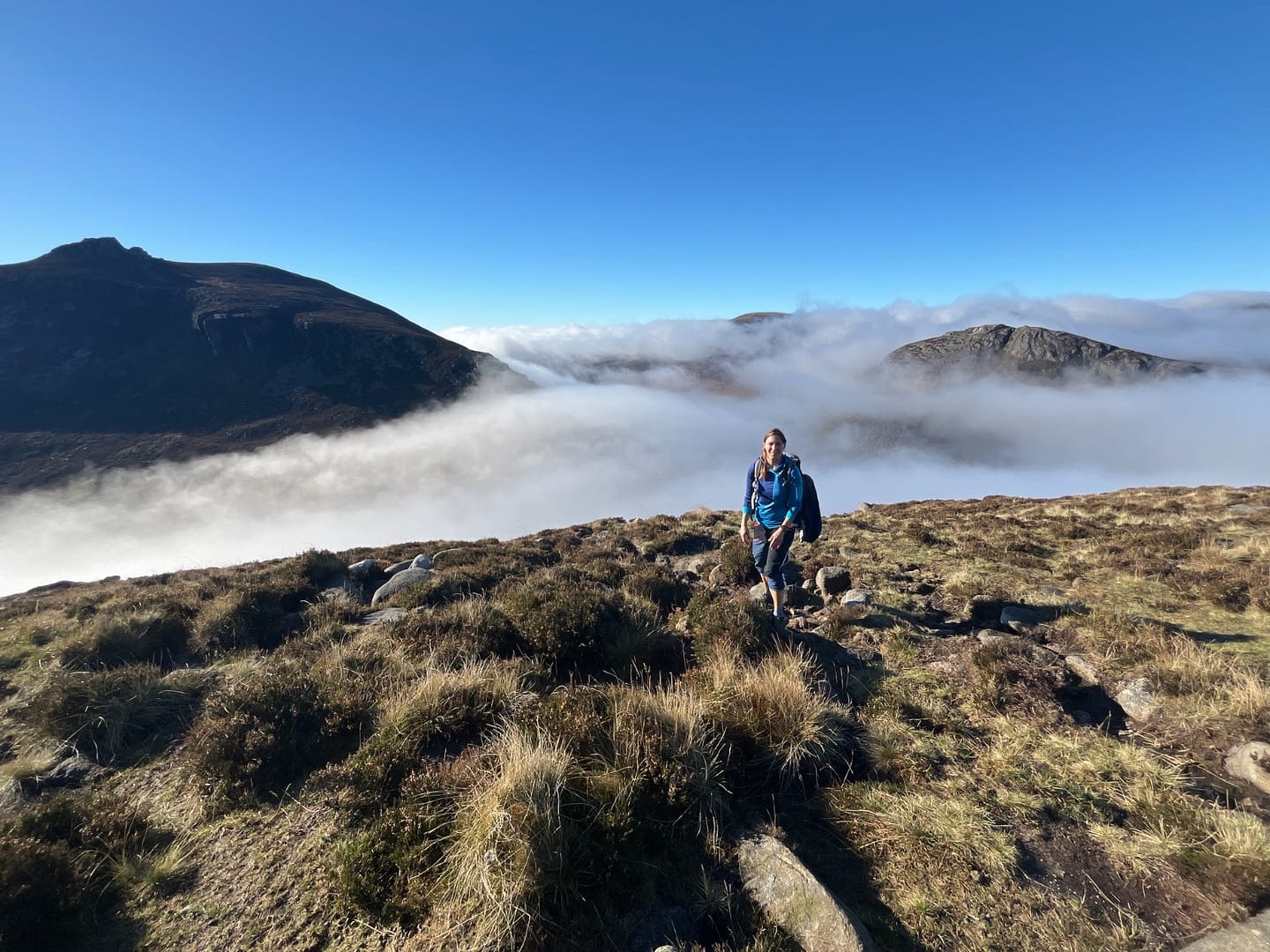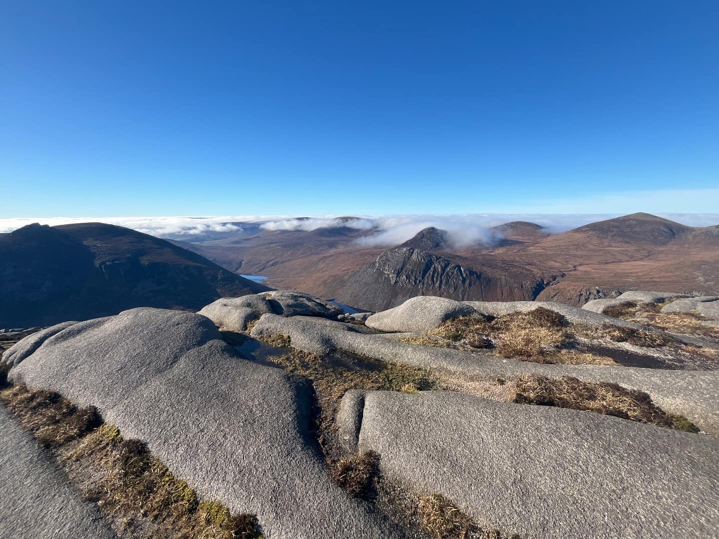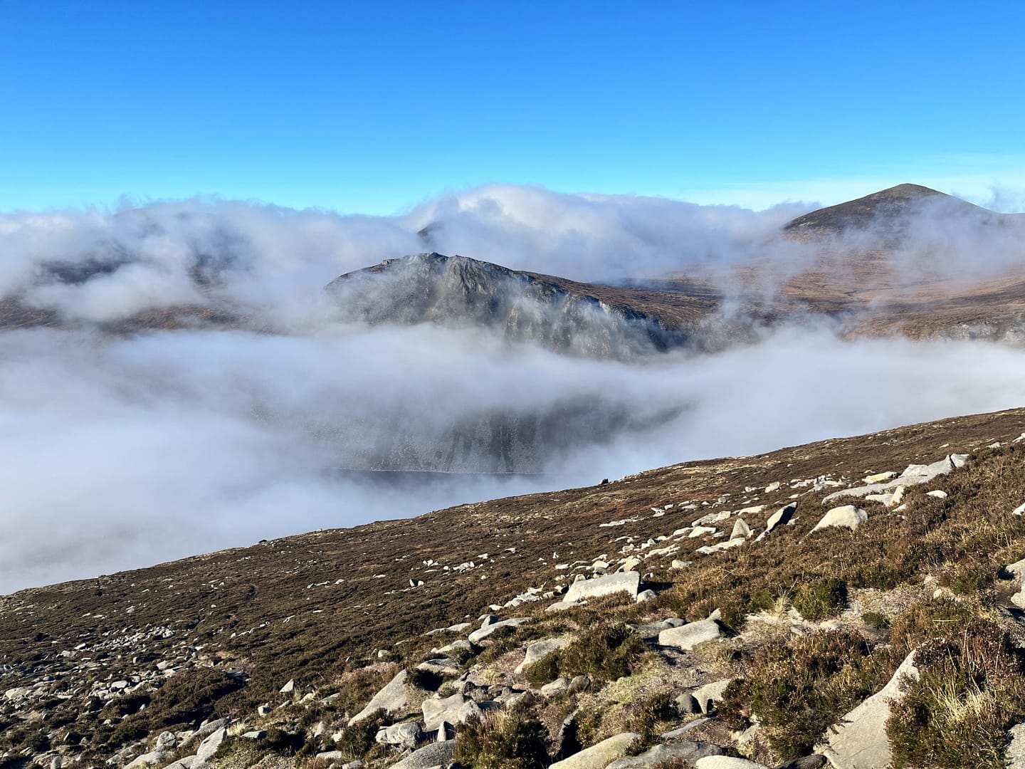 Am Gipfel des Slieve Binnian angekommen, hätte uns theoretisch ein Panorama bis zur Irischen See und über das Silent Valley Reservoir – doch stattdessen standen wir über den Wolken, blickten hinab auf ein endloses Wolkenmeer wo die umliegenden Mourne-Gipfel heraus stachen.