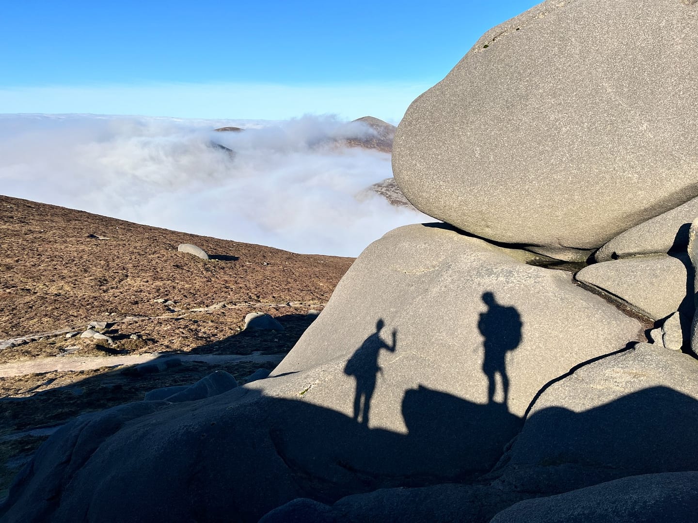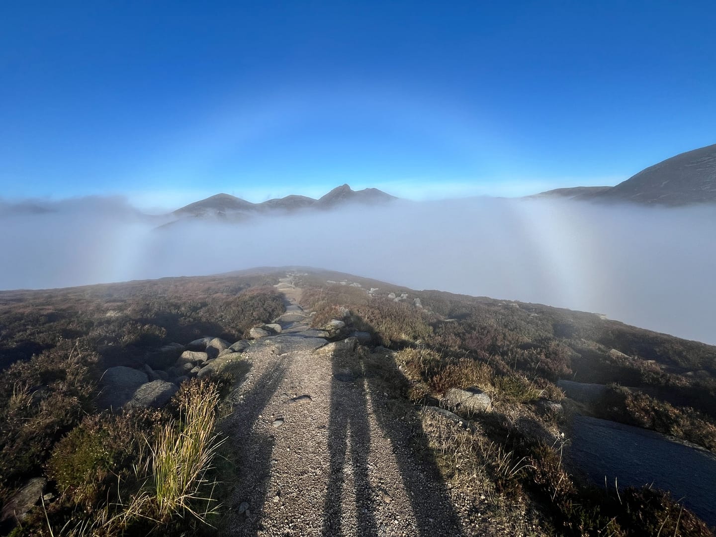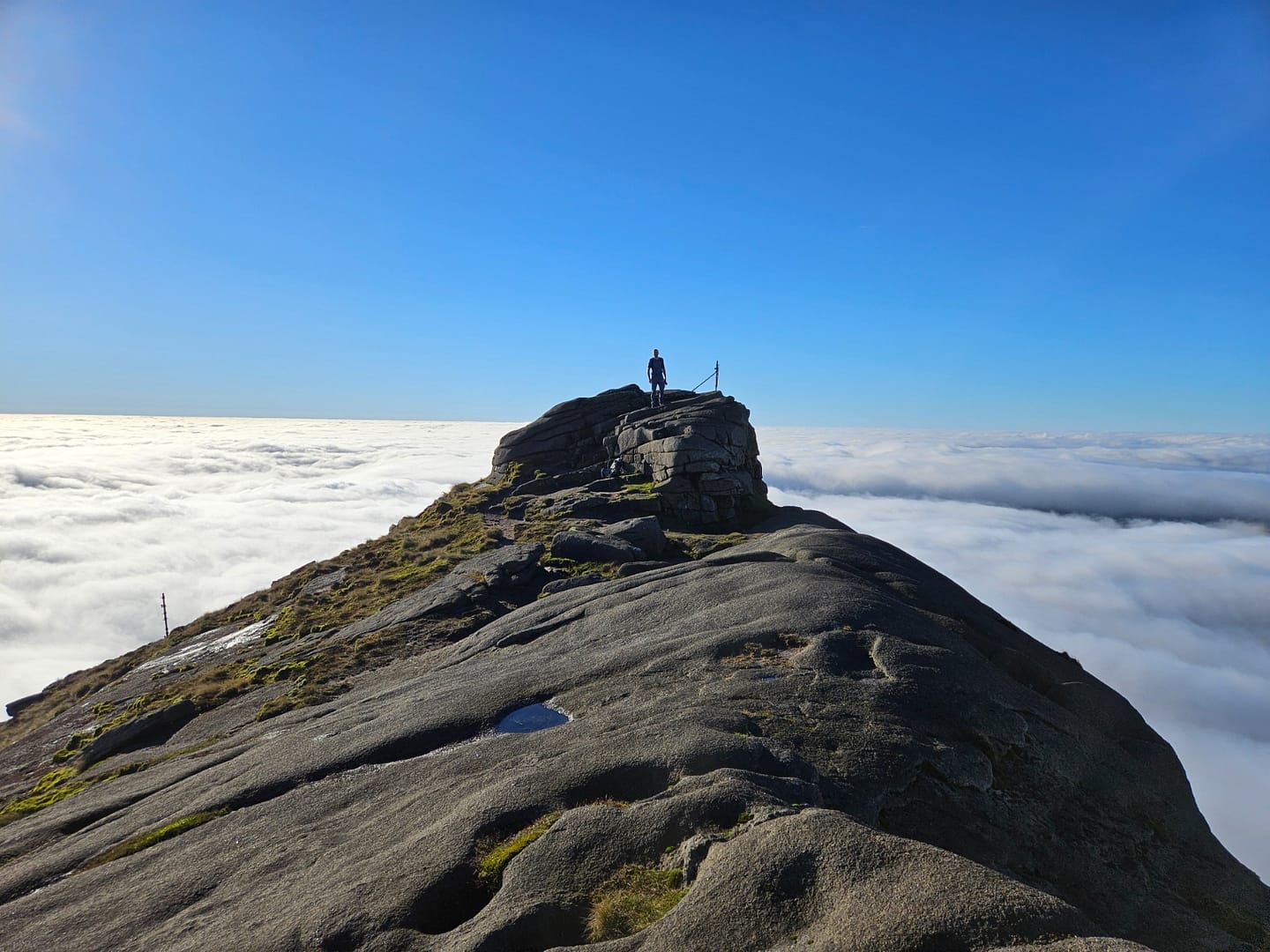 Am Gipfel des Slieve Binnian angekommen, hätte uns theoretisch ein Panorama bis zur Irischen See und über das Silent Valley Reservoir – doch stattdessen standen wir über den Wolken, blickten hinab auf ein endloses Wolkenmeer wo die umliegenden Mourne-Gipfel heraus stachen.