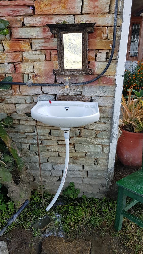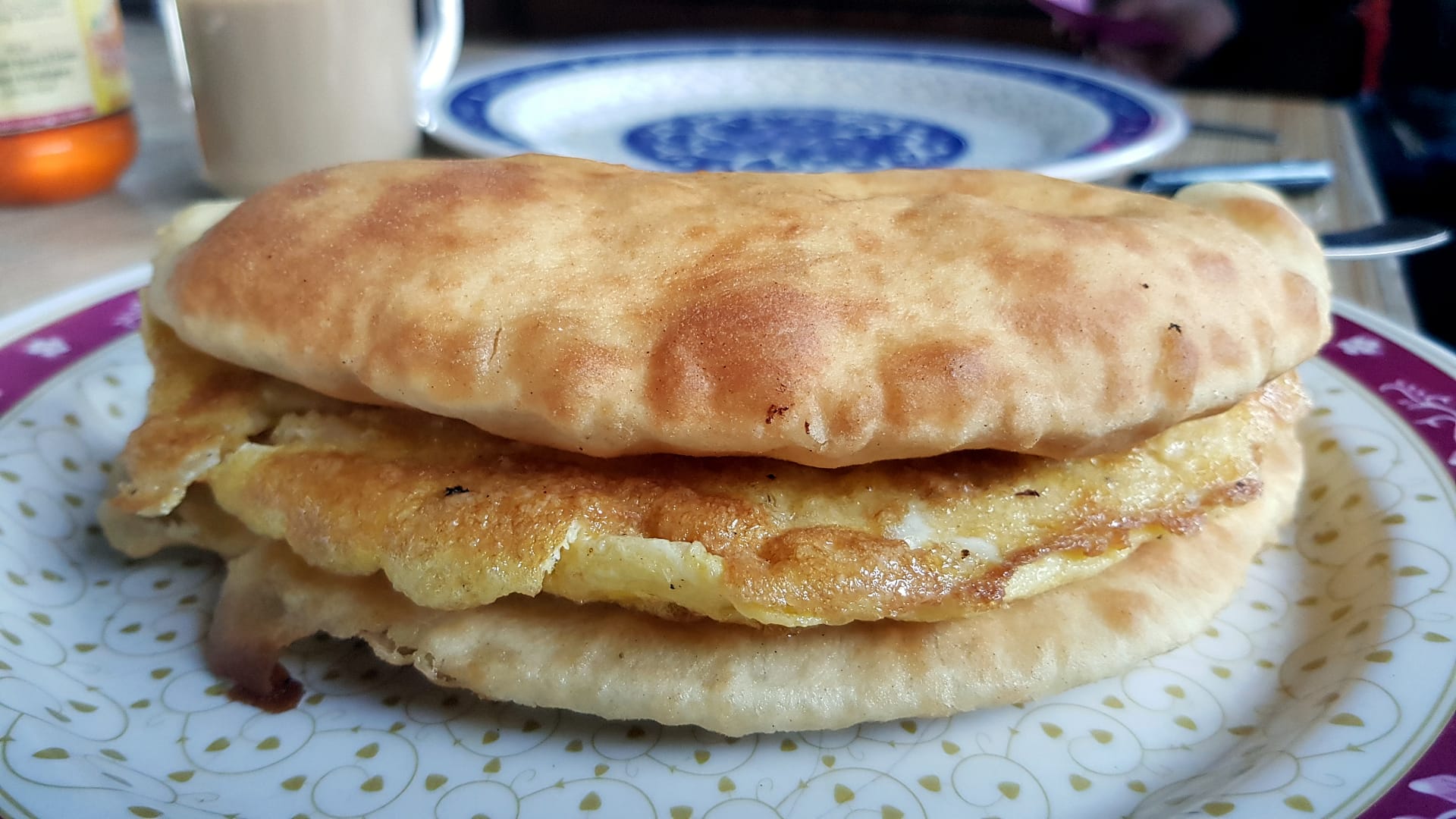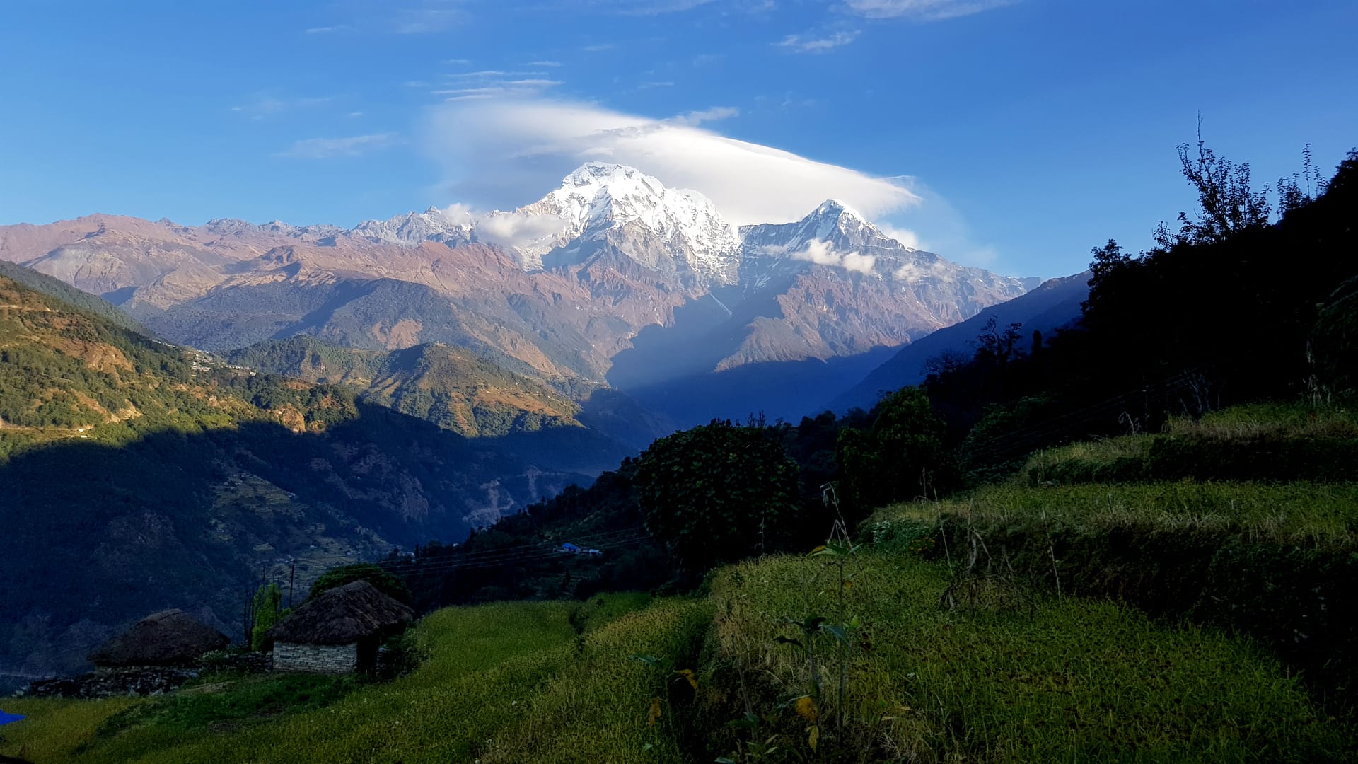 Auf unserer Reise sind uns Touristen begegnet, die uns eine Köstlichkeit näher gebracht hatten: Knoblauch-Omlett im tibetanisches Brot. Das kann ich wirklich wärmstens weiterempfehlen! Dies gönnten wir uns an unserem letzen Morgen in den Bergen. Es war wie immer ein schöner & sonniger Morgen mit einem letzten Blick auf den Annapurna Gipfel.