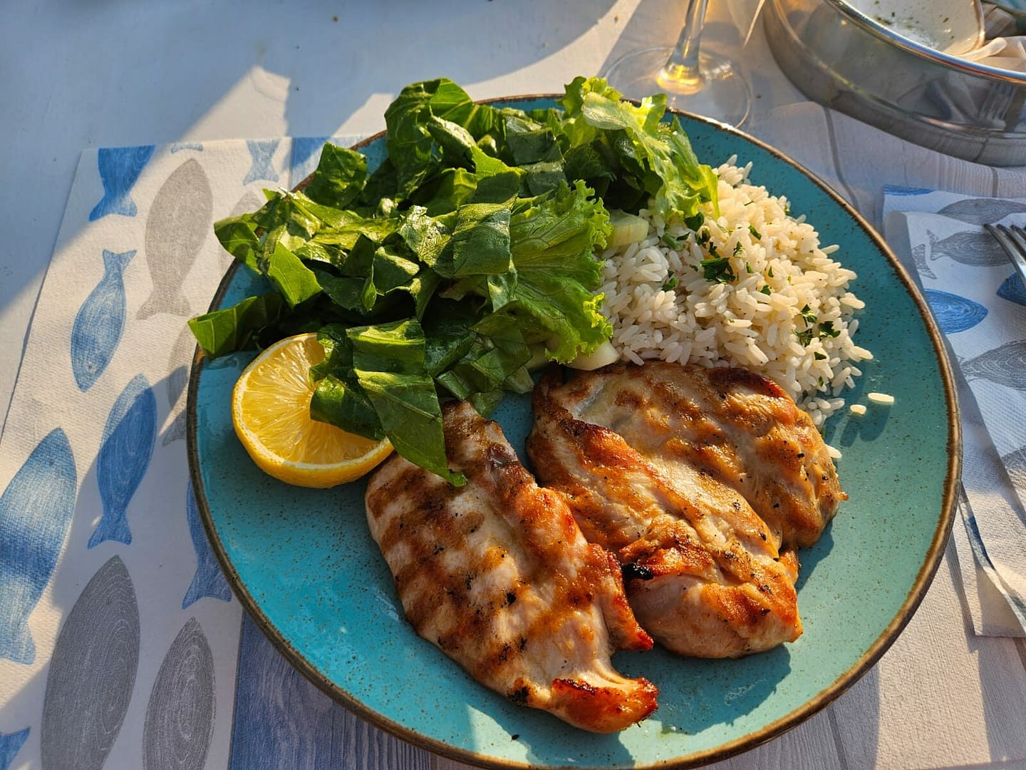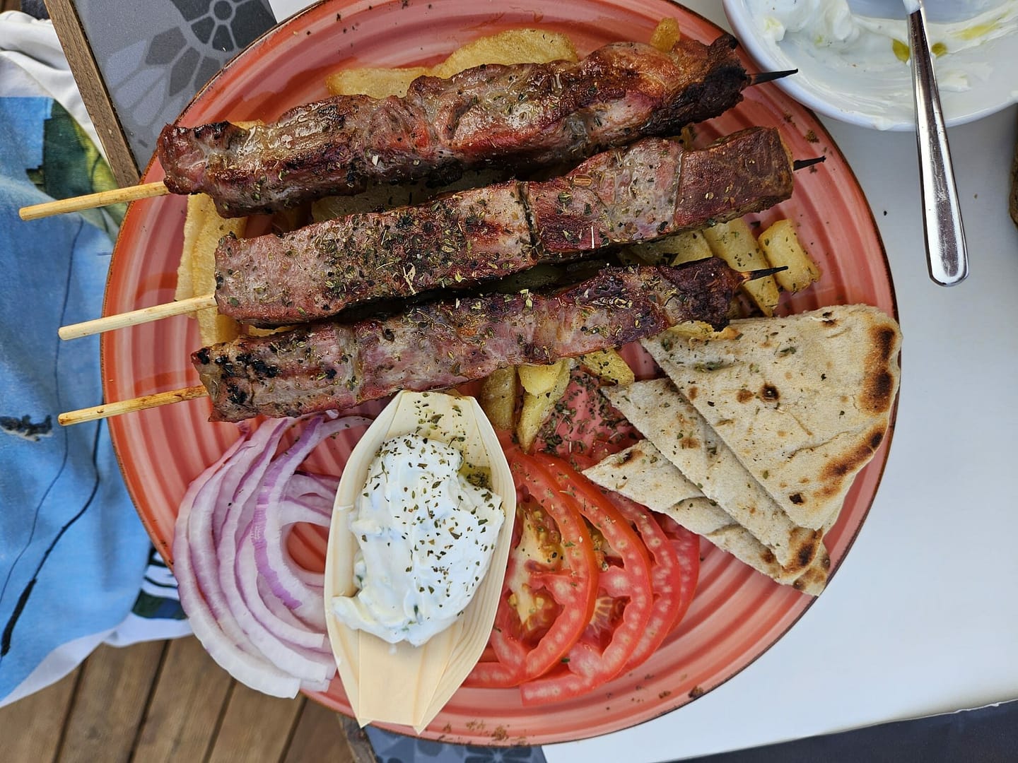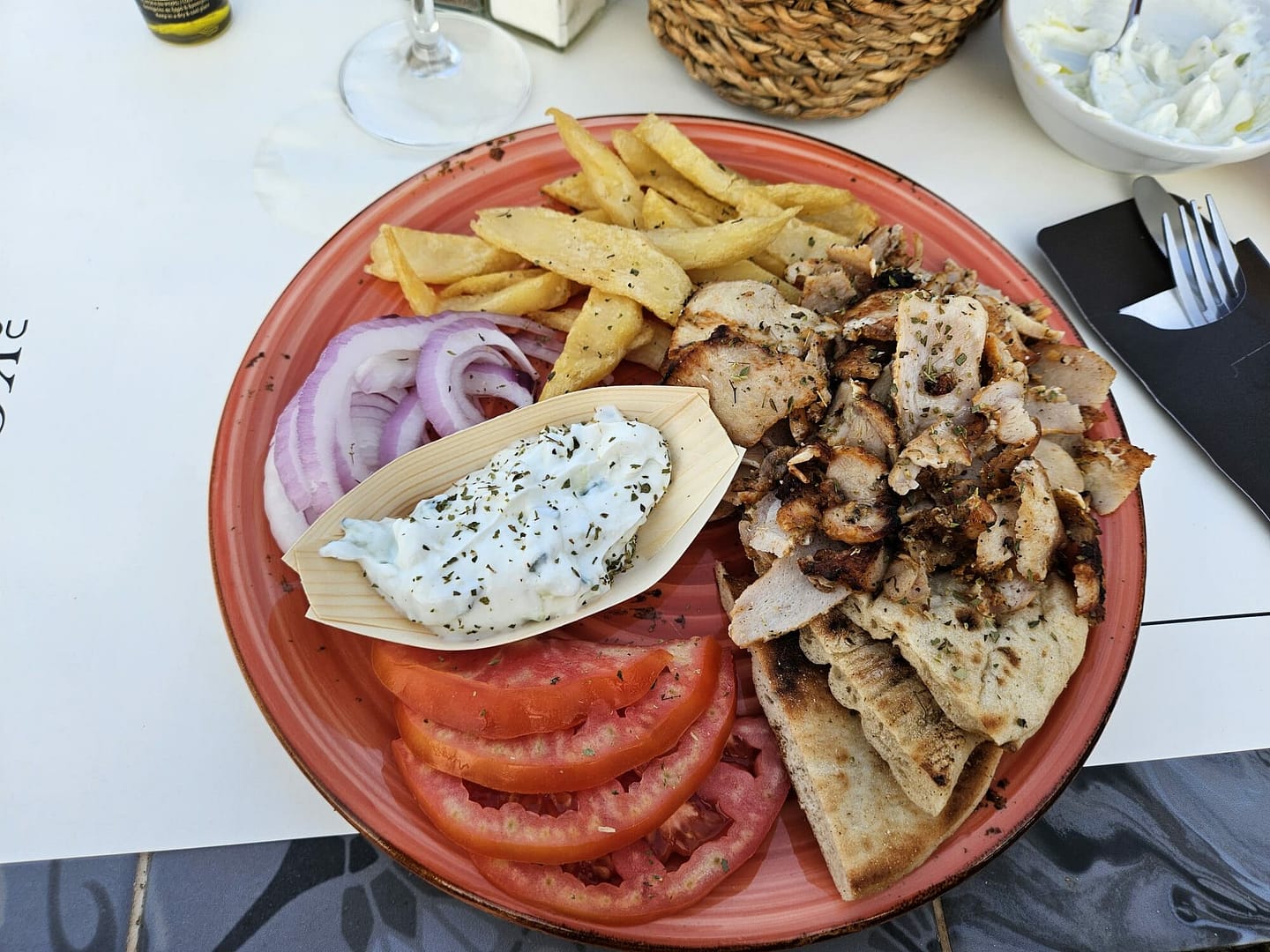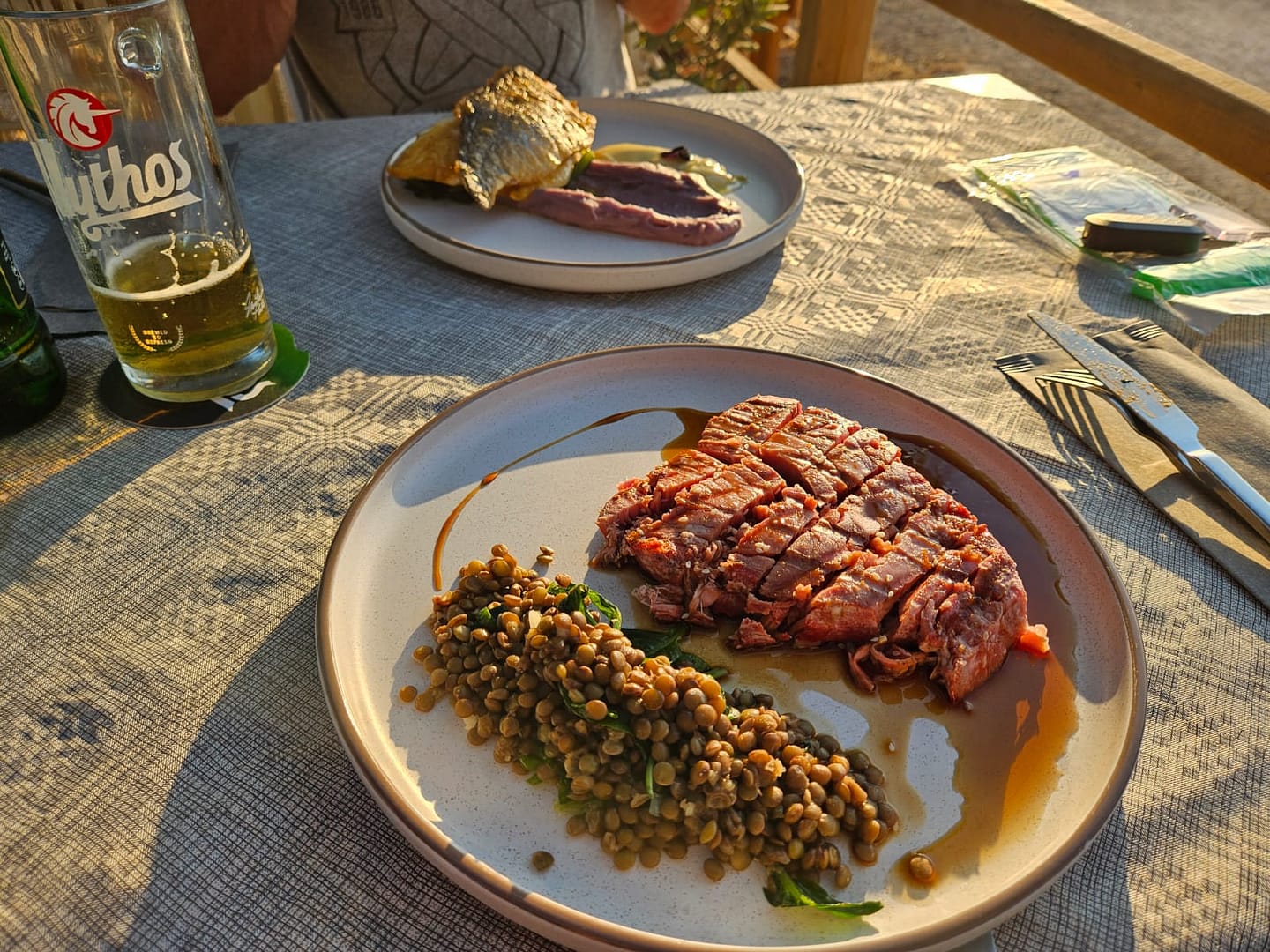 Auch dieses Restaurant war ein echter Genuss, mit einer traumhaften Lage direkt am Meer, wo einige Wellen sanft bis zu unserem Tisch spitzten. Als „Begrüßung“ gab es einen Brotkorb, Tzatziki und Oliven. Aufgrund dessen haben wir uns keine Vorspeise bestellt, das Essen war gut, doch es hätte durch etwas Sauce besser sein können, da es ein kleines bisschen trocken war. Dennoch war das Gesamtambiente einfach wundervoll.