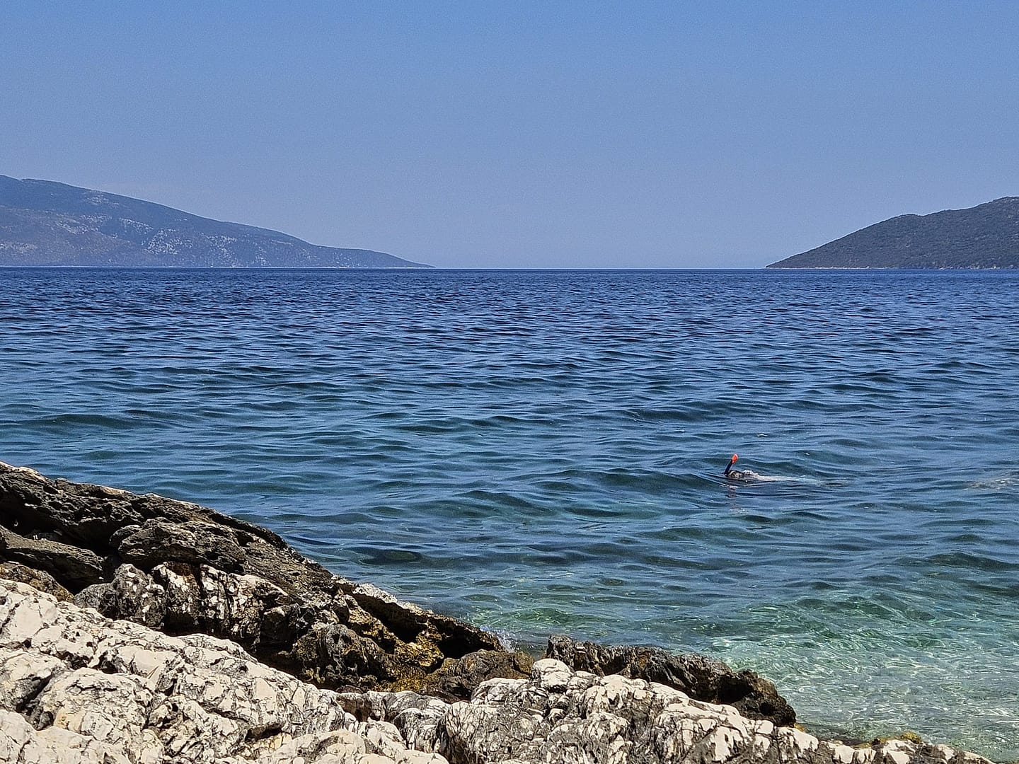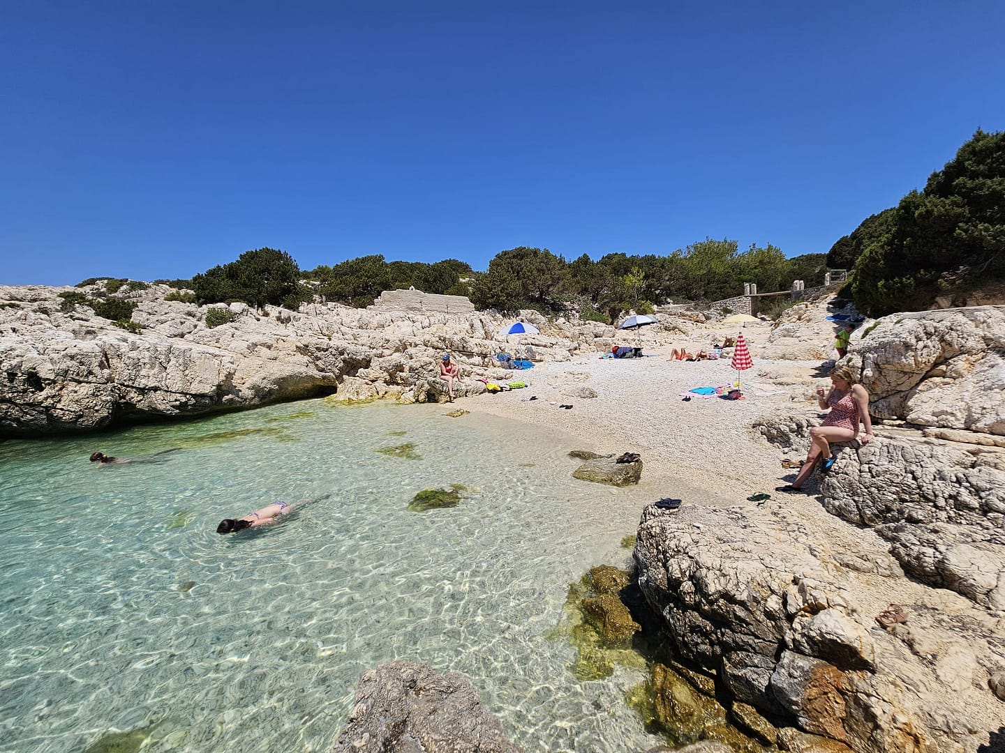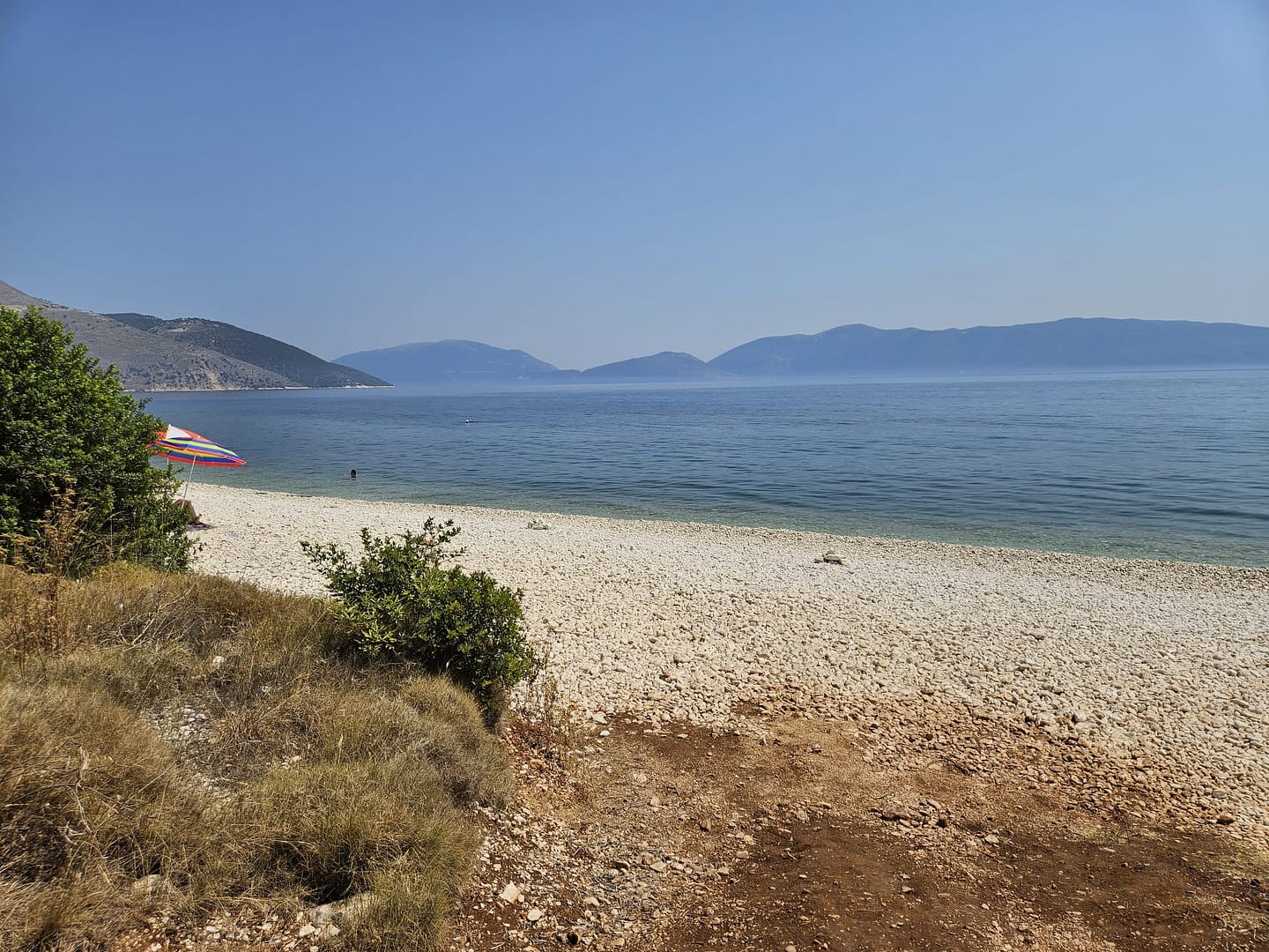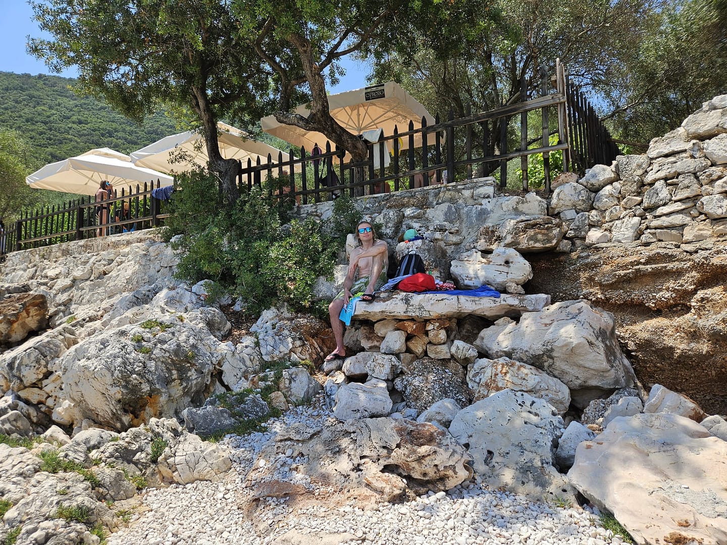 Kaum aus dem Flugzeug ausgestiegen und das Mietauto abgeholt, machten wir uns auf den Weg zu unserem ersten Ziel: einem Strand in der Nähe unserer Unterkunft. Nachdem wir die ersten Einkäufe erledigt hatten, fuhren wir voller Vorfreude dorthin. Der Strand begrüßte uns mit seiner einladenden Schönheit. Anfangs fanden wir einen schattigen Platz auf einem Felsen, wo wir uns niederließen und die Aussicht genossen. Im Laufe des Tages konnten wir dann in den Schatten auf den Kiesstrand umziehen.