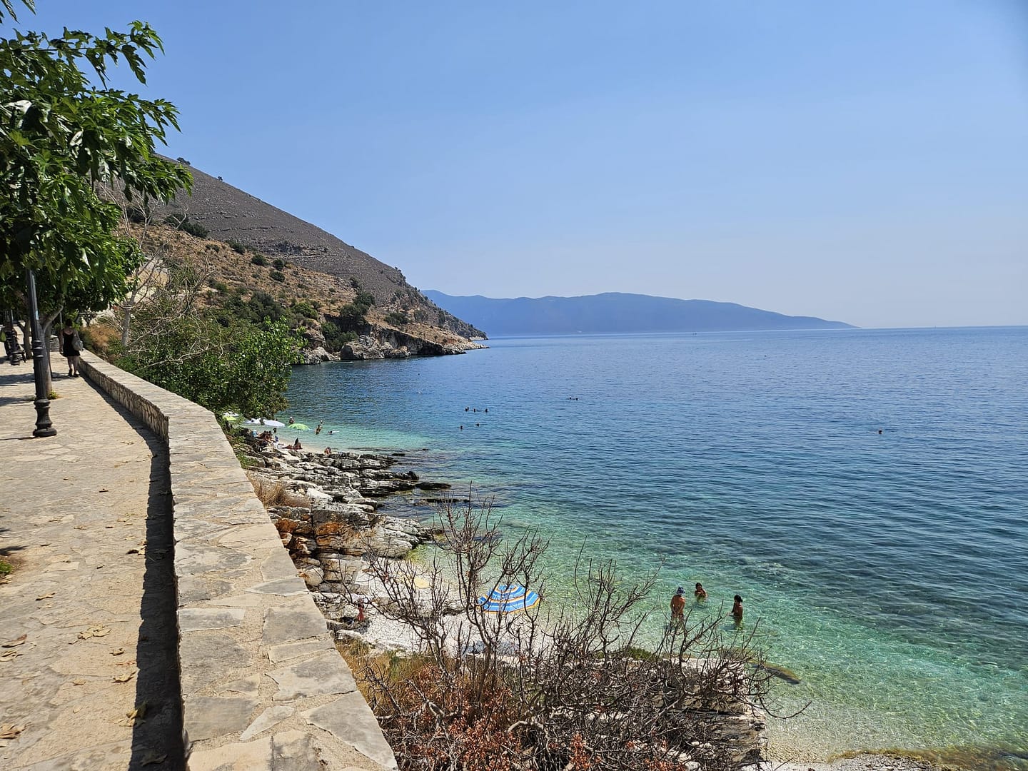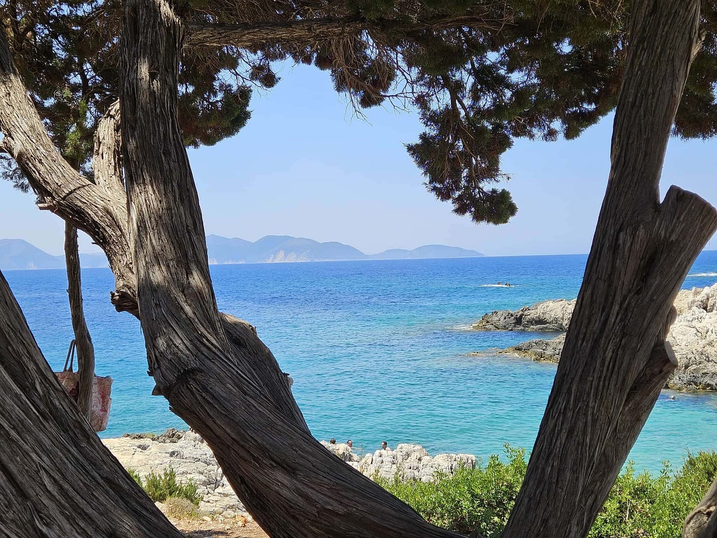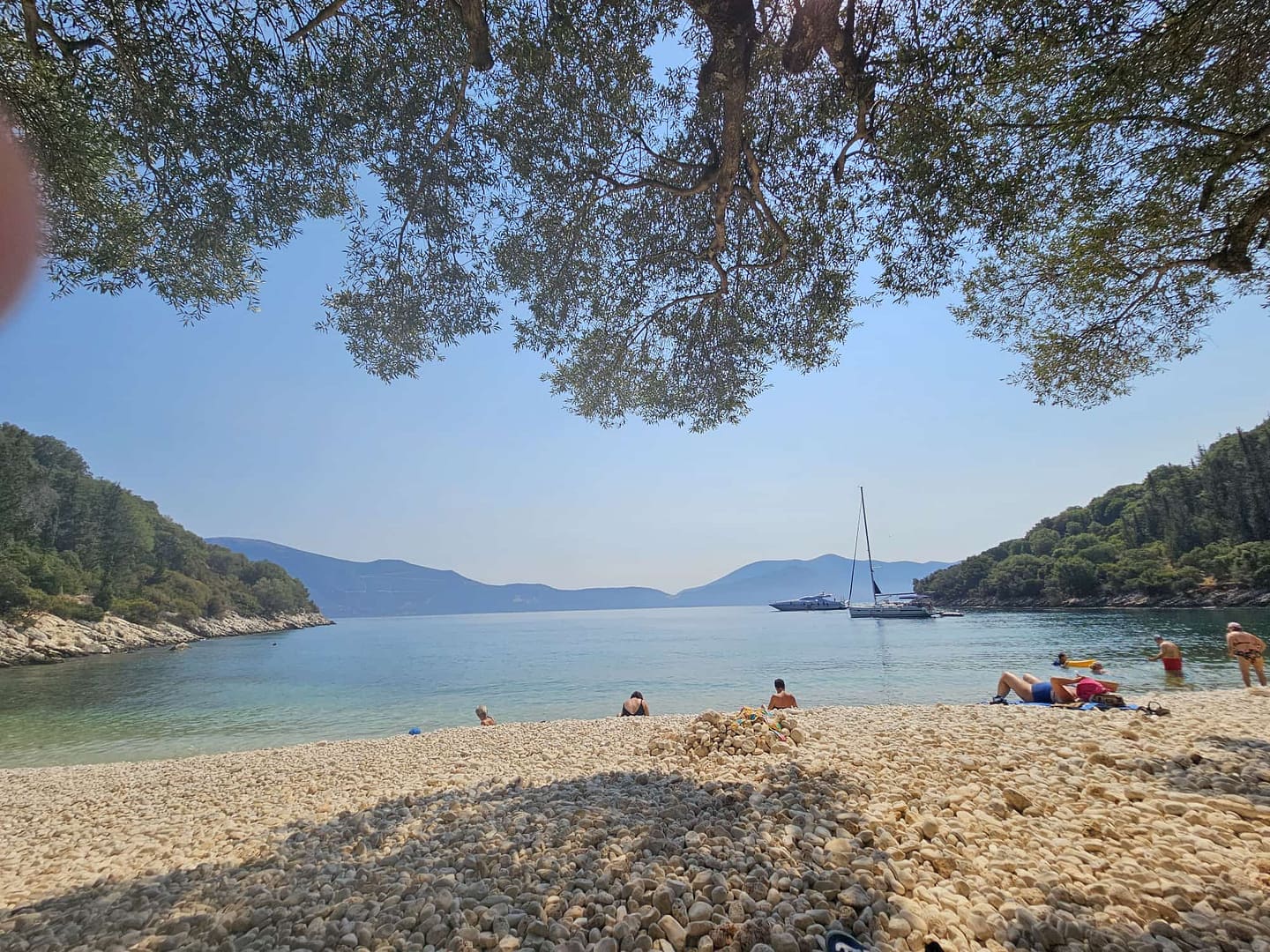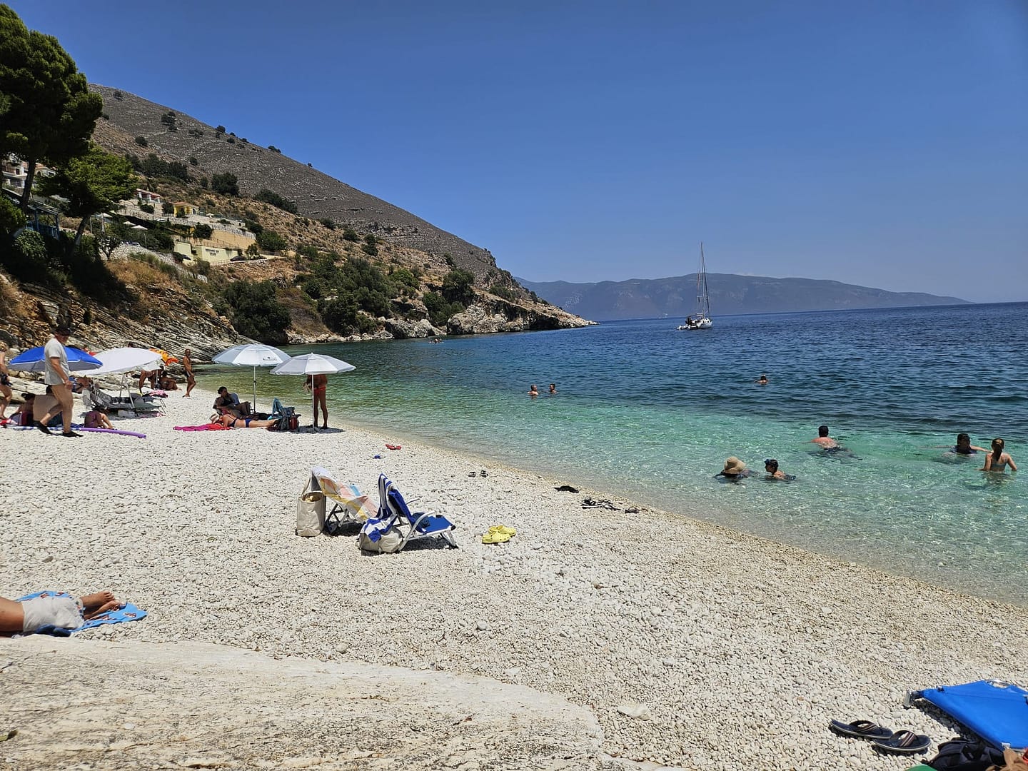 Kaum aus dem Flugzeug ausgestiegen und das Mietauto abgeholt, machten wir uns auf den Weg zu unserem ersten Ziel: einem Strand in der Nähe unserer Unterkunft. Nachdem wir die ersten Einkäufe erledigt hatten, fuhren wir voller Vorfreude dorthin. Der Strand begrüßte uns mit seiner einladenden Schönheit. Anfangs fanden wir einen schattigen Platz auf einem Felsen, wo wir uns niederließen und die Aussicht genossen. Im Laufe des Tages konnten wir dann in den Schatten auf den Kiesstrand umziehen.