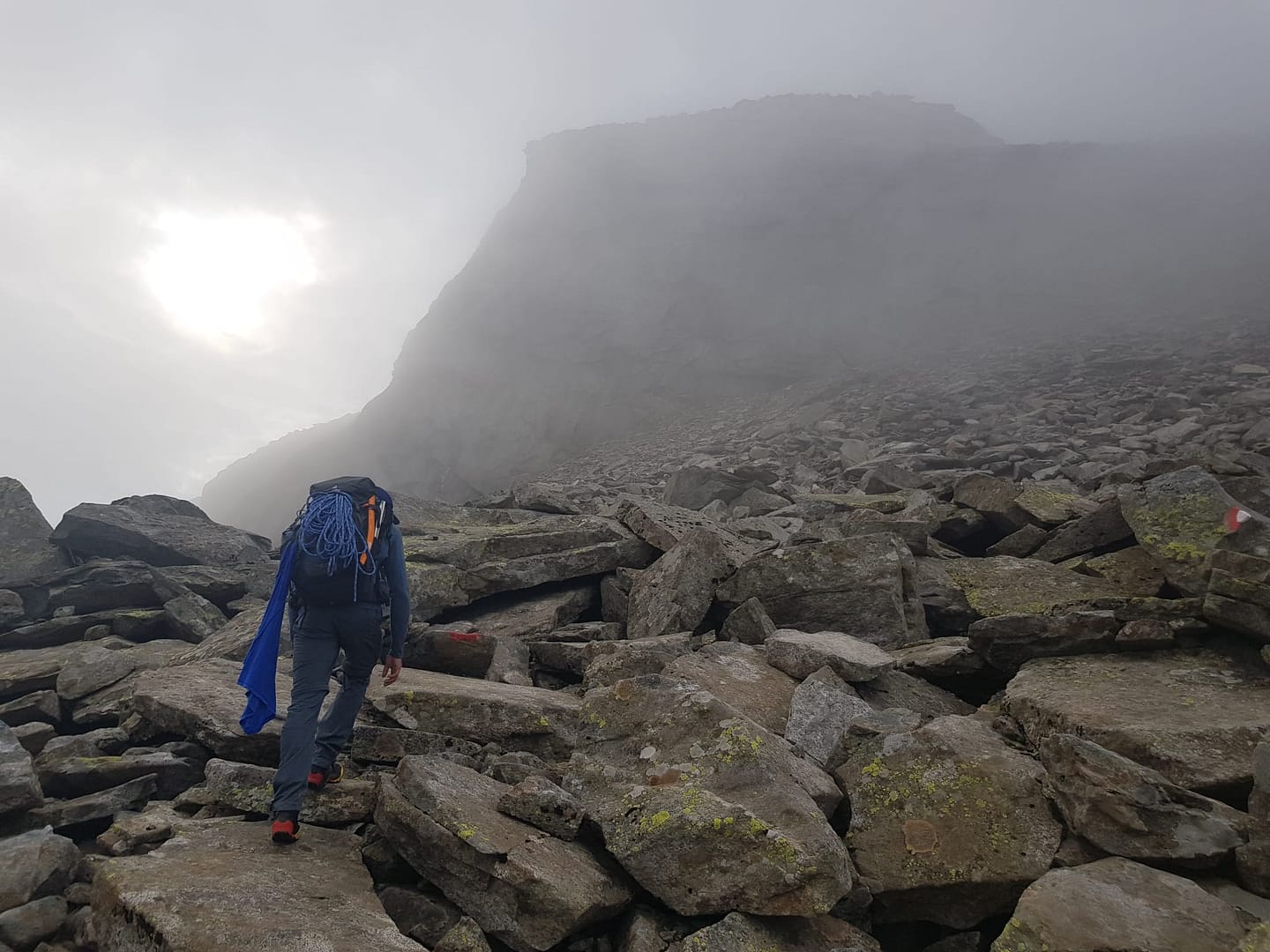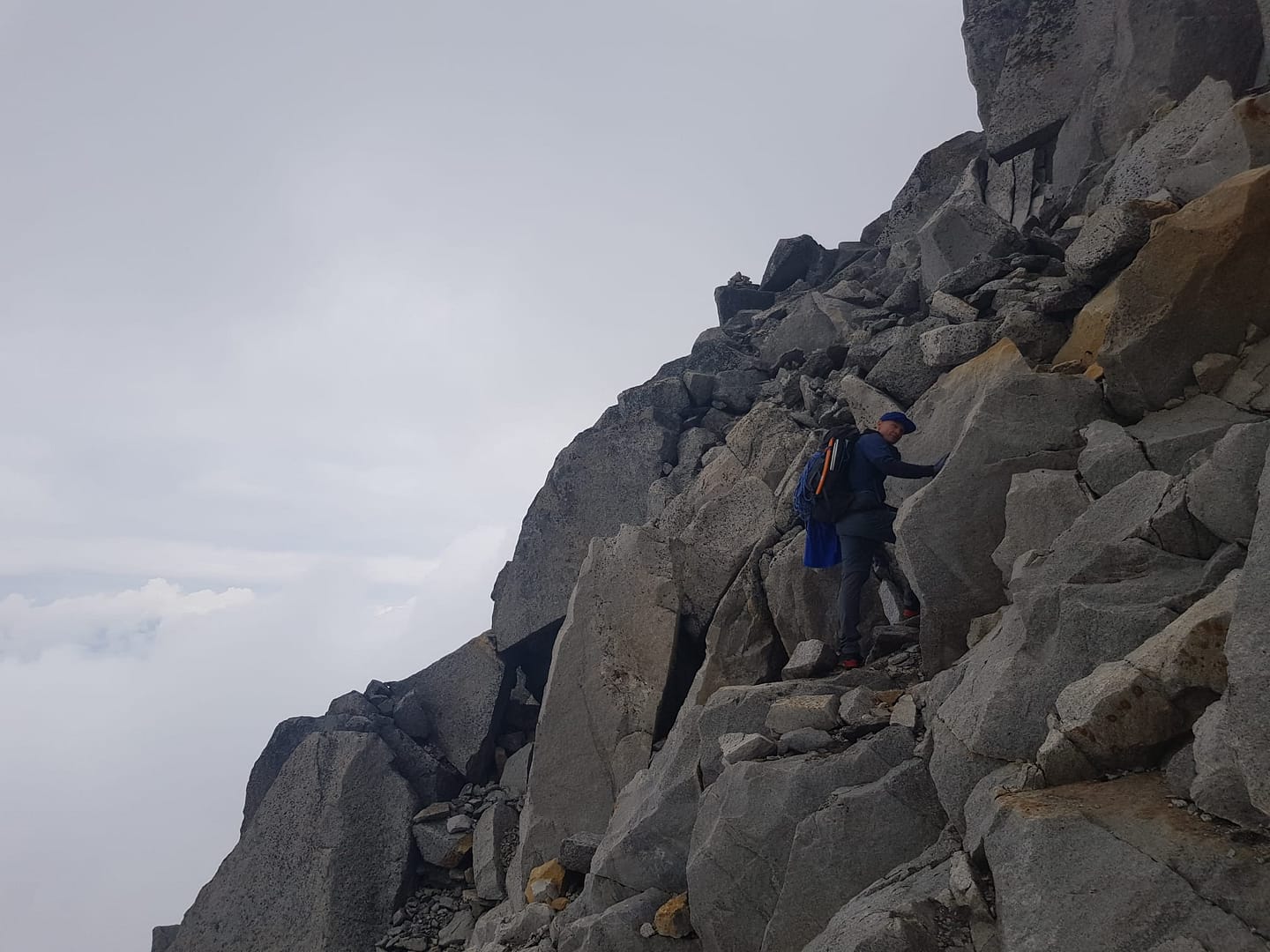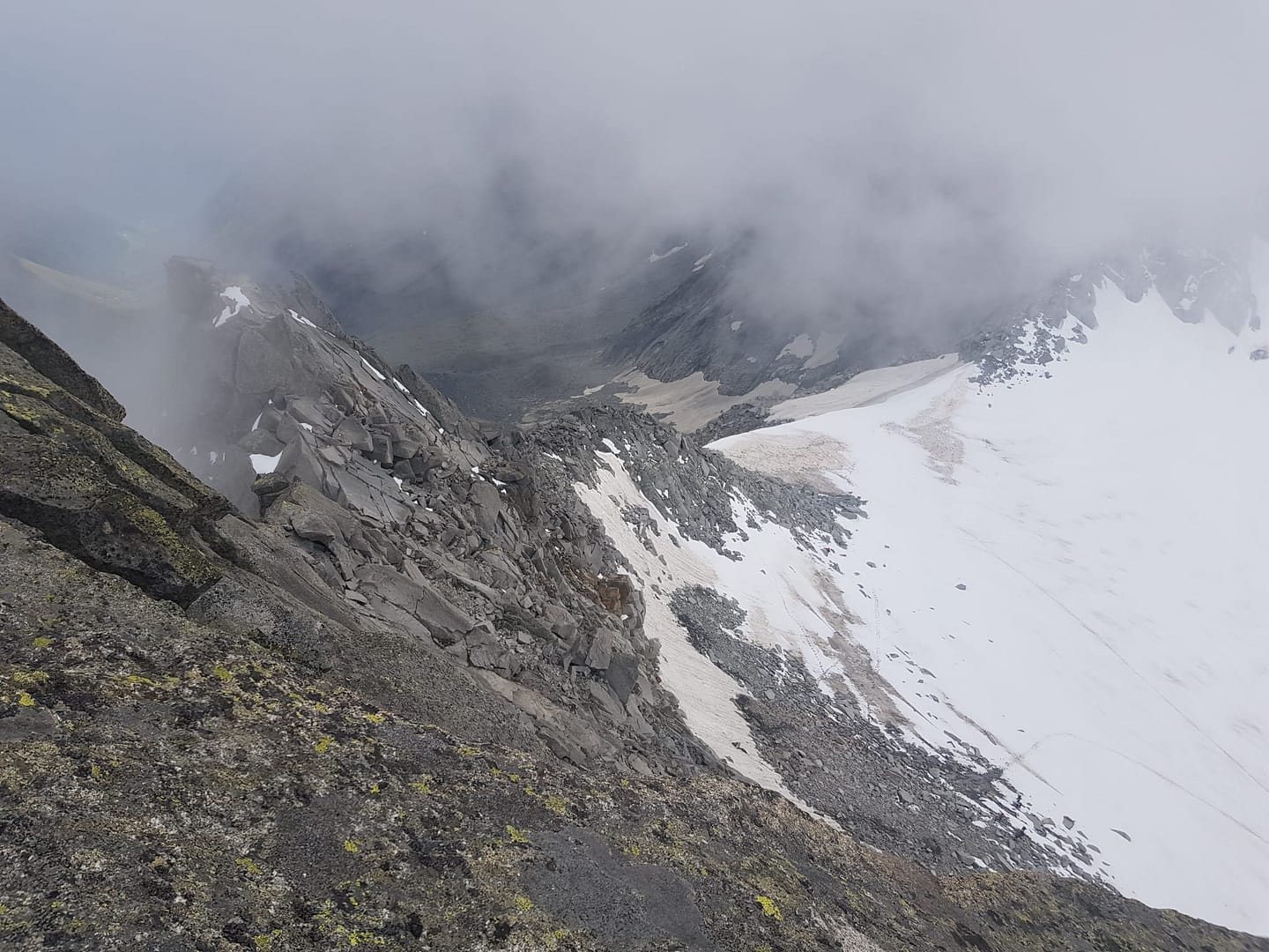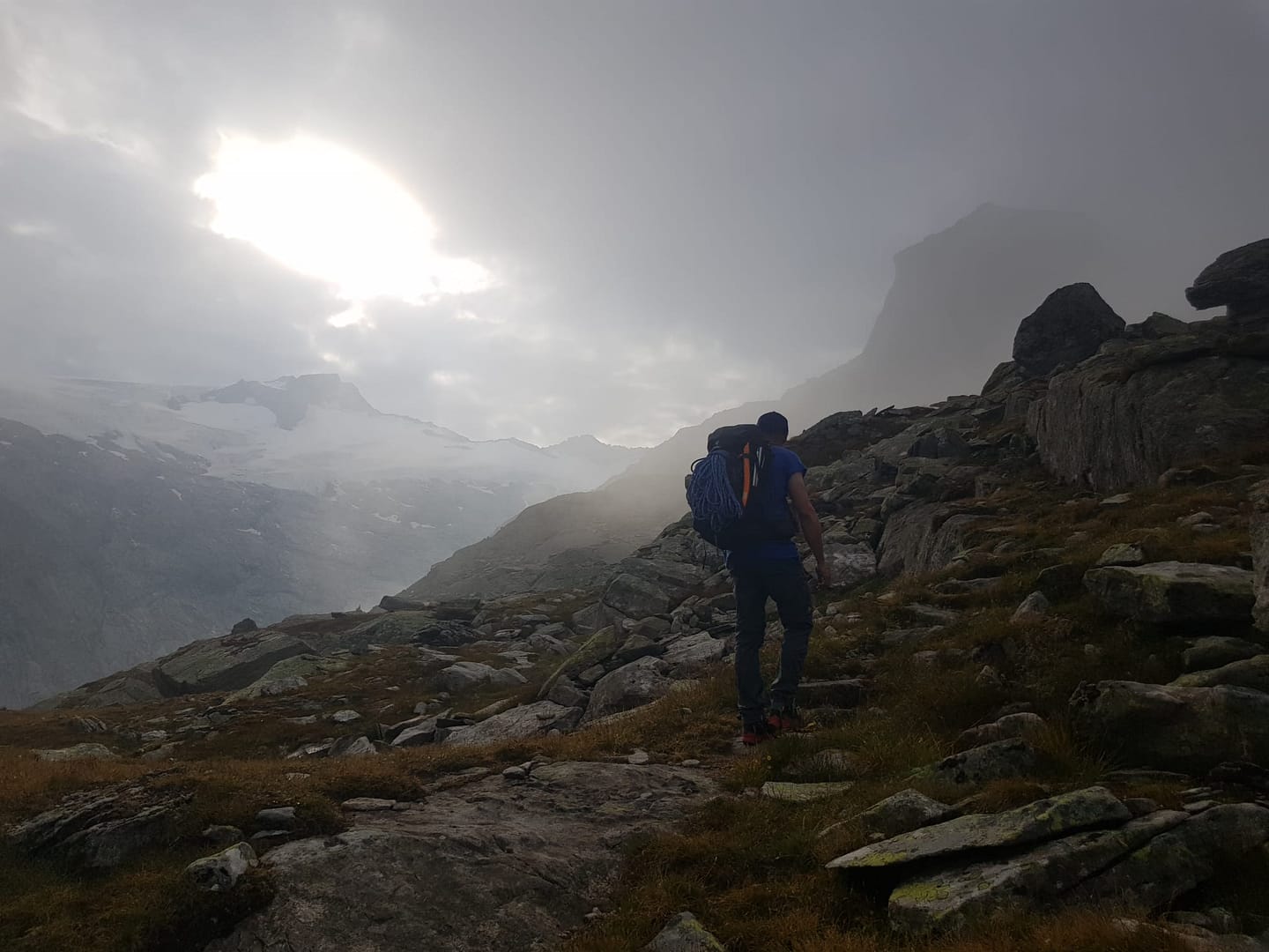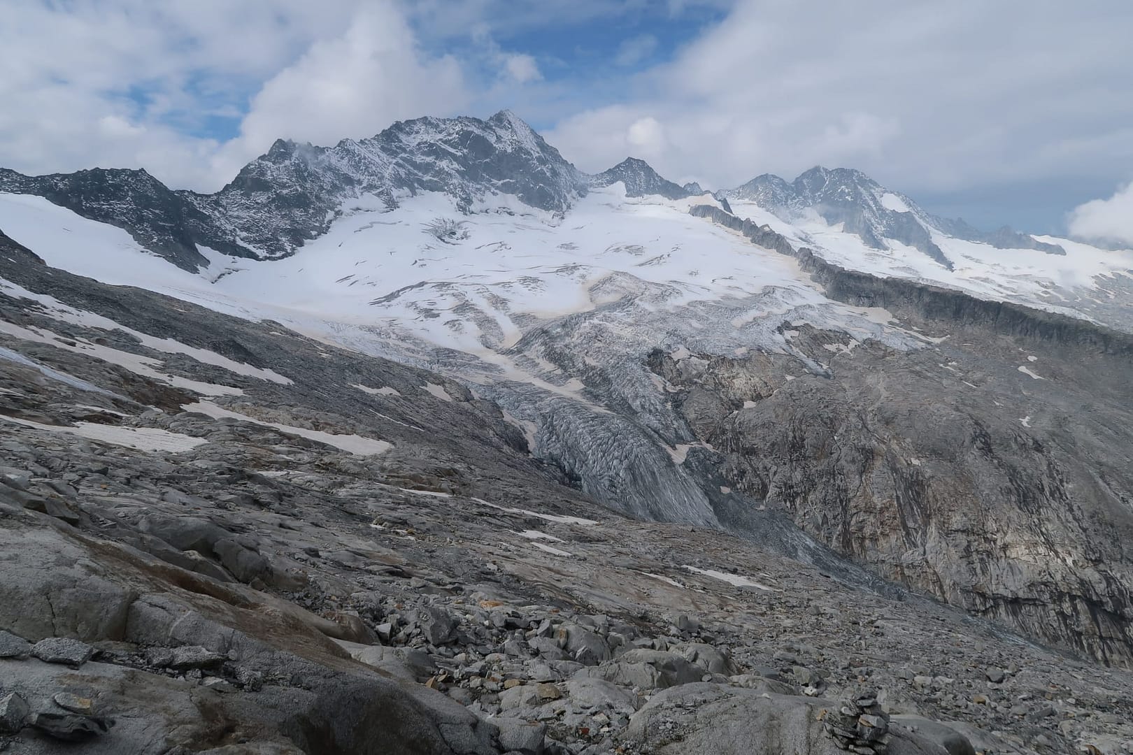 Auf dem Gletscher selbst haben wir nur den Pickel rausgeholt, da es soweit aufgefirnt war, dass wir die Steigeisen nicht gebraucht haben. Unten am Fuße der Berliner Spitze geht es dann über große Blöcke zum Gipfel.