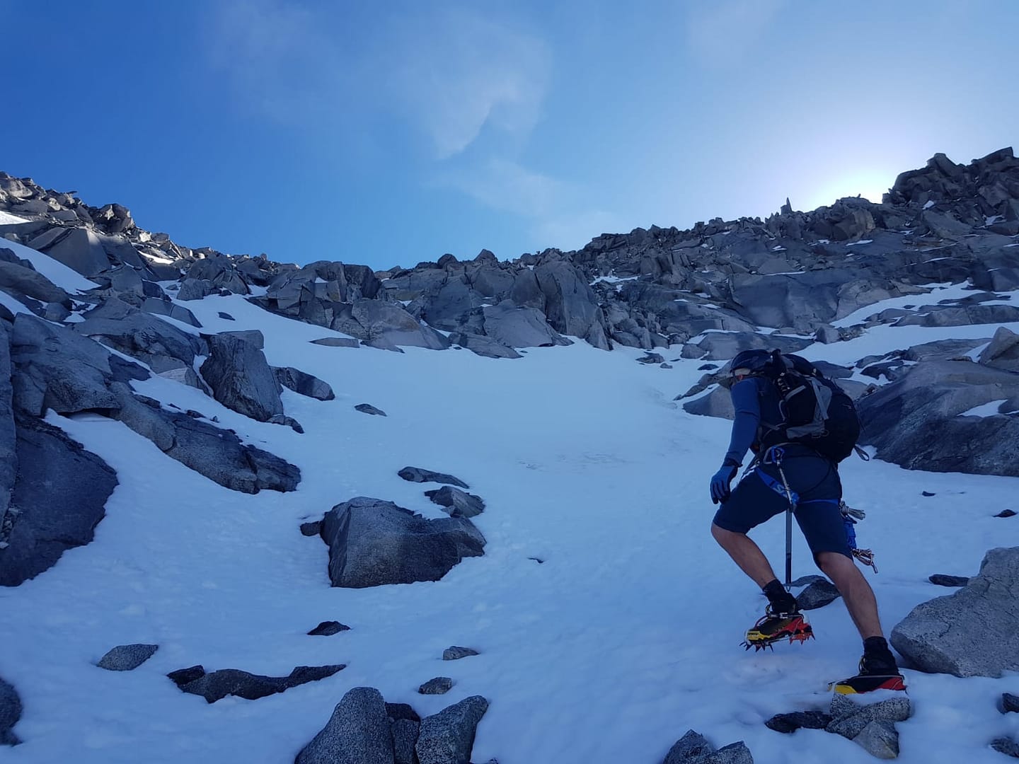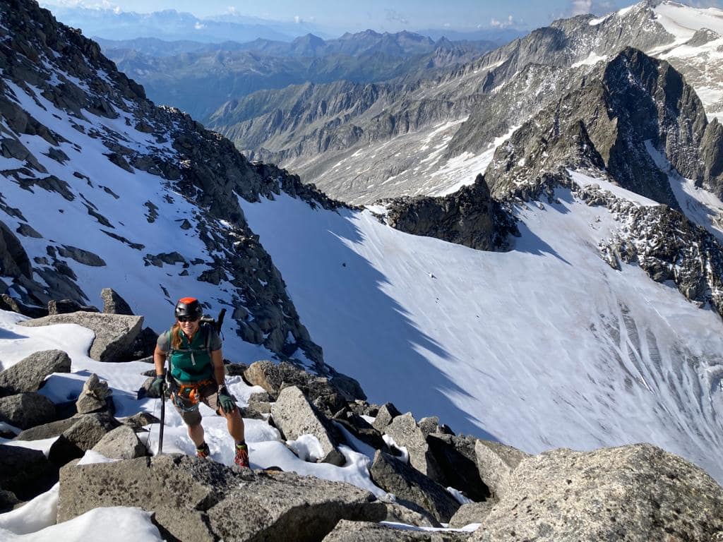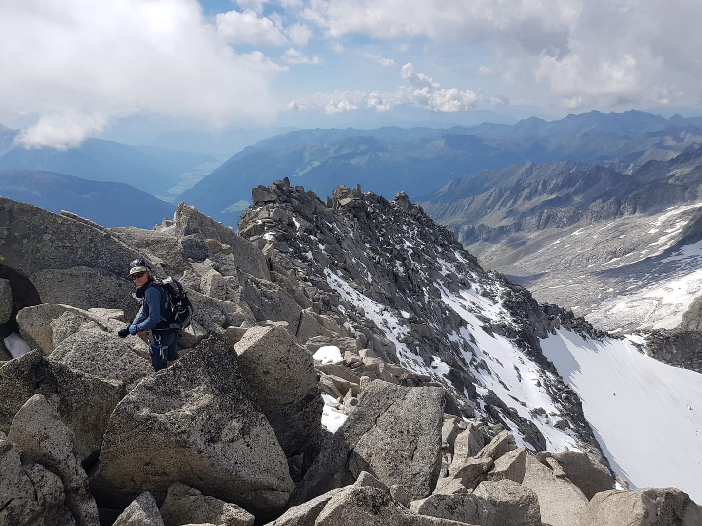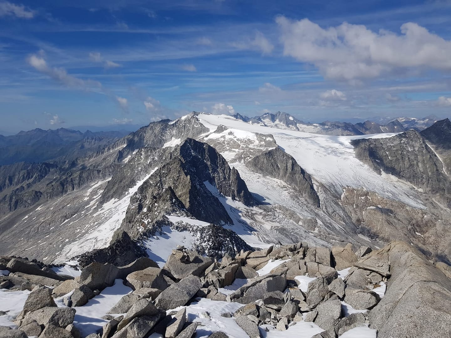 Auf ca. 2.720 m betreten wir den Floitenkees Gletscher und steigen nach Südosten auf, wobei wir den Punkt zwischen den beiden Gipfel anpeilen. Nach ca. 300 Höhenmeter geht es nach links in das grobe Blockwerk unterhalb vom Grat und durch die Flanke zum Gipfel.
