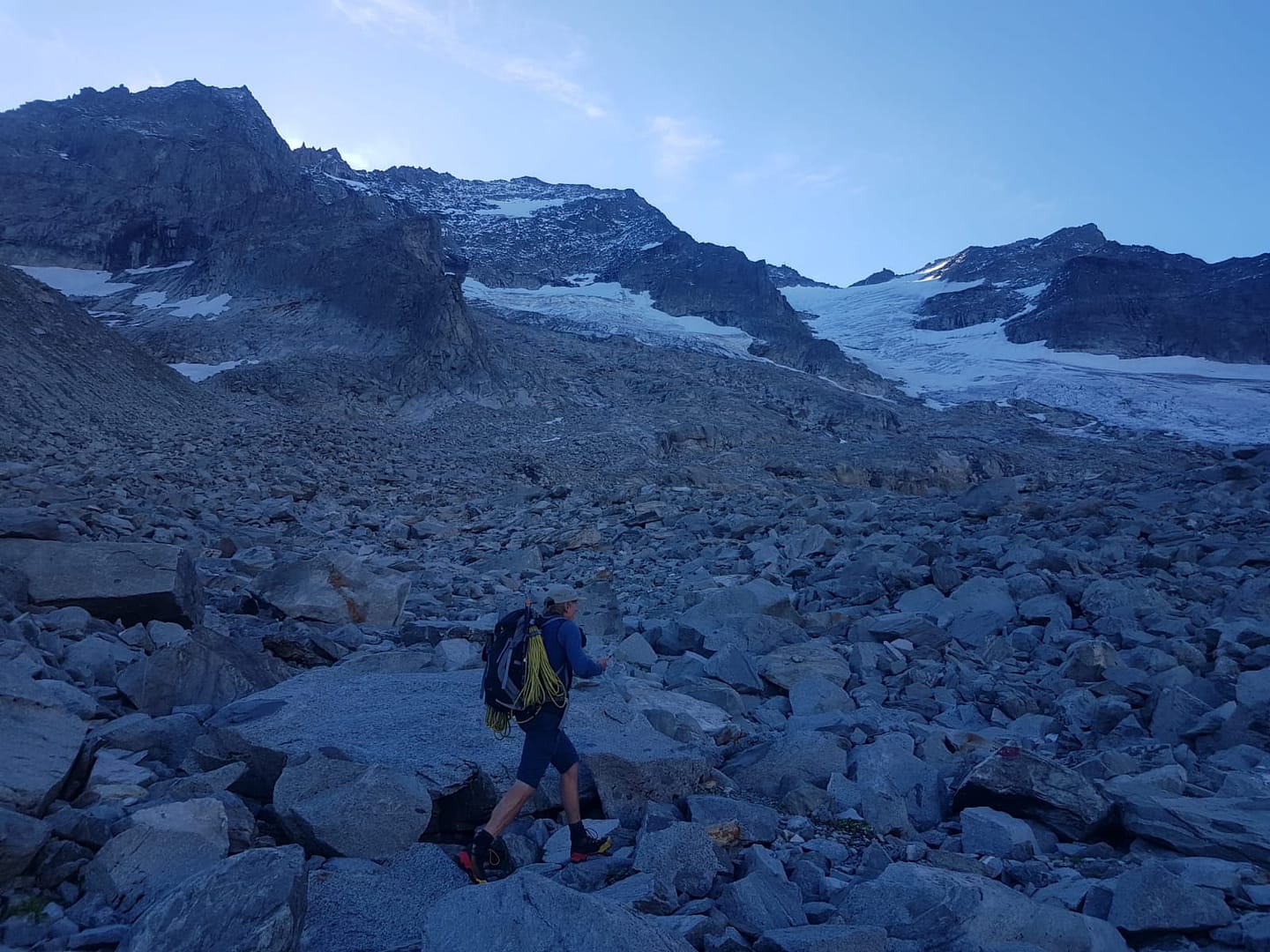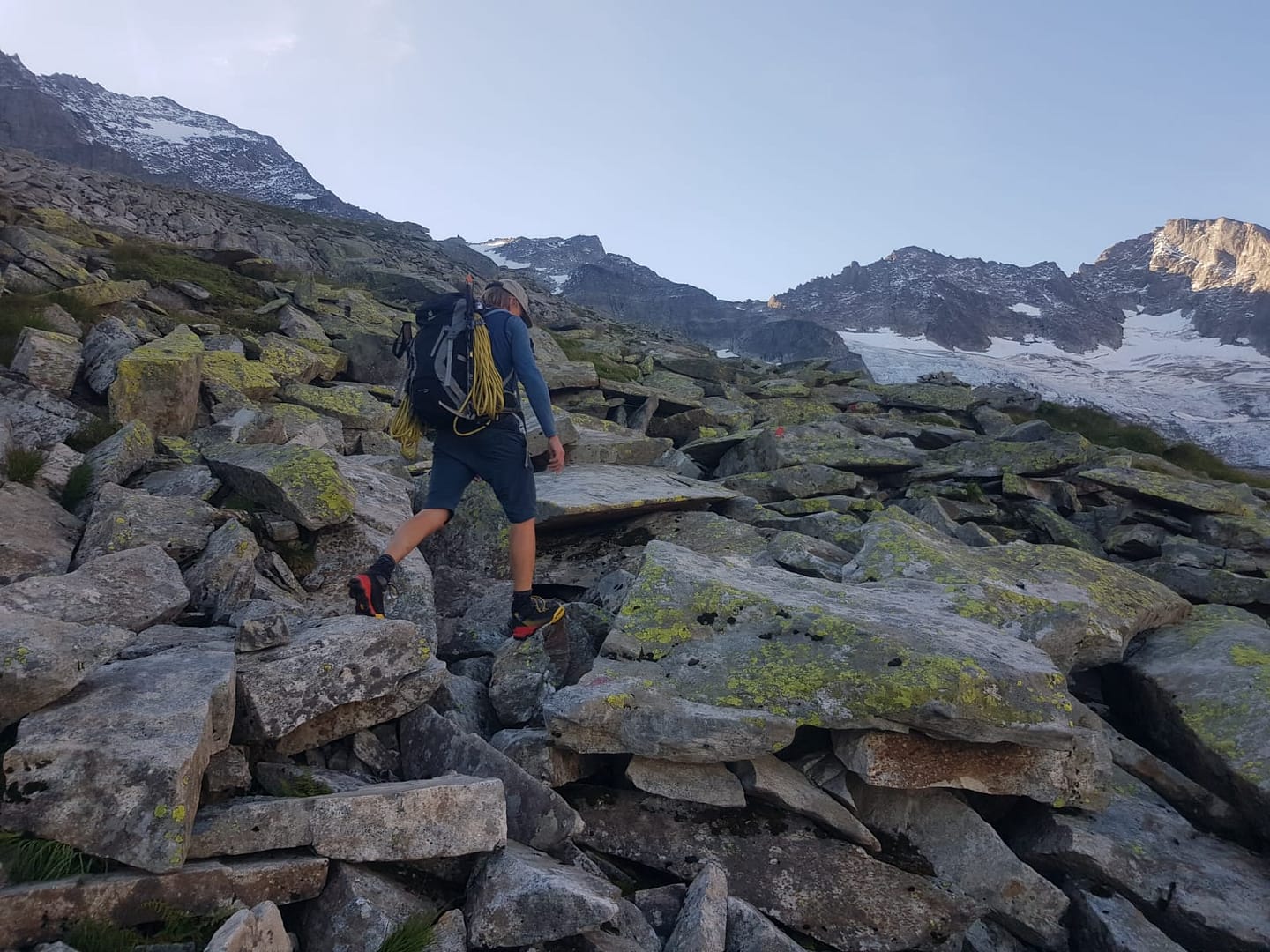 Von der Hütte folgen wir erst einmal einem Pfad über Grasgelände, entlang einer Steinmauer unter welcher eine Wasserleitung liegt. Schnell erreichen wir das Blockgelände, wo Markierungen und Steinmänner den Weg zur alten Seiltenmoräne (westl. unter dem W-Grat des Kleinen Löffler weisen. Nicht immer sind die Markeriungen oder Steinmänner gut zu sehen, also gut die Augen aufhalten. 🙂