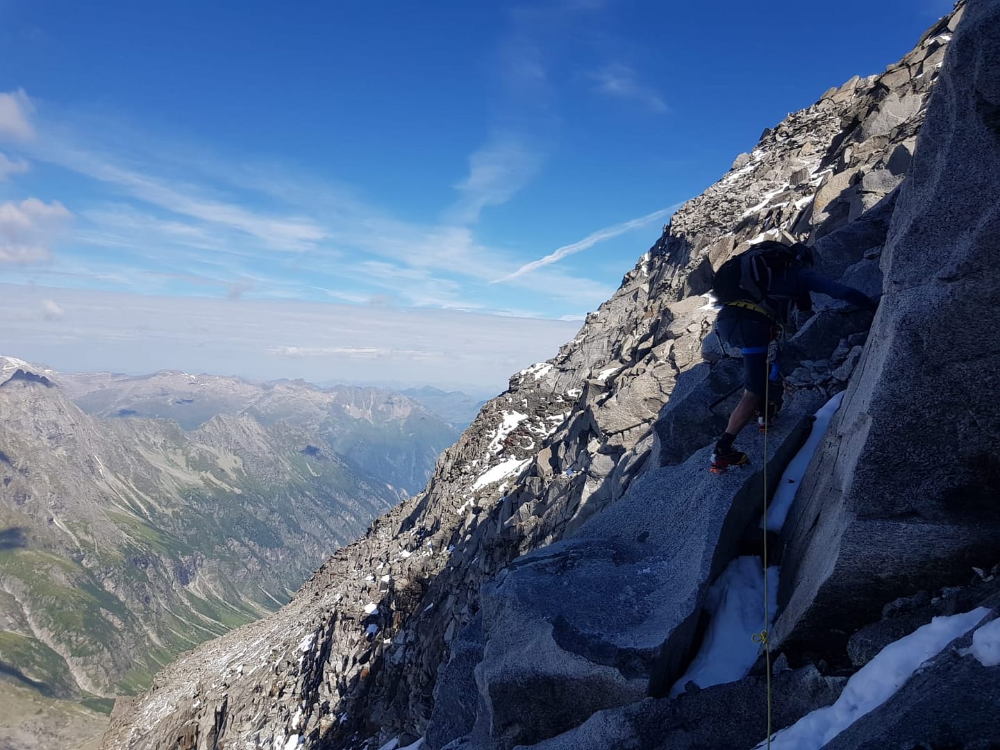 Von dem Großen Löffler sind wir über den Blockgrad I-Kletterei runter auf die Trippachspitze geklettert. Zwei Stellen fand ich gar nicht so einfach, aber schlussendlich kamen wir doch an. Ich persönlich finde hochklettern einfacher als runter, also ich würde empfehlen erst zur Trippachspitze zu gehen und dann hoch zum Löffler zu klettern.