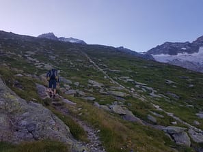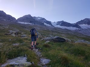 Von der Hütte folgen wir erst einmal einem Pfad über Grasgelände, entlang einer Steinmauer unter welcher eine Wasserleitung liegt. Schnell erreichen wir das Blockgelände, wo Markierungen und Steinmänner den Weg zur alten Seiltenmoräne (westl. unter dem W-Grat des Kleinen Löffler weisen. Nicht immer sind die Markeriungen oder Steinmänner gut zu sehen, also gut die Augen aufhalten. 🙂