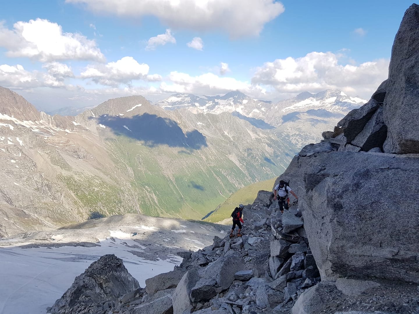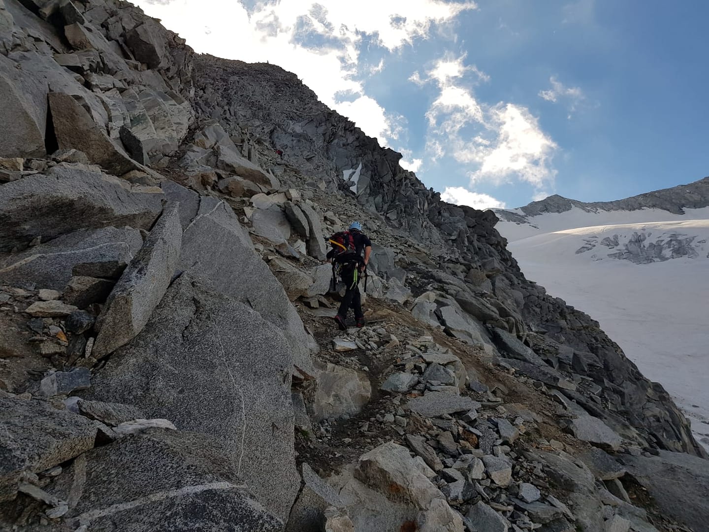 An dieser Stelle haben wir Steigeisen ausgezogen und das Seil wieder im Rucksack verpackt, denn nun heißt es über das Blockgestein im I bis II (UIAA) zu kraxeln. Steinmanderl weisen den Weg, nichts desto trotz haben wir diesen etwas verloren und sind zu weit links aufgestiegen und mussten am „oberen Rand“ wieder weit nach rechts rüber klettern. TIPP: Klettert links von der Schuttrinne hoch (nicht in der Rinne, da sehr brüchig) und quert diese dann nach rechts rüber um von dort über das Blockgestein weiter nach oben zu klettern. Achtet auch Steinschlag und habt unbedingt einen Helm an!