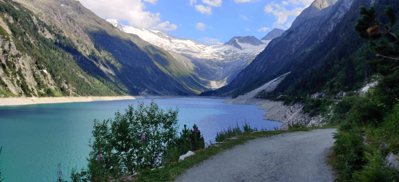 Wir parken an der letzten Parkmöglichkeit am Schlegeis-Stausee an der Gaststätte Zamsgatterl (Maut 14 €). Der Weg zum Furtschaglhaus ist ausgeschrieben, aber auch nicht zu verfehlen. Der breite Schotterweg oberhalb des Stausees führt gemütlich bis an die Südspitze des großen Schlegeisspeichers. Hier gibt es auch einen Platz, wo man sein Bike abstellen könnte, wenn man sich den Hatsch ersparen möchte. Wobei der Ausblick auf den Speicher diese Wanderung lohnenswert macht. An der Südspitze überqueren wir eine Brücke und folgen wenig später einem beschilderten Pfad links weg, viele Serpentinen führen zum Furtschaglhaus.