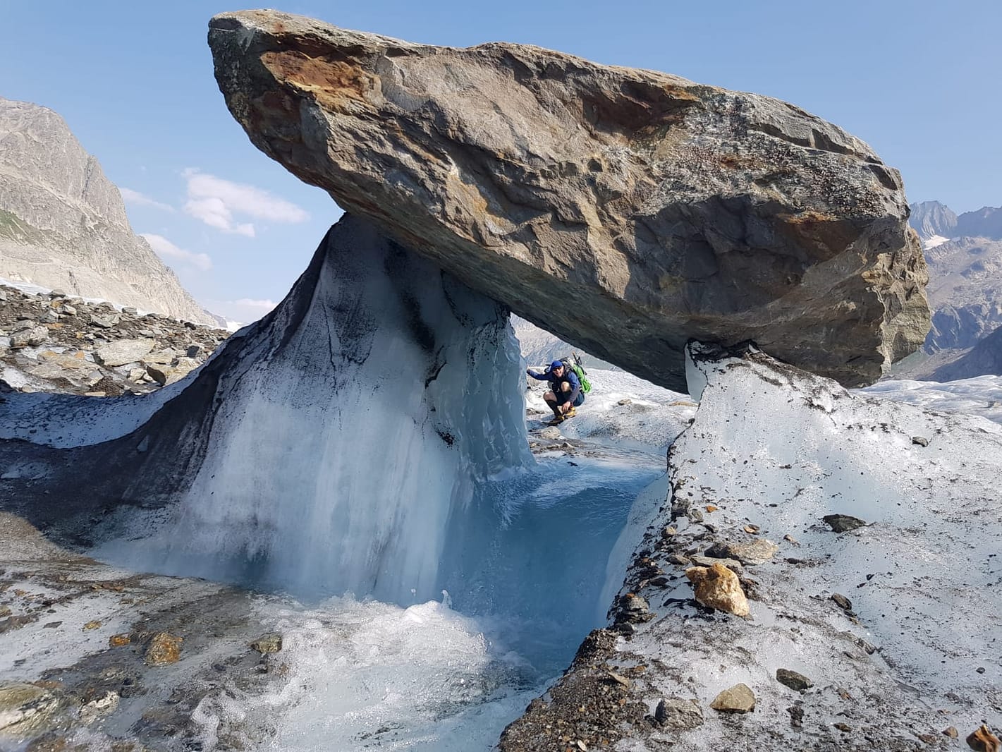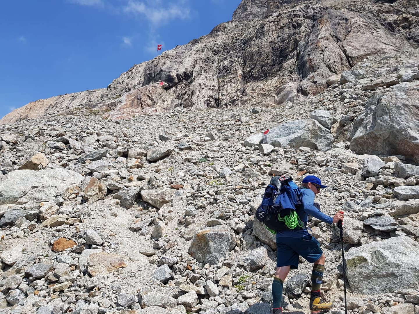 Der Ausstieg des Gletschers ist auf einem sehr großen Felsen mit einem roten Punkt markiert. Hier gelangt man auf den Südweg, auf welchem wir den Wegspuren auf Moränengeröll folgen. Der Weg ist mit kurzen Leitern, Holztritten und Seilen gesichert.