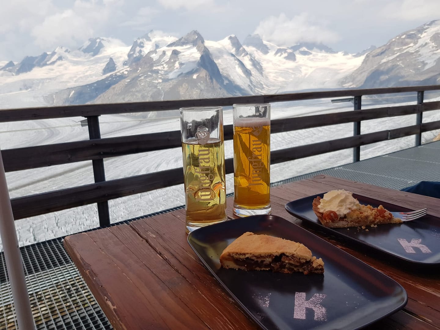 Von oben hat man einen fantastischen Ausblick auf den Konkordiaplatz, wo der große Aletschfirn von links, der Junfraufirn von vorn und von rechts das Ewigschneefeld zusammen treffen. Diese Aussicht genießen wir bei leckerem Kuchen und Bier.