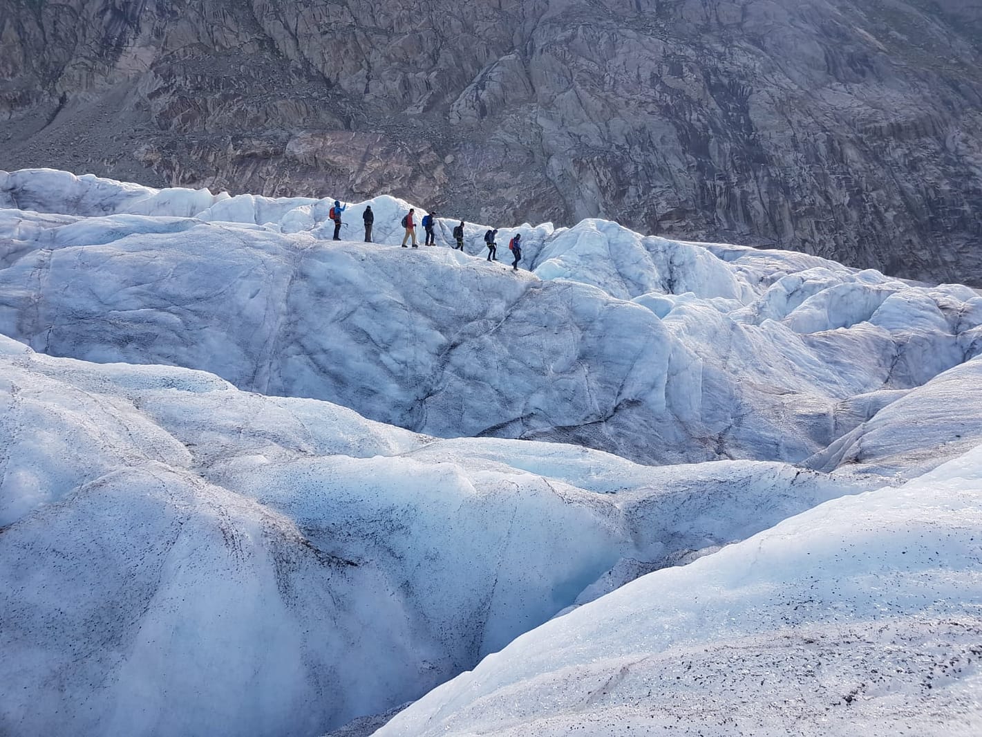 Mit der Bahn geht es in 10 Minuten nach oben zur Fiescheralp. Von der Bergstation folgt man den Wegweisern erst einmal in Richtung Märjelesensee (rechts herum) auf einer gut ausgebauten Fahrstraße. Bunte Blumen und Kühe säumen den Weg bzw. Almwiesen, es geht immer wieder leicht bergauf und -runter bis wir zu dem ca. 1 km langen Tunnel gelangen. Auf der anderen Seite des Tunnels gelangen wir zum See und zur Gletscherstube und von dort die Abzweigung nach links nehmend hinab über Steigspuren zum Gletscher selbst.