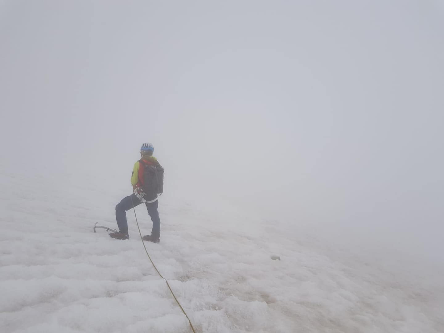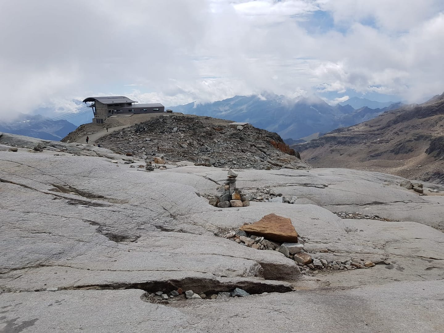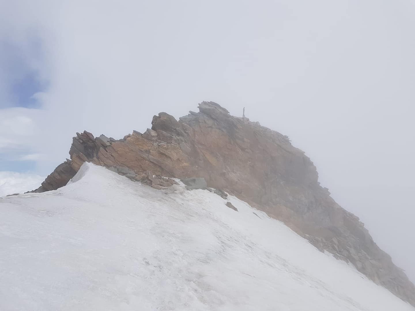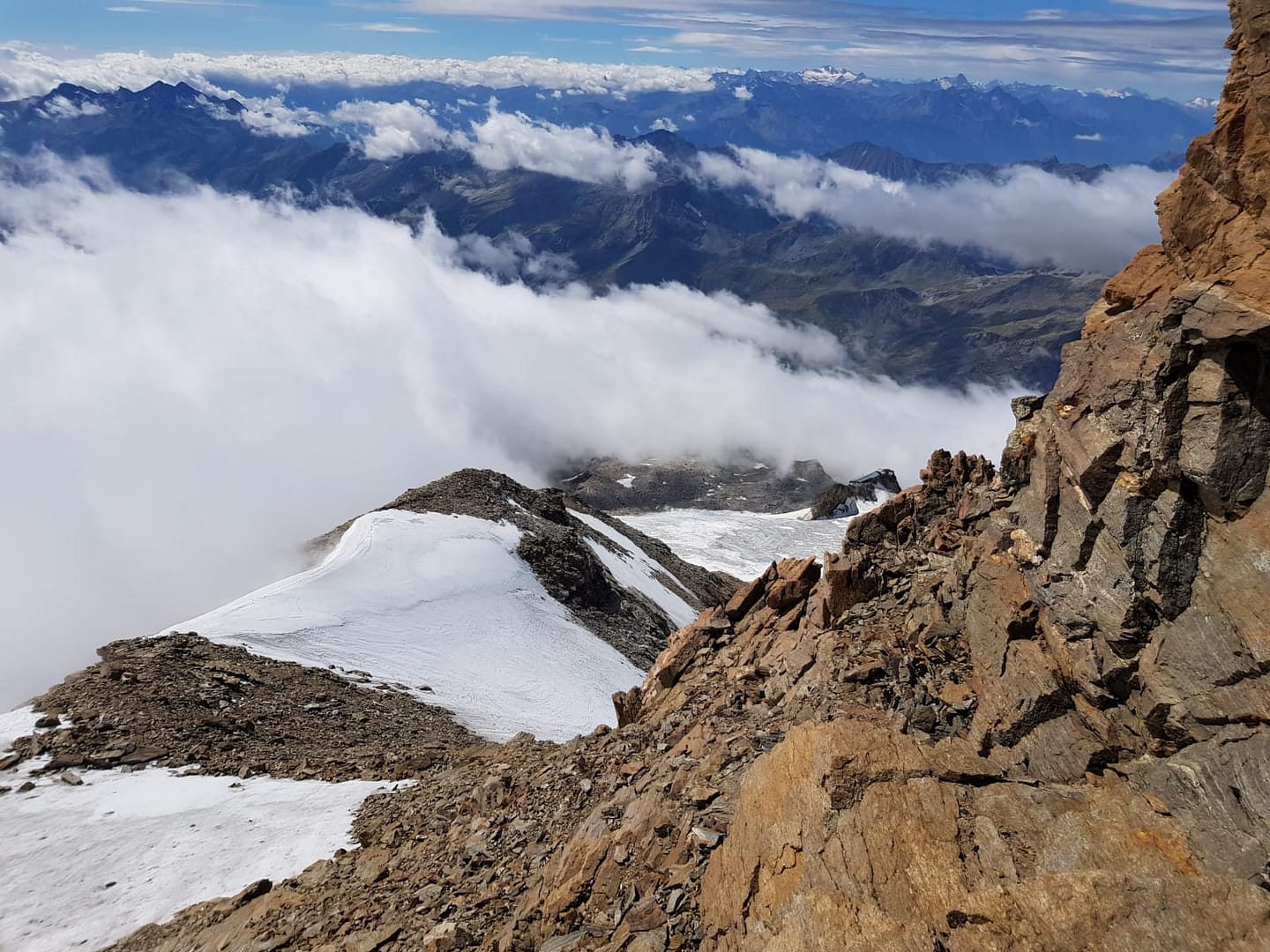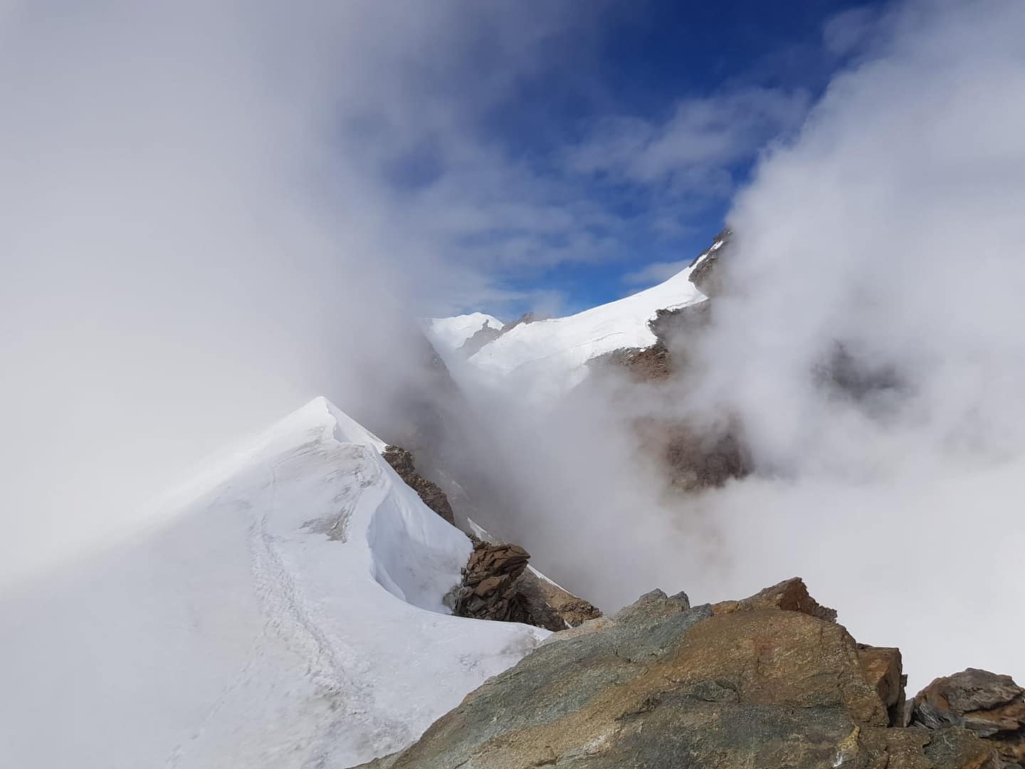 Die Vincentpyramide kann von verschiedenen Seiten bestiegen werden, unser Aufstieg war auf der nord-westliche Seite, den Abstieg beschritten wir in süd-westliche Richtung über die Felsen runter. Die Kletterei hat richtig Spaß gemacht, richtige Markierungen gibt es nicht, unser Anhaltspunkt war der Gletscher drunter, welchem wir links haltend bis zum Punta Giodani querten. Ein sehr unscheinbarer Gipfel im Gegensatz zu alle den anderen, die wir auch bereits die Tage zuvor erklommen hatten. Von hier schaut man auf die Vincentpyramide, die Ludwigshöhe und die Parrotspitze hoch. Leider ist es dann bei uns komplett zugezogen (siehe vorletztes Bild), so dass die Navigation über den Gletscher nicht so einfach war. TIPP: Nicht zu weit Richtung Westen gehen, denn dort sind die Spalten größer und nicht mehr so einfach zu überwinden. Unten am Gletscher angekommen, sind wir mit der Gondel zurück ins Tal gefahren.