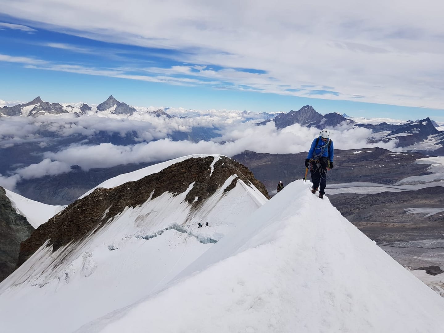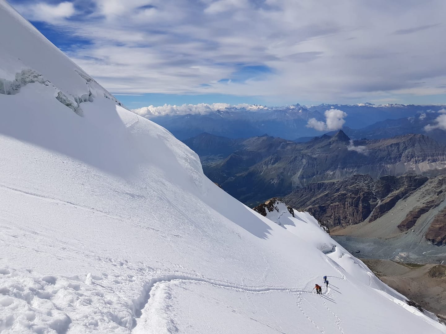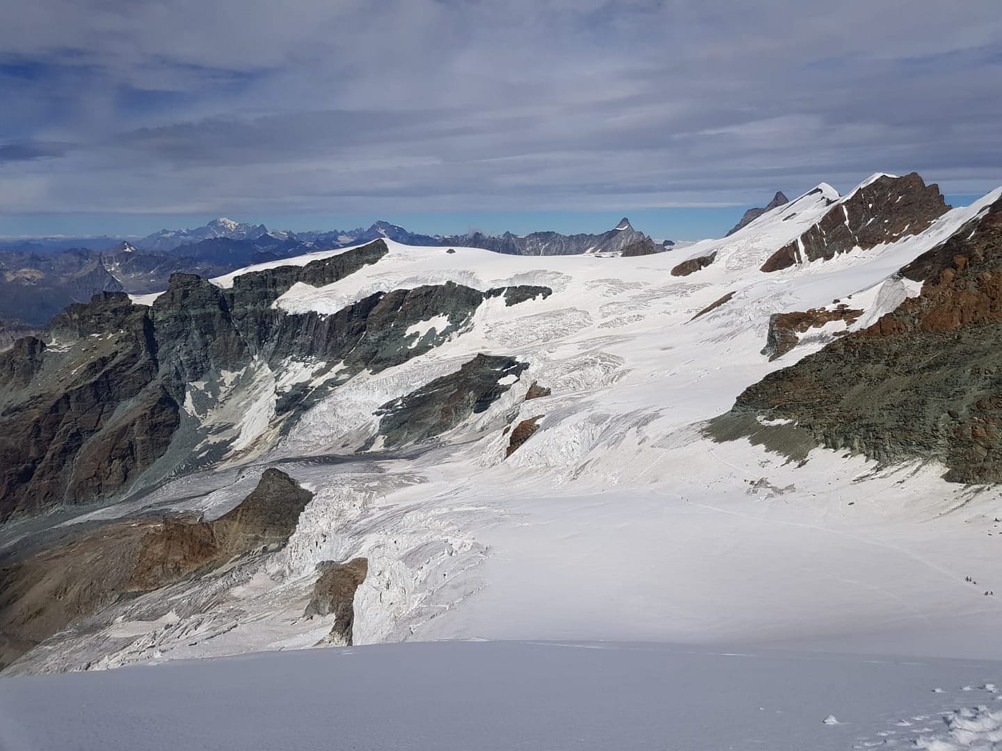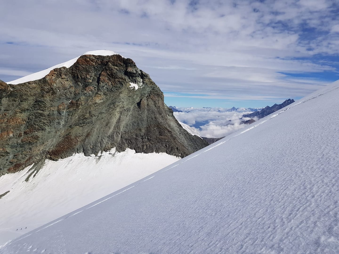 Vom Castor steigt man die Flanke Richtung Felixhorn ab, den „Gipfel“ kann man leicht übersehen, denn im Gegensatz zu all den anderen wirkt dieser eher wie ein Hügel, den man auf dem Weg zum Rifugio mitnimmt.