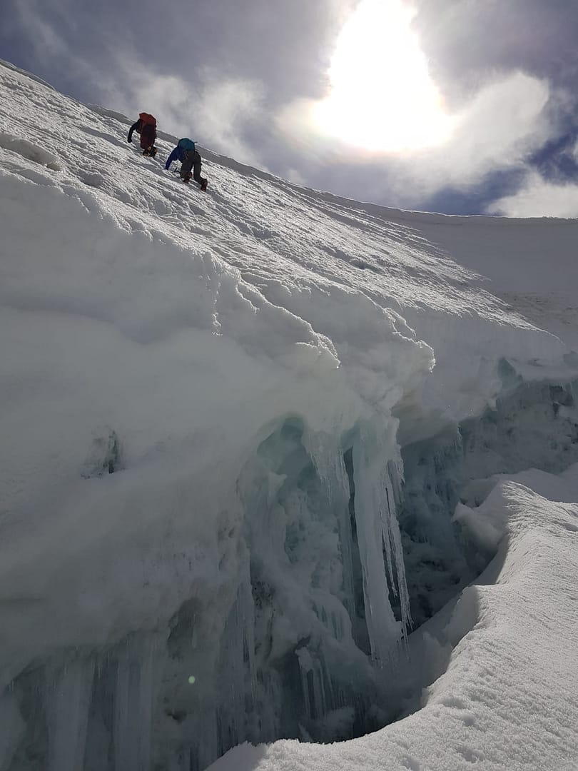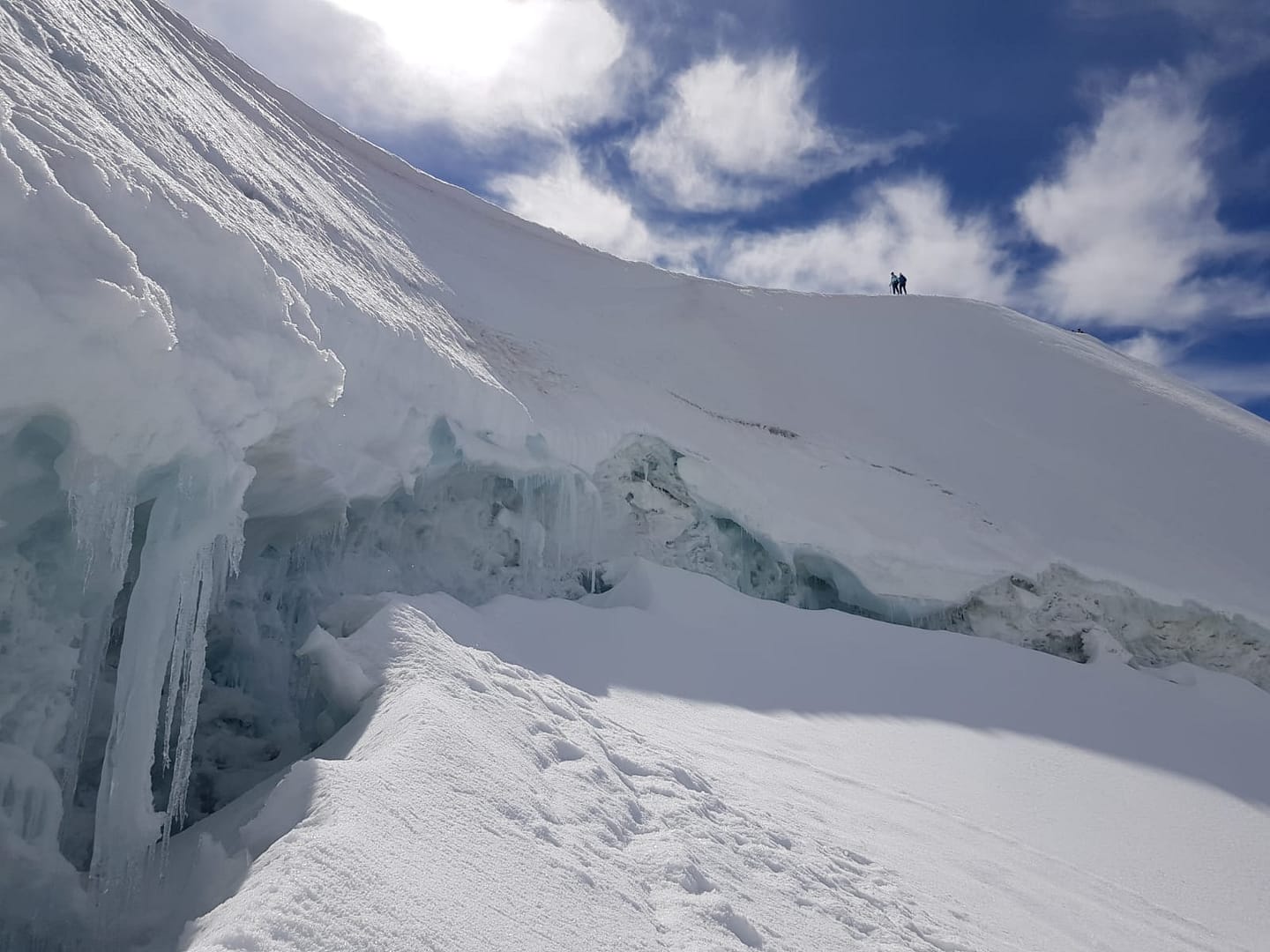 Vom Pollux gehen wir zum Zwillingsjoch, von wo wir über die teilweise steile Nordwestflanke hoch bis zur Mulde steigen. Hier muss eine Spalte überwunden werden (4. + 5. Bild), um dann auf das letzte Teilstück vom Firngrat zu gelangen und schlussendlich am Castor Gipfel anzukommen. Ein grandioser Blick rundum in die Waliser Alpen belohnt den Aufstieg. Der Abstieg erfolgt auf der anderen Seite Richtung zum Rifugio Quintino Sella (3.585 m).