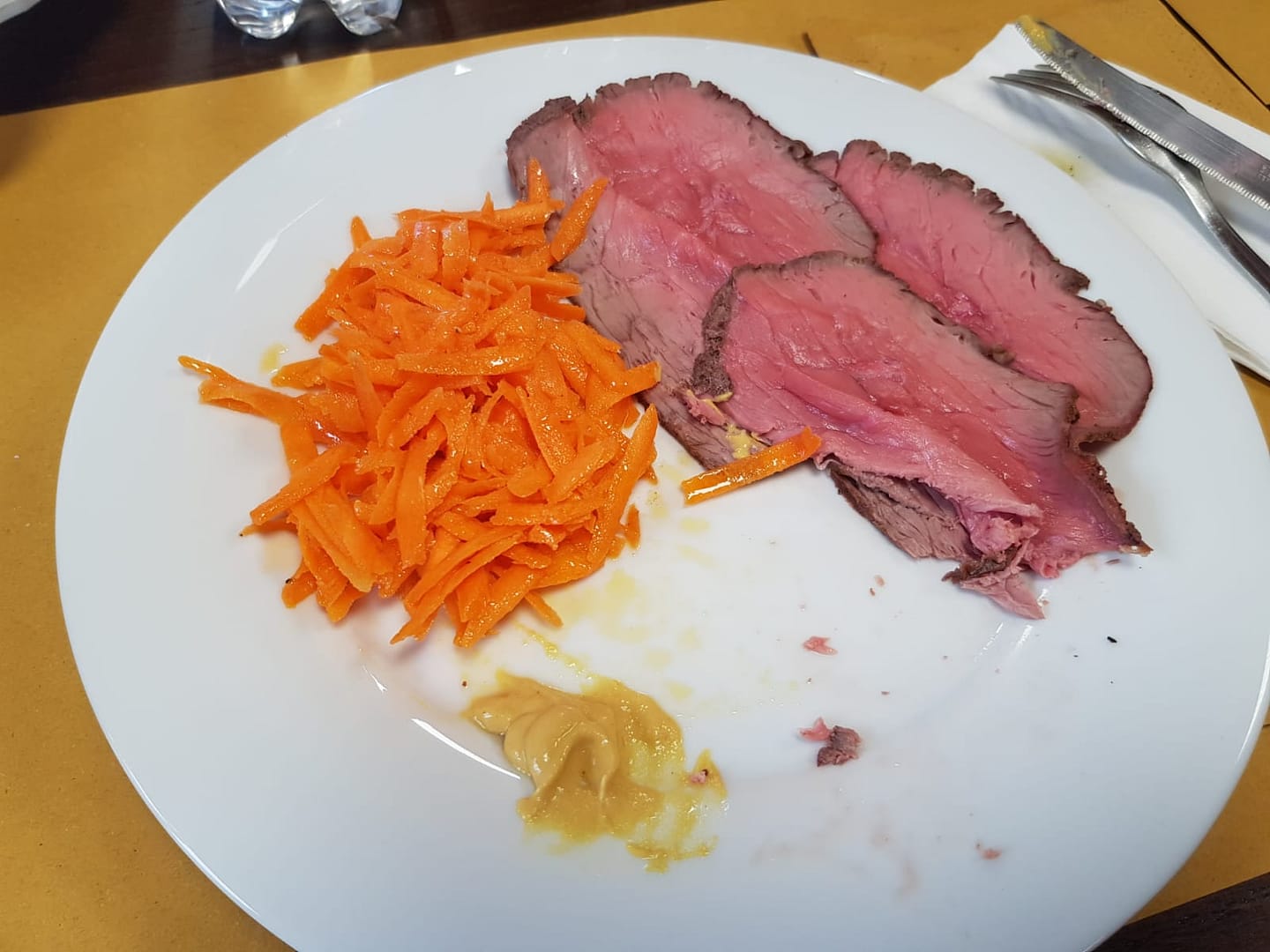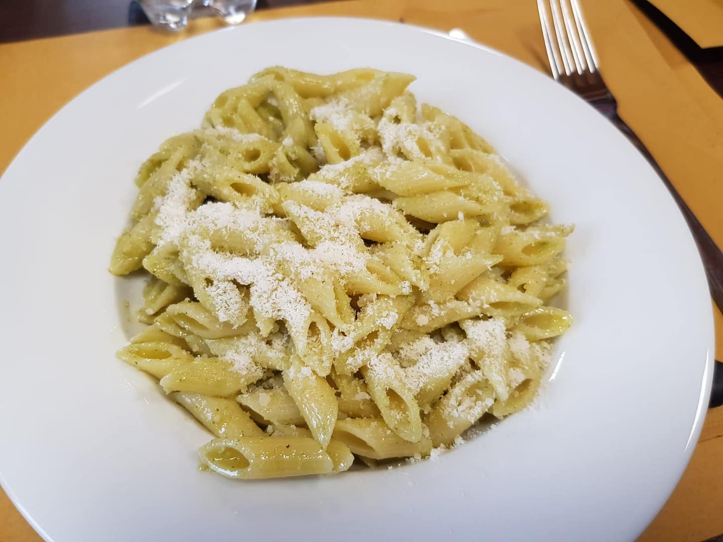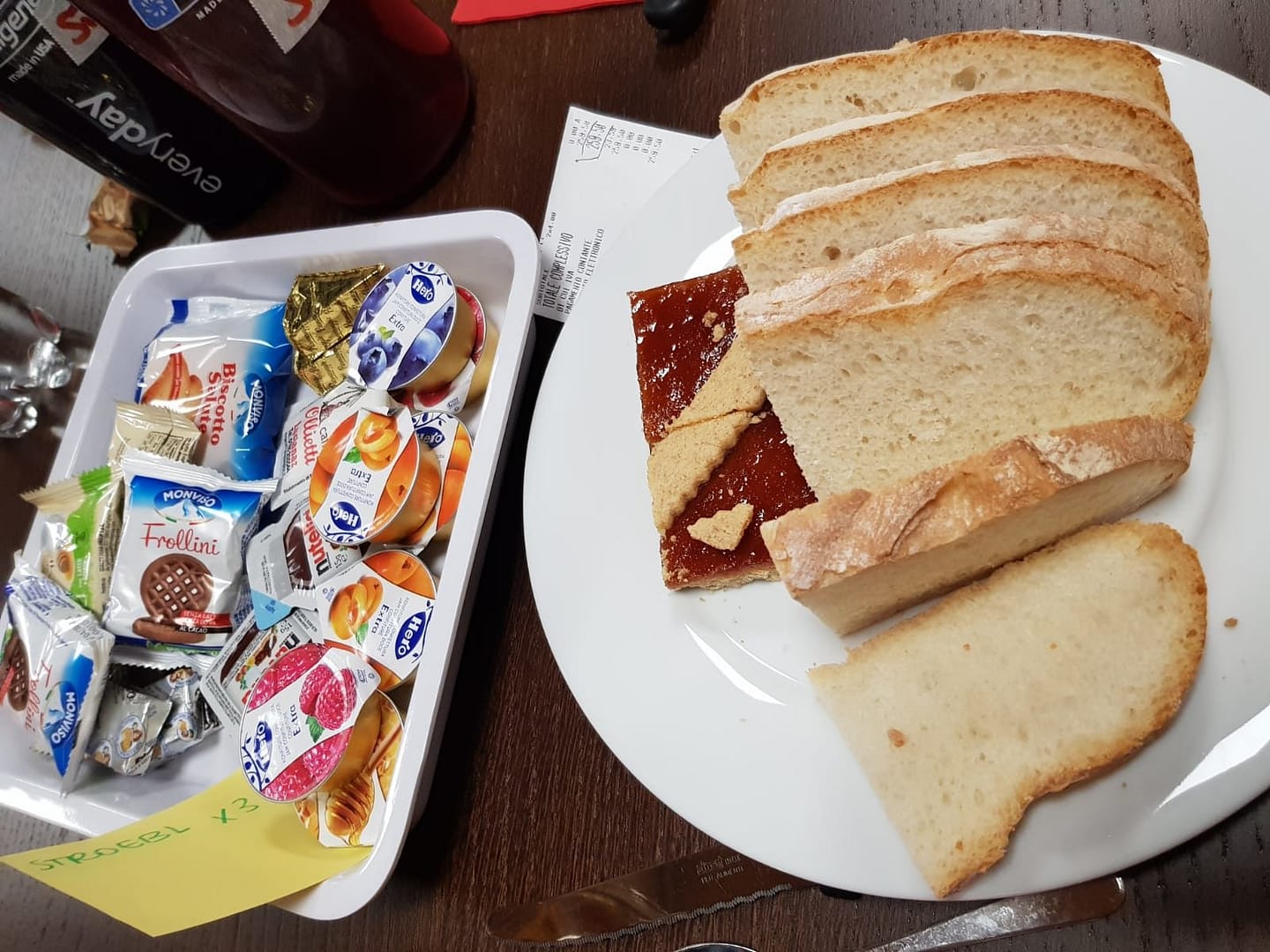 Auf der Hütte wird man Abends mit einem 3-Gänge Menue beköstigt. Als Vorspeise gibt es entweder eine Suppe oder Pasta, da ich die Energie brauchte, habe ich mich immer für die Pasta entschieden. Das Huaptgericht bestand aus hauchzartem Rinderfilet/Roastbeef und Salat. Zu guter letzt gab es noch ein süßes Teilchen. Das Frühstück hingegen fällt auf den italienischen Hütten eher spärlich aus: Brot / Zwieback wird mit Marmelade oder Nutella bestrichen und dazu gibt es Kaffee oder Tee.