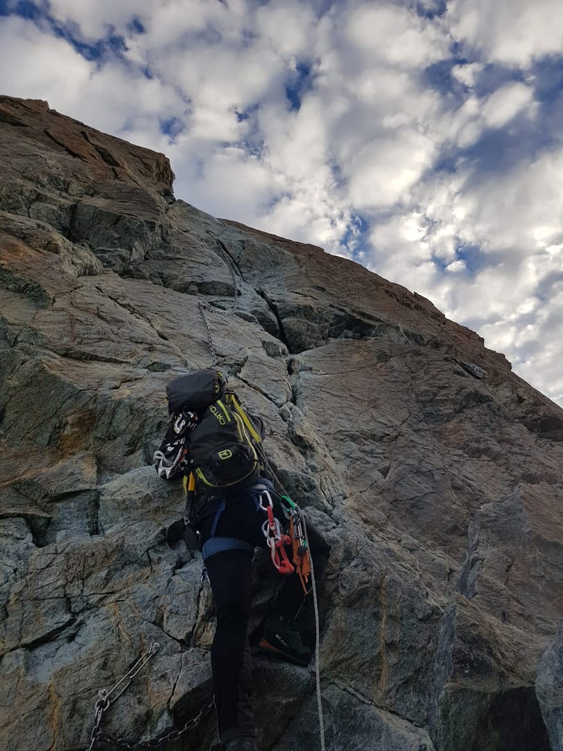 Von dem Rifugio Guide d’Ayas folgen wir der „Autobahn“ Richtung Pollux. Der Pollux ist aufgrund der Gratkletterei der technisch schwierigere von den beiden Zwillingspaar. Der nach Süden verlaufende, teilweise brüchige Felsgrat liegt im III. Schwierigkeitsgrat, bis auf eine IV. Stelle, die mit Ketten versichert ist. Oben am Felsgrat angekommen begrüßt uns eine Statue, ab hier folgt man dem ca. 100 hm über den Firngrat zum Gipfel. Der Abstieg erfolgt auf der Aufstiegsroute.