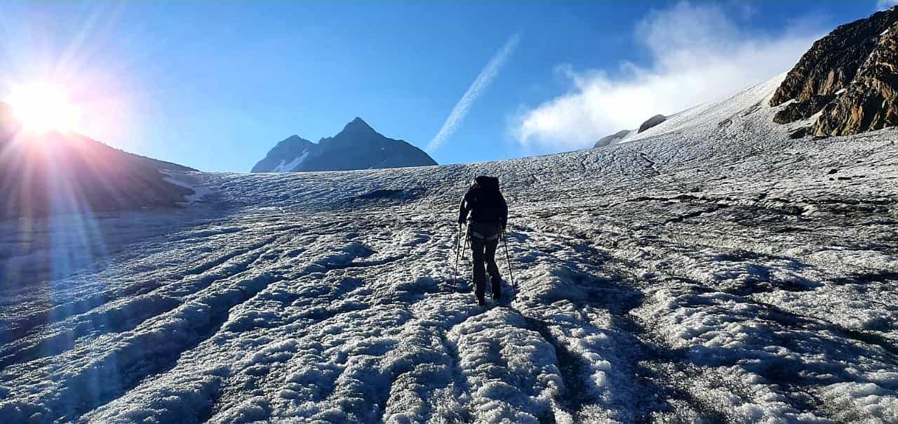 - Hochtourenausrüstung: Steigeisen, Pickel, Seil, Gurt, Karabiner, Reepschnüre, Eisschraube