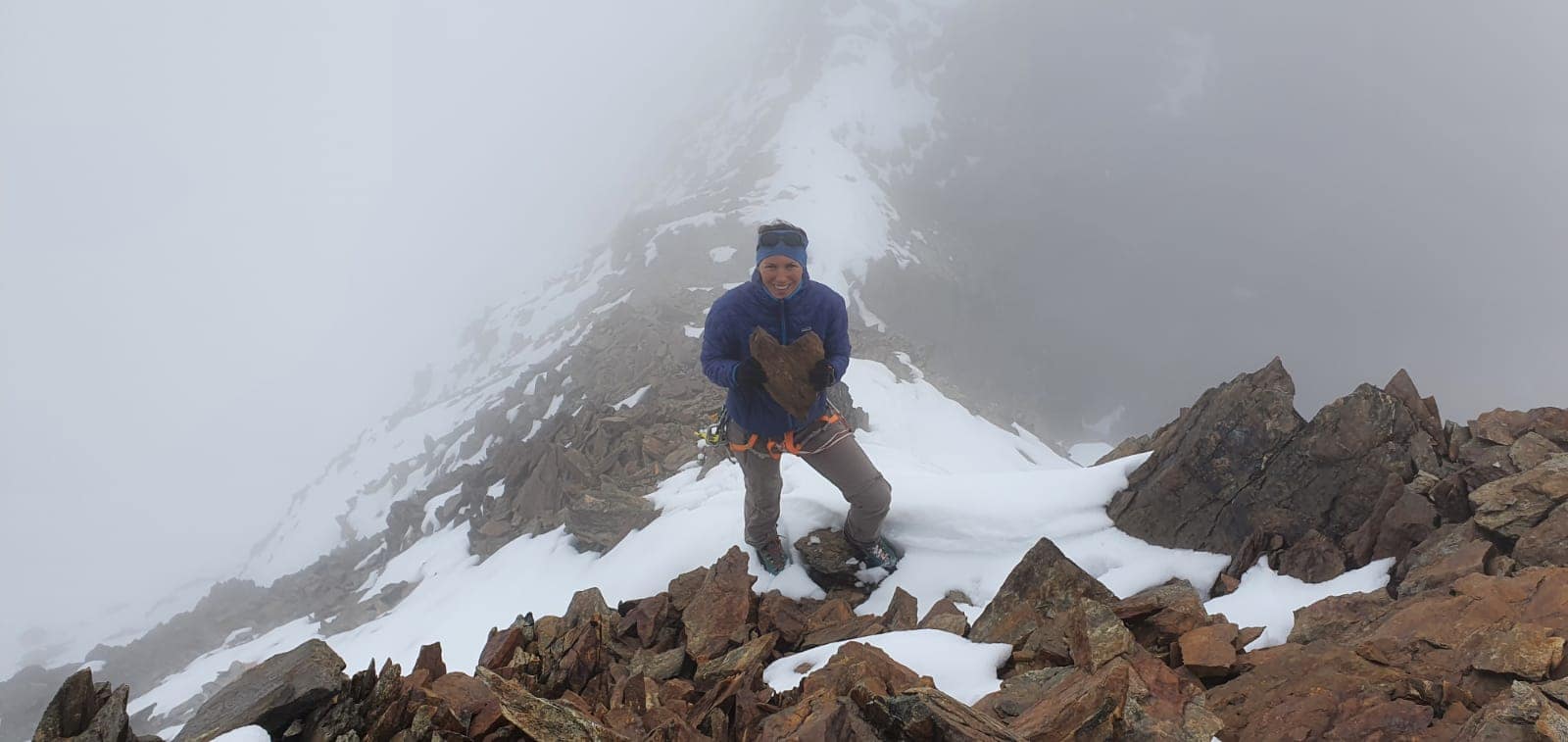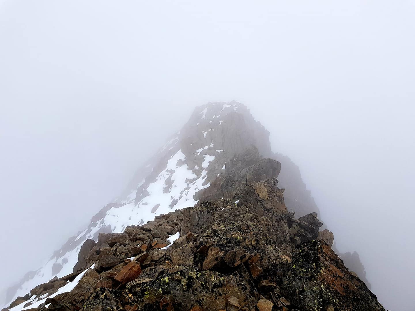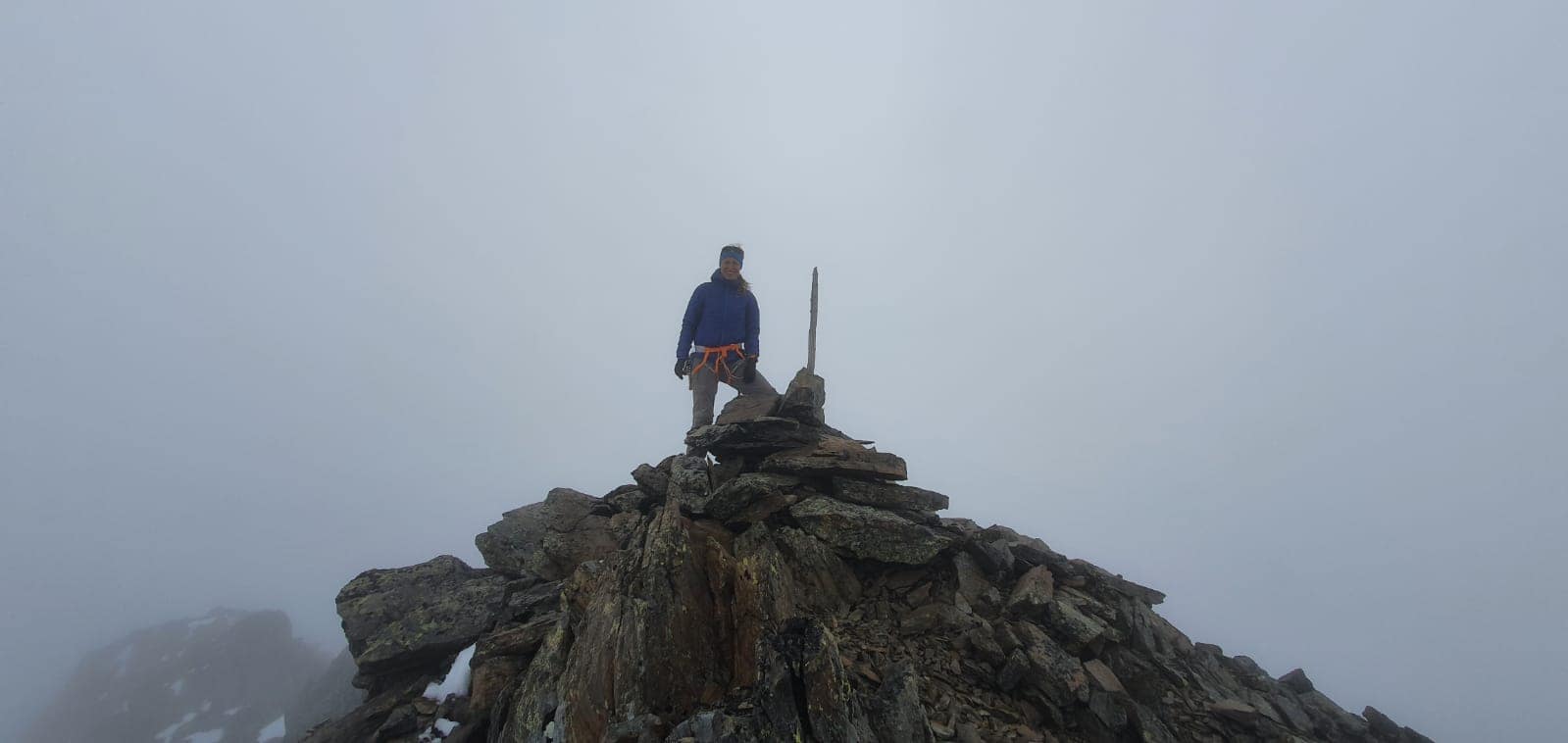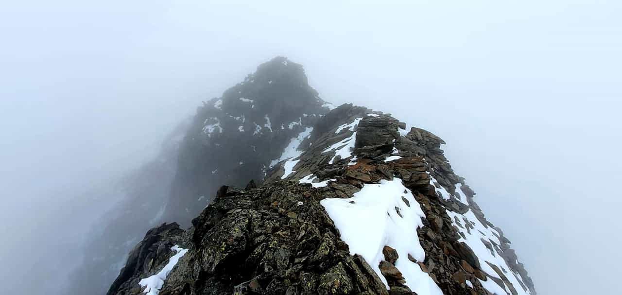 Ich wurde bereits vorgewarnt, aber dennoch war ich etwas überrascht, dass uns im Wahrsten Sinne des Wortes tatsächlich der Boden unter den Füßen weggerutscht ist. Der Grat war am Anfang sehr brüchig und wahrscheinlich auch aufgrund des Neuschnees extrem matschig. Nach ca. 1/4 des Weges wurde es ein bisschen besser, aber brüchig war es weiterhin bis zum Gipfel. Die Sicht war sehr bescheiden und für die Trittsicherheit war der Schnee nicht wirklich hilfreich. Schlussendlich sind wir aber noch bis zum Gipfel-„Kreuz“ der Rötenspitze gekommen.