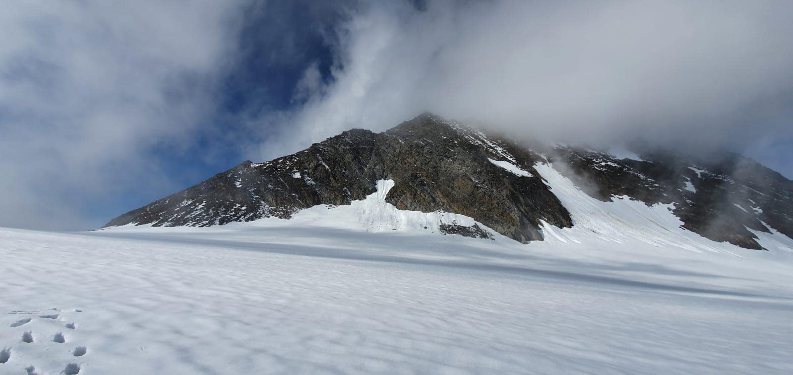 Am Schalf-Ferner angekommen, brinzelte uns die Sonne ins Gesicht und wir haben die Hochtourenausrüstung angelegt. Die Gegend und Aussicht war super schön! Zuerst ging es süd-östlich rauf bis auf der rechten Seite einige Felsblöcke sichtbar waren. Es wäre wahrscheinlich besser gewesen, wenn wir diese komplett umrundet hätten, aber wir sind mitten durch gegangen, wo es doch einige Spalten gibt. Teilweise waren die Spalten sichtbar, teilweise aber unter dem Neuschnee (ca. 15 – 20 cm) versteckt. Oben auf dem Plateau angekommen spurteten wir durch den Schnee Richtung Süden direkt auf den Grat der Rötenspitze zu. So schön es am Beginn des Ferners war, so schnell ändert sich das Wetter und die Wolken umschlossen uns.