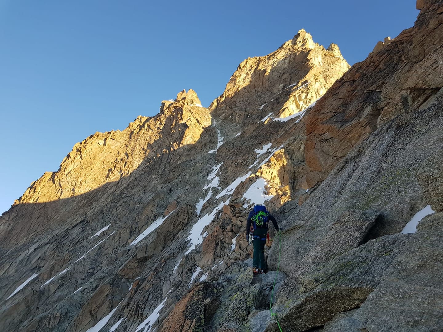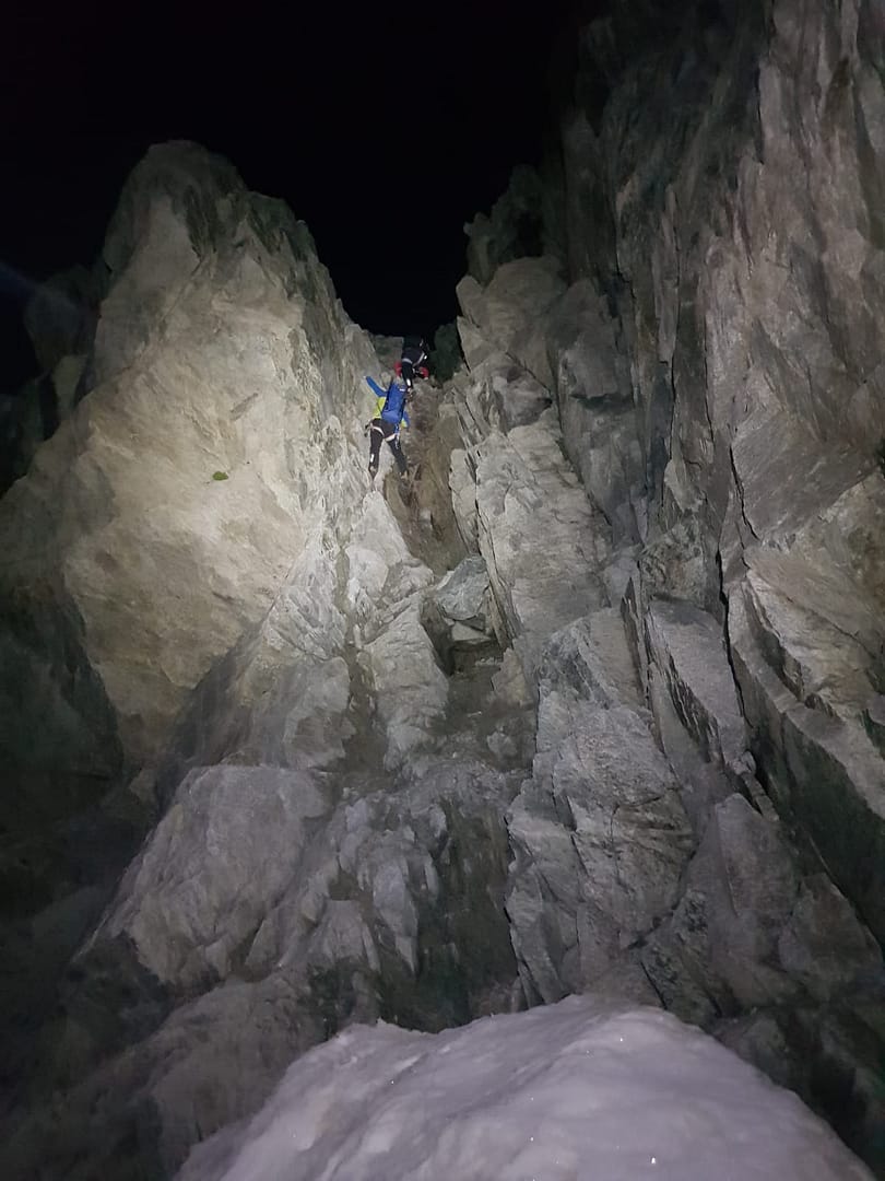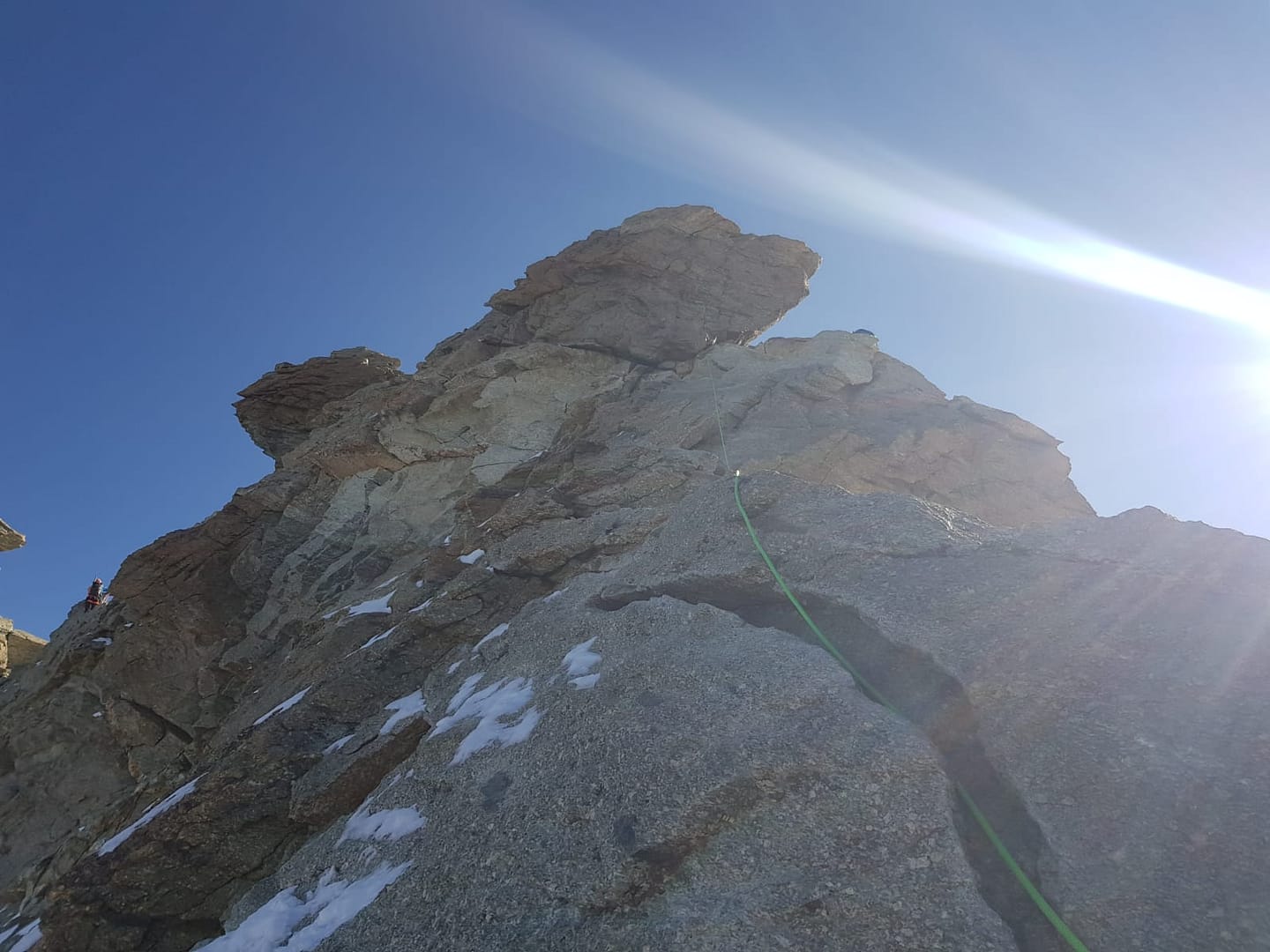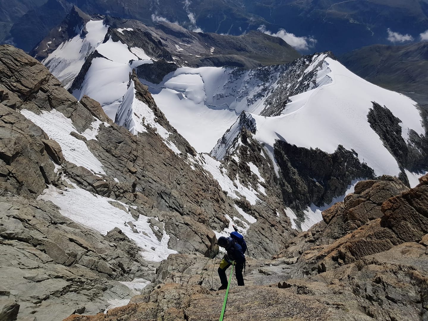 An diesem Morgen brachen einige Seilschaften auf. zuerst geht es in nördliche Richtung ca. 10 min über Felsen bis man zum Gletscherbeginn auf 3.330 m gelangt. Ab hier geht man in nordöstliche Richtung über den Rothorngletscher bis zu einer Felsstufe – da der Weg bereits so ausgetrampelte war, konnte man sich hier nicht verlaufen. An der Felsstufe angekommen, klettern man durch einen Kamin (2. Bild) rauf auf ein Felsband, welches in westliche Richtung leicht ansteigend zum Felsrücken führt (3.560 m).