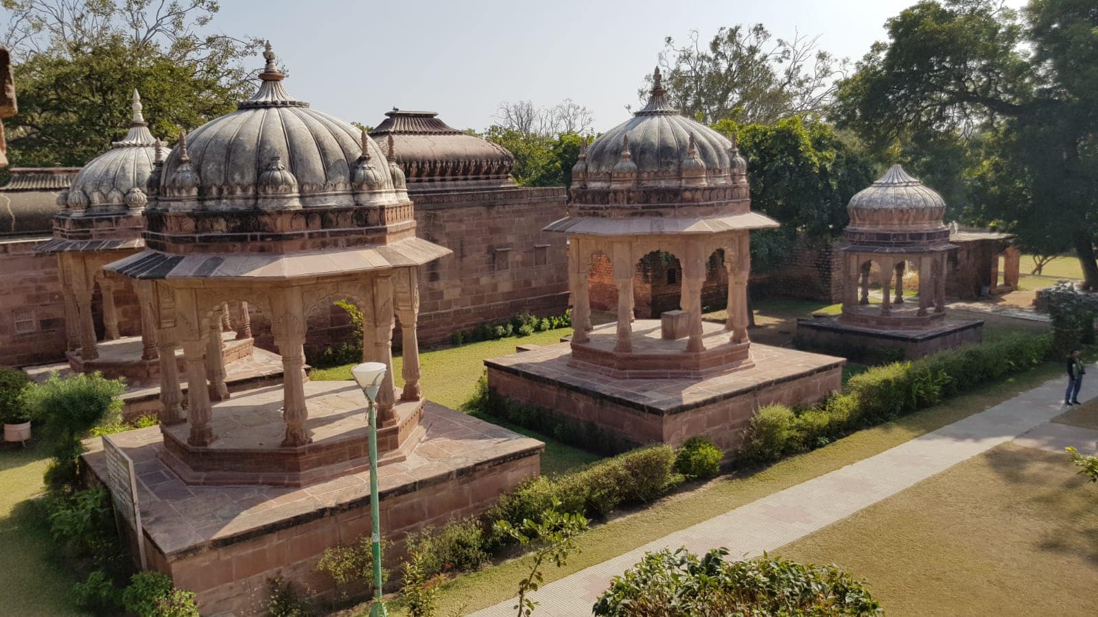Eine der faszinierenden Sehenswürdigkeiten sind die Kenotaphs oder Chattris der vielen Maharadschas von Jodhpur, die mit ihrem gut erhaltenen Zustand beeindrucken. Die Kenotaphen stammen aus dem 17. bis 18. Jahrhundert und sind eine Gruppe von Gebäuden aus rotem Sandstein mit komplizierten Schnitzereien, Säulen, hohen Türmen, kunstvollen Korridoren und skulpturalen Verzierungen. Diese Kenotaphen erinnern an vergangene Epochen und die architektonische Brillanz der damaligen Handwerkskunst. Überall im Garten gibt es Schilder mit dem Namen der Jodhpur-Herrscher, für die diese atemberaubenden Bauwerke errichtet wurden.