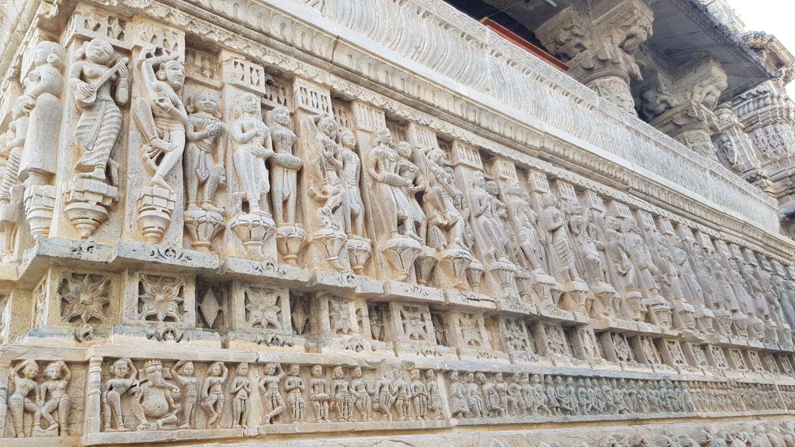 Drinnen zieht man wie üblich die Schuhe aus und geht entweder Barfuß oder auf Socken den Tempel entdecken, was aufgrund des Taubenkots nicht besonders angenehm ist. Der zweigeschossige Jagdish Tempel besteht aus dem Haupttempel, vier weitere Kleintempeln, welche in den Ecken der Tempelplattform angeordnet sind, sowie einem fünften, der als offener Schrein erbaut wurde. Löwen, Elefanten, Reiter, Musikanten, Tänzerinnen, Blumen oder Sterne säumen den fenster- und balkonlosen Tempel.