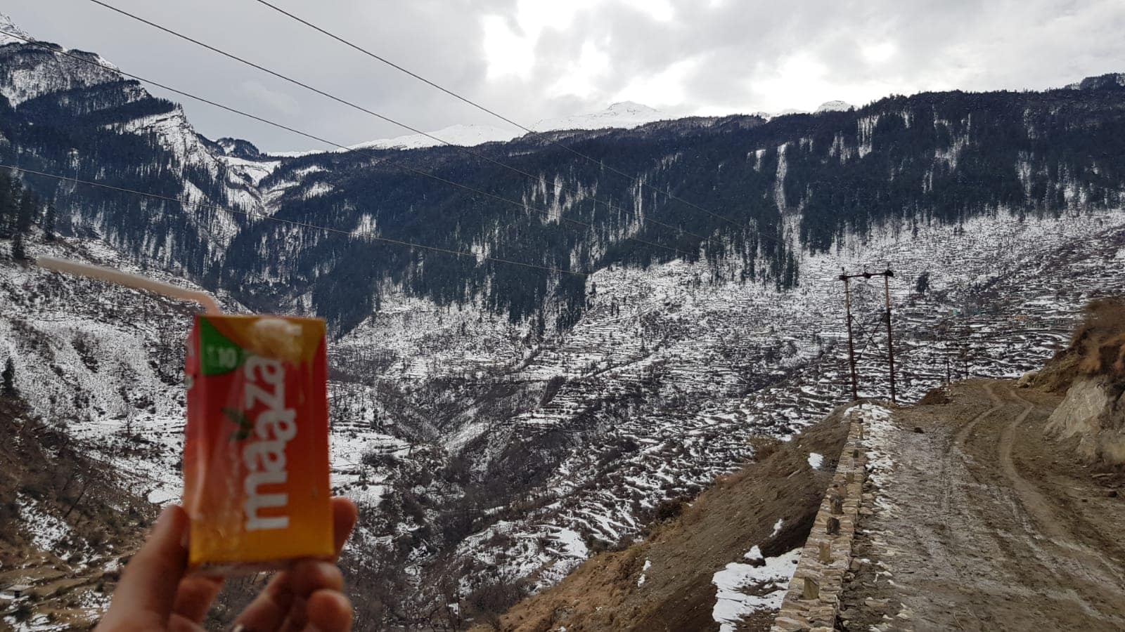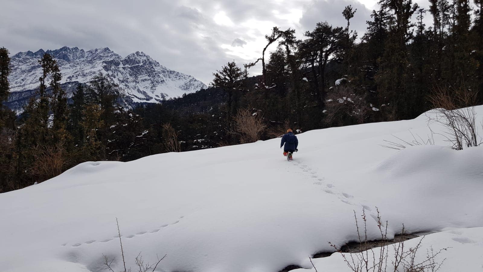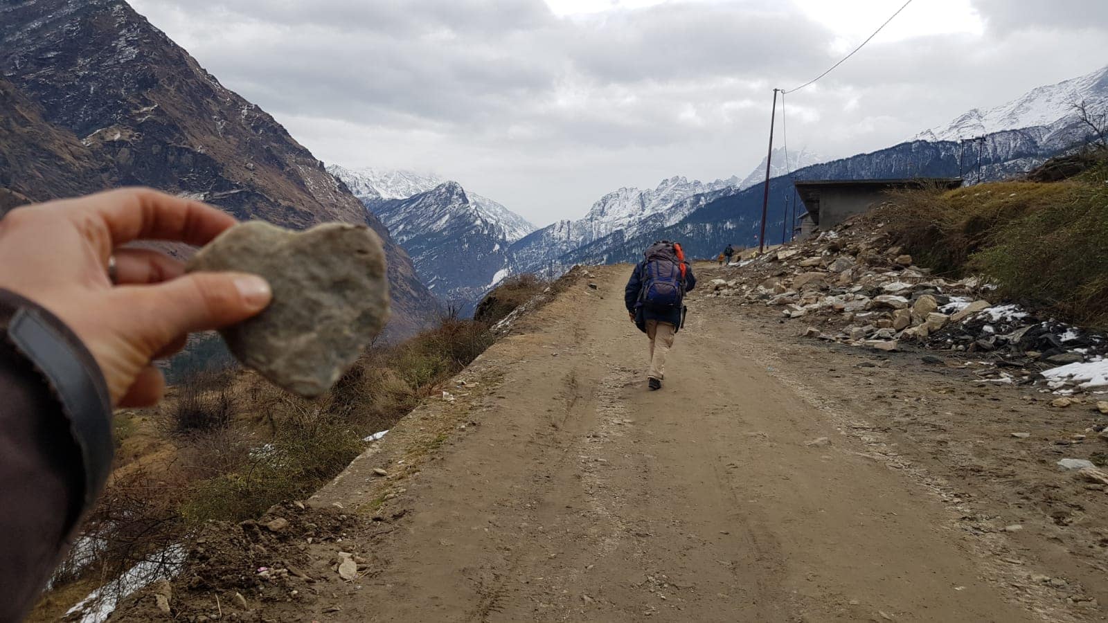 Die erste Strecke des heutigen Tages fuhren wir mit einem Jeep von Joshimath nach Dhak (ca. eine Stunde), dort wurden Snacks und Trinkpäckchen für den Marsch an uns verteilt. An dieser Stelle wurde den dreien noch erklärt wie man mit Wandertsöcken geht, denn sie waren vorher noch nie auf einem Berg/wandern. Einer der Jungen meinte, er habe für den Trek trainiert indem er 2x zum Tennis gegangen ist. Was nun Tennis mit wandern auf 4000 Höhenmeter zu tun ist mir allerdings ein Rätsel. Ungefähr 2,5 km folgten wir der matschigen Fahrstraße bis wir dann nach rechts in ein Tal abbogen.