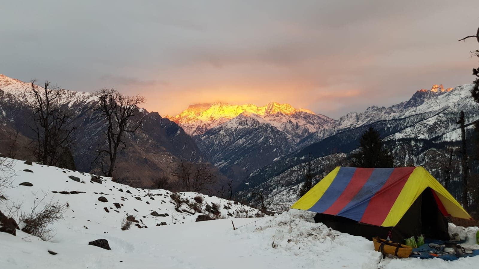 Nachdem wir unsere Rucksäcke verstaut hatten, wärmten wir uns im Gemeinschaftszelt mit leckerem Tee und Essen auf. Hier lernten wir uns dann auch besser kennen und erzählten uns Geschichten. Später genossen wir den genialen Ausblick vom Camp und dem Glühen der Berge.