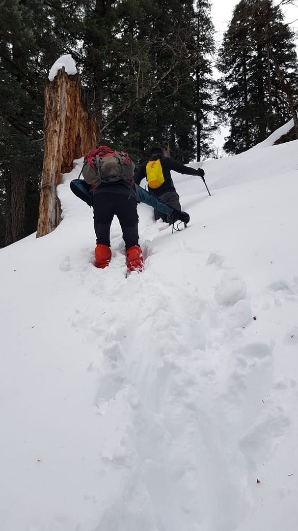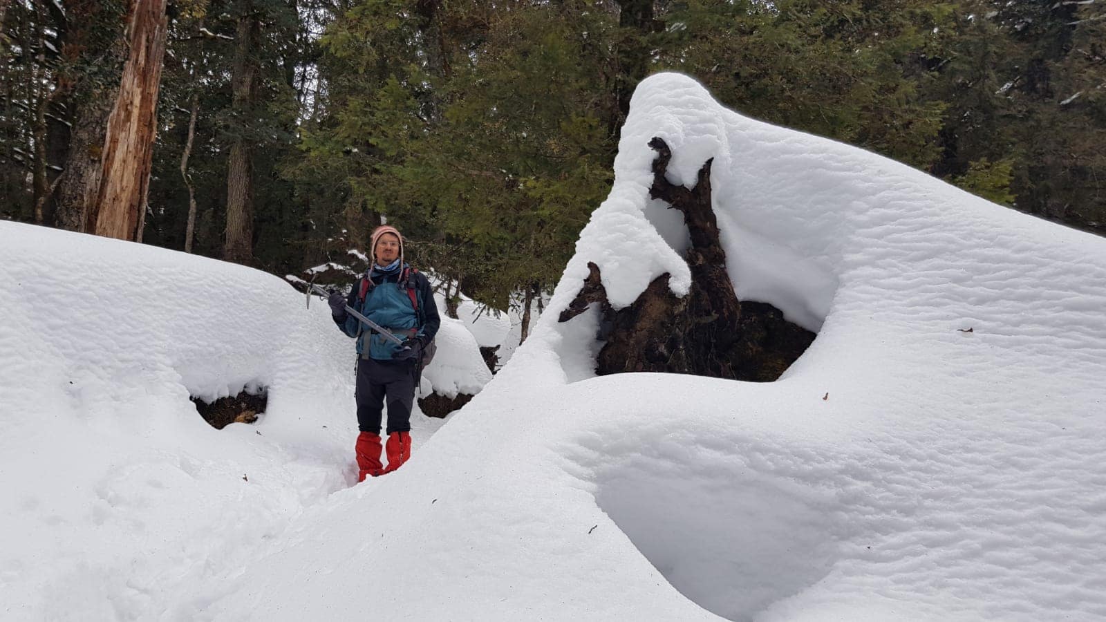 Irgendwann haben wir es dann doch geschafft loszulaufen, aber der Weg erwies sich als schwieriger als gedacht, da doch mehr Schnee runterkam als angesagt war. Wir kämpften uns so weit vor wie möglich vor, mussten dann aber aufgrund des Wetterumschwungs und der Höhe des Schnees abbrechen. Die Köche, die im Camp geblieben sind, hatten uns per Funk mitgeteilt, dass noch schlechteres Wetter auf uns zu komm, so dass wir schleunigst umdrehten. Es wurde eisig-kalt und die Sicht immer schlechter, da die anderen drei so langsam unterwegs waren, bin ich alleine schneller zum Camp zurück gelaufen und habe den Köchen geholfen das Camp zu festigen. An diesen zwei Tagen haben wir es nicht mal zu unserem eigentlichen Camp, welches für den ersten Tag geplant war, geschafft.