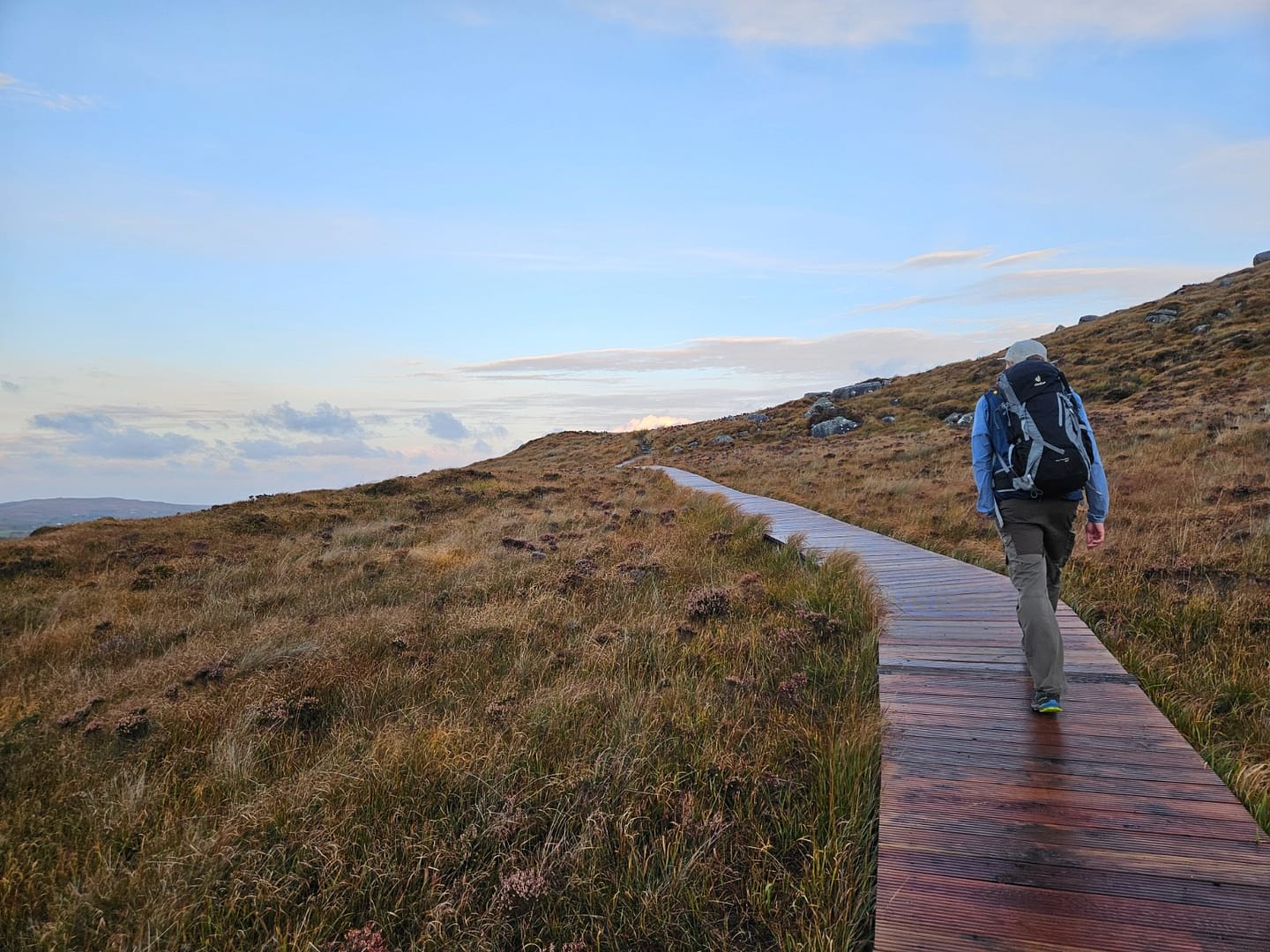 Als es dann endlich losging, haben wir uns für eine Kombination aus drei Routen entschieden: Zunächst folgten wir dem Lower Diamond Hill Walk Richtung Süden, einem gemütlichen Pfad durch Heide, Moos und weite Moorlandschaft. Der Weg ist gut befestigt, ideal zum Reinkommen. Schon hier gibt’s wunderschöne Blicke in die umliegende Landschaft.