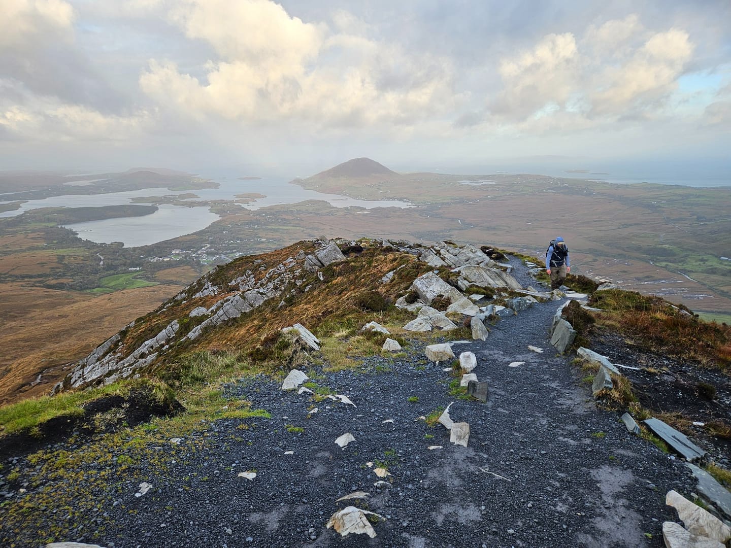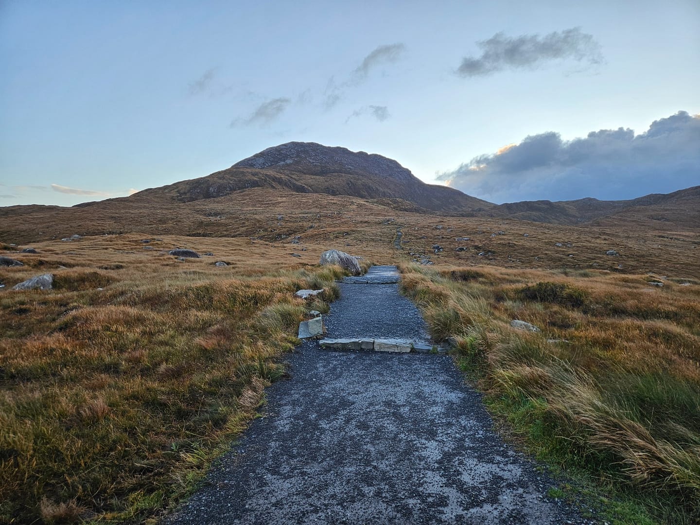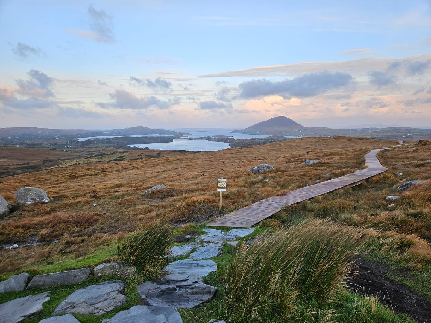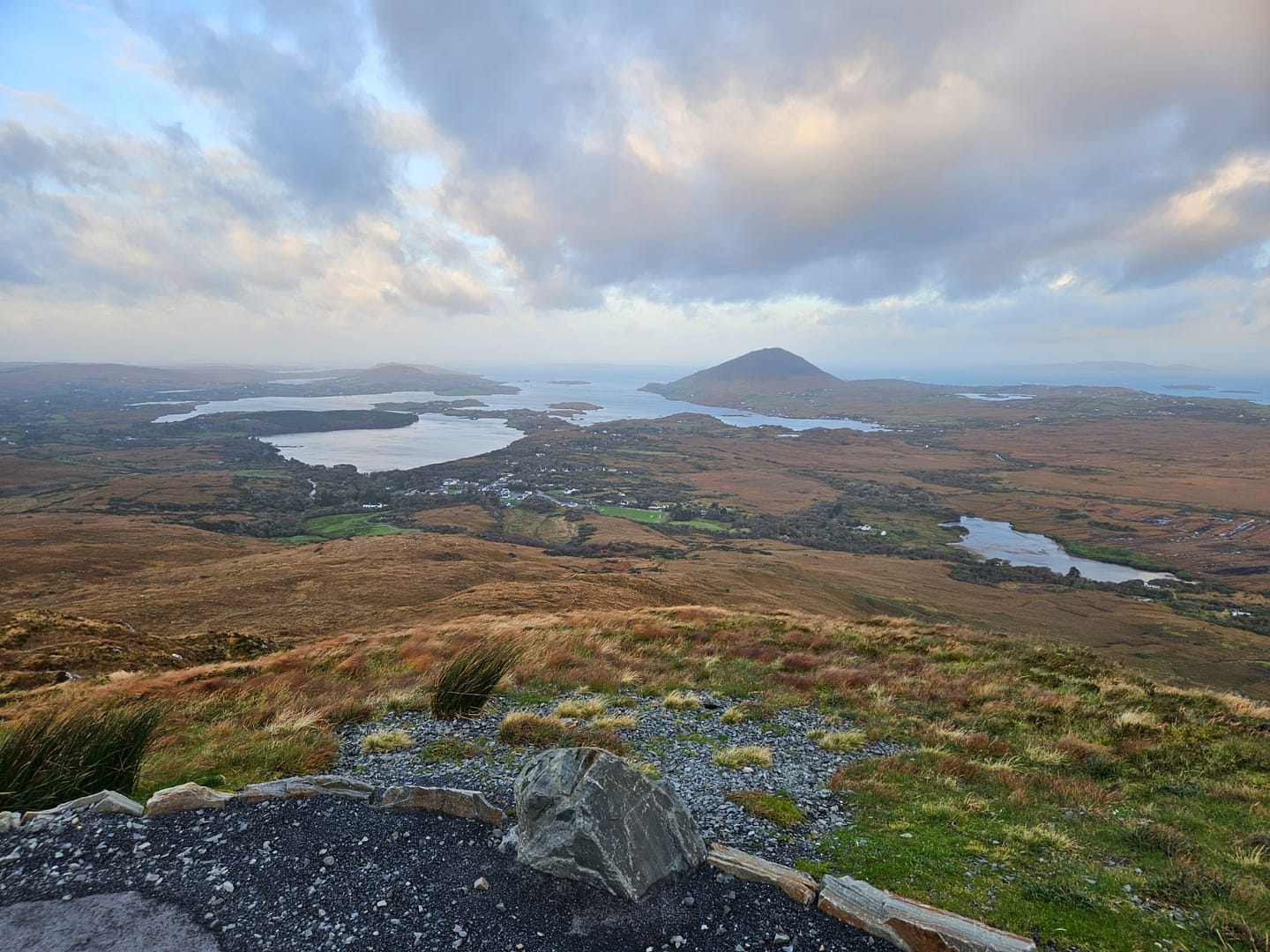 Nach cam 2,1 km wechselten wir direkt auf den Upper Diamond Hill Walk. Der Anstieg wird hier steiler, führt über Steinstufen und felsige Abschnitte – aber alles sehr gut ausgebaut und absolut machbar. Oben angekommen, haben wir den Gipfel mit dem fantastisch Rundumblick einfach genossen! Die Twelve Bens, das offene Meer, kleine Seen – man weiß gar nicht, wo man zuerst hinschauen soll.