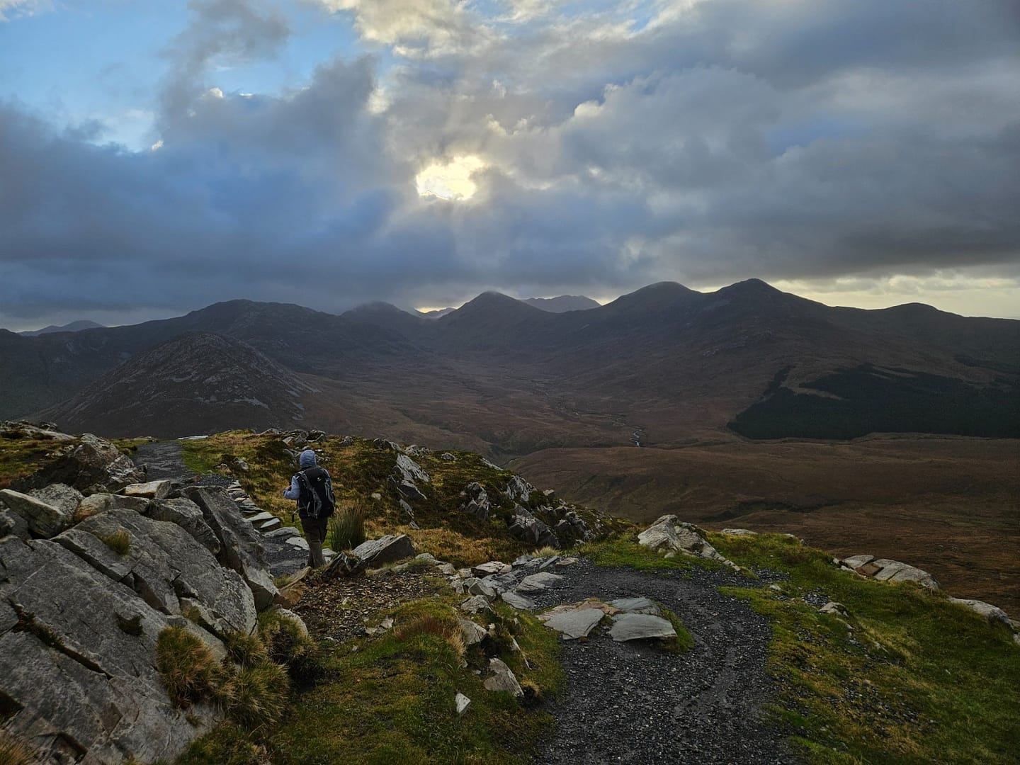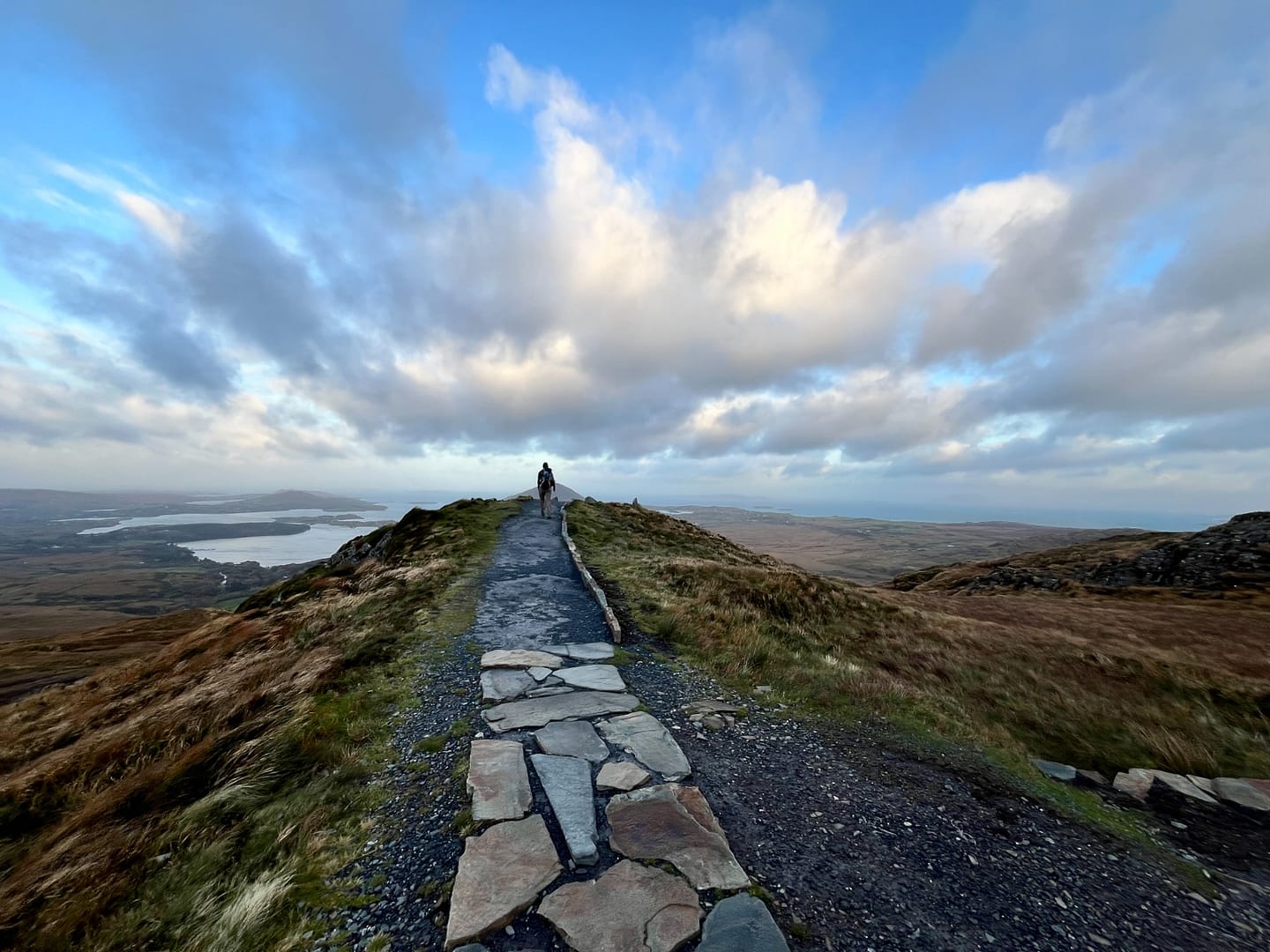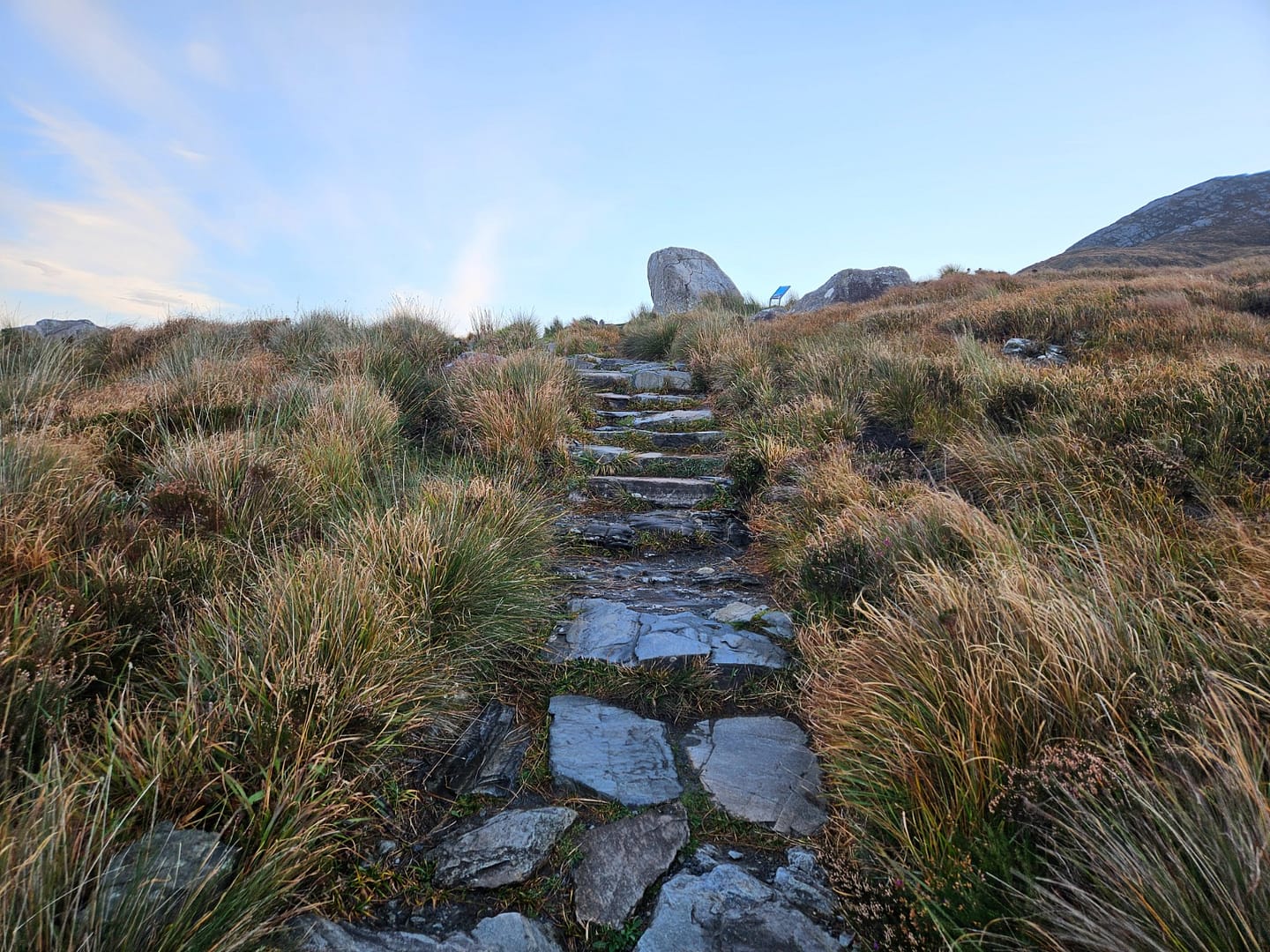 Nach cam 2,1 km wechselten wir direkt auf den Upper Diamond Hill Walk. Der Anstieg wird hier steiler, führt über Steinstufen und felsige Abschnitte – aber alles sehr gut ausgebaut und absolut machbar. Oben angekommen, haben wir den Gipfel mit dem fantastisch Rundumblick einfach genossen! Die Twelve Bens, das offene Meer, kleine Seen – man weiß gar nicht, wo man zuerst hinschauen soll.
