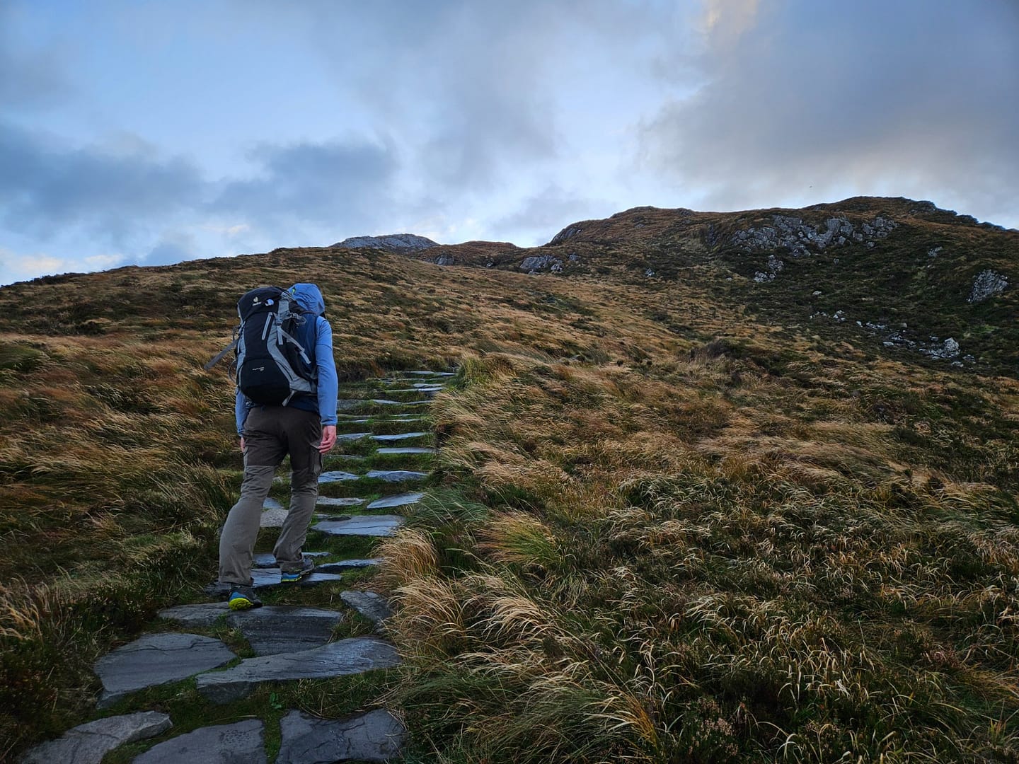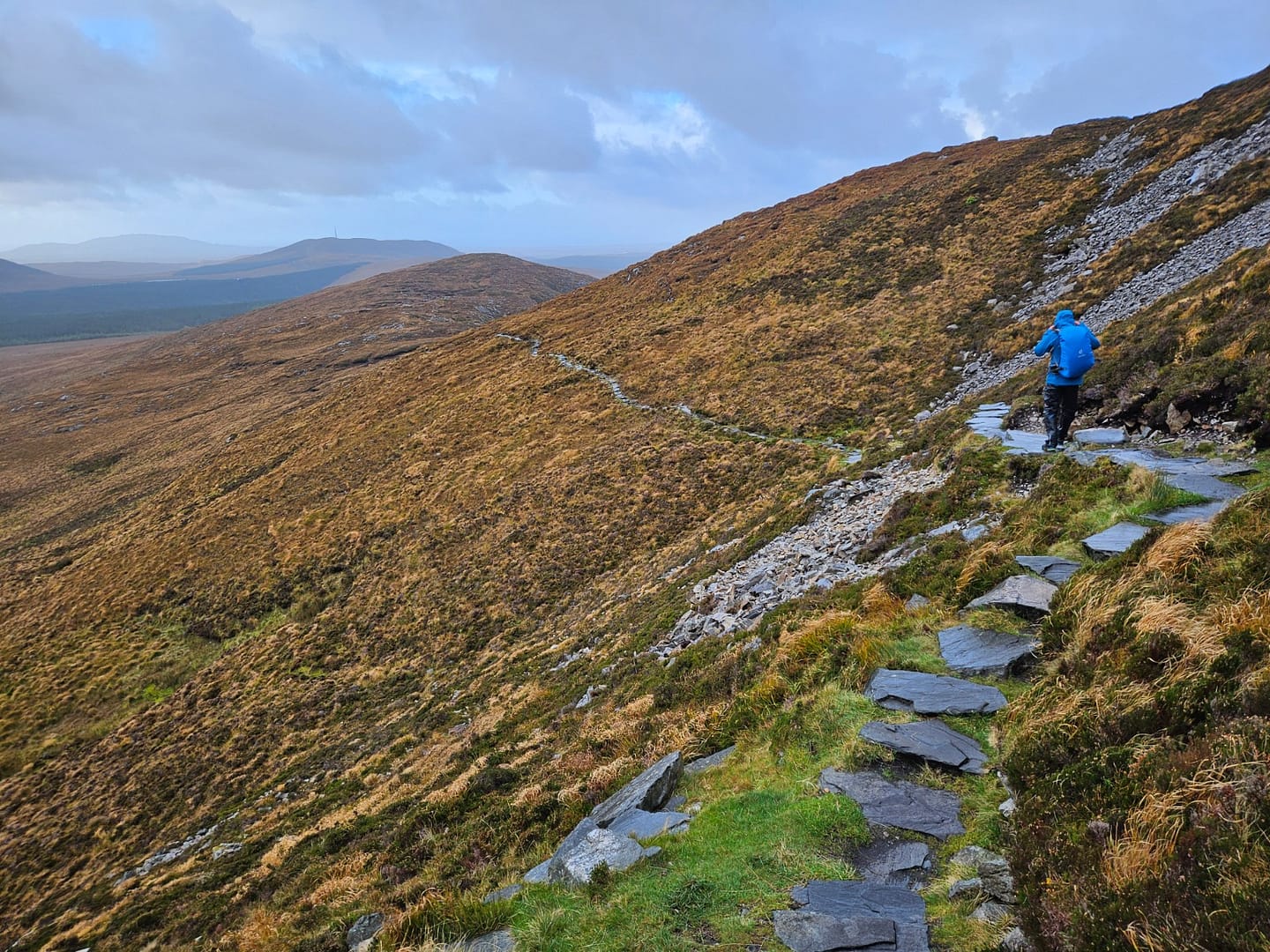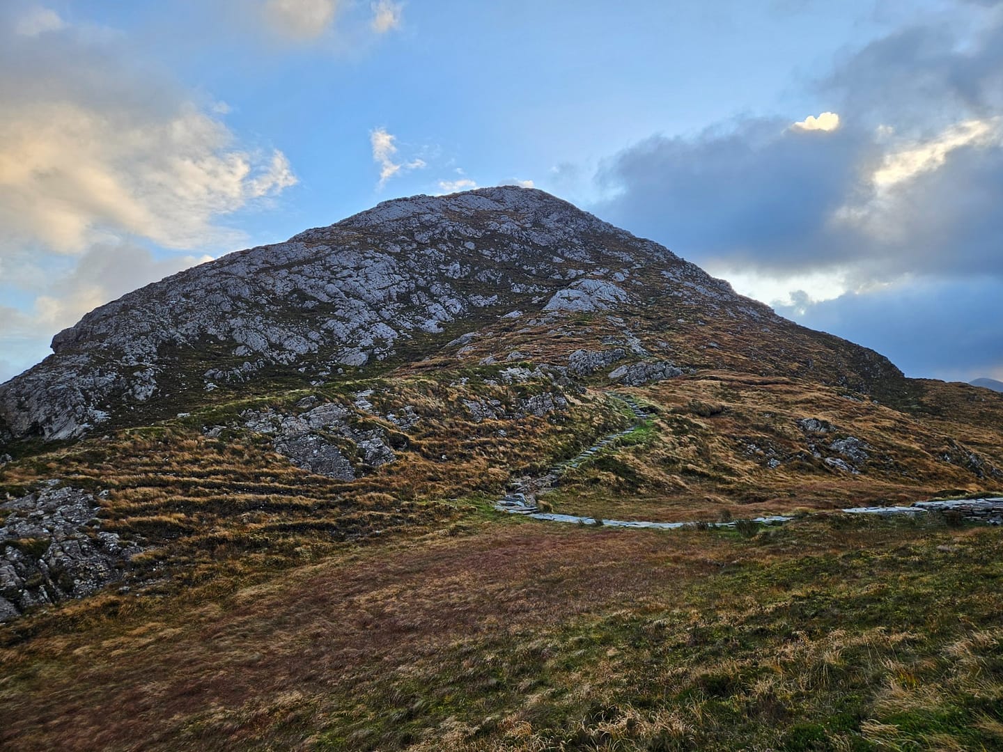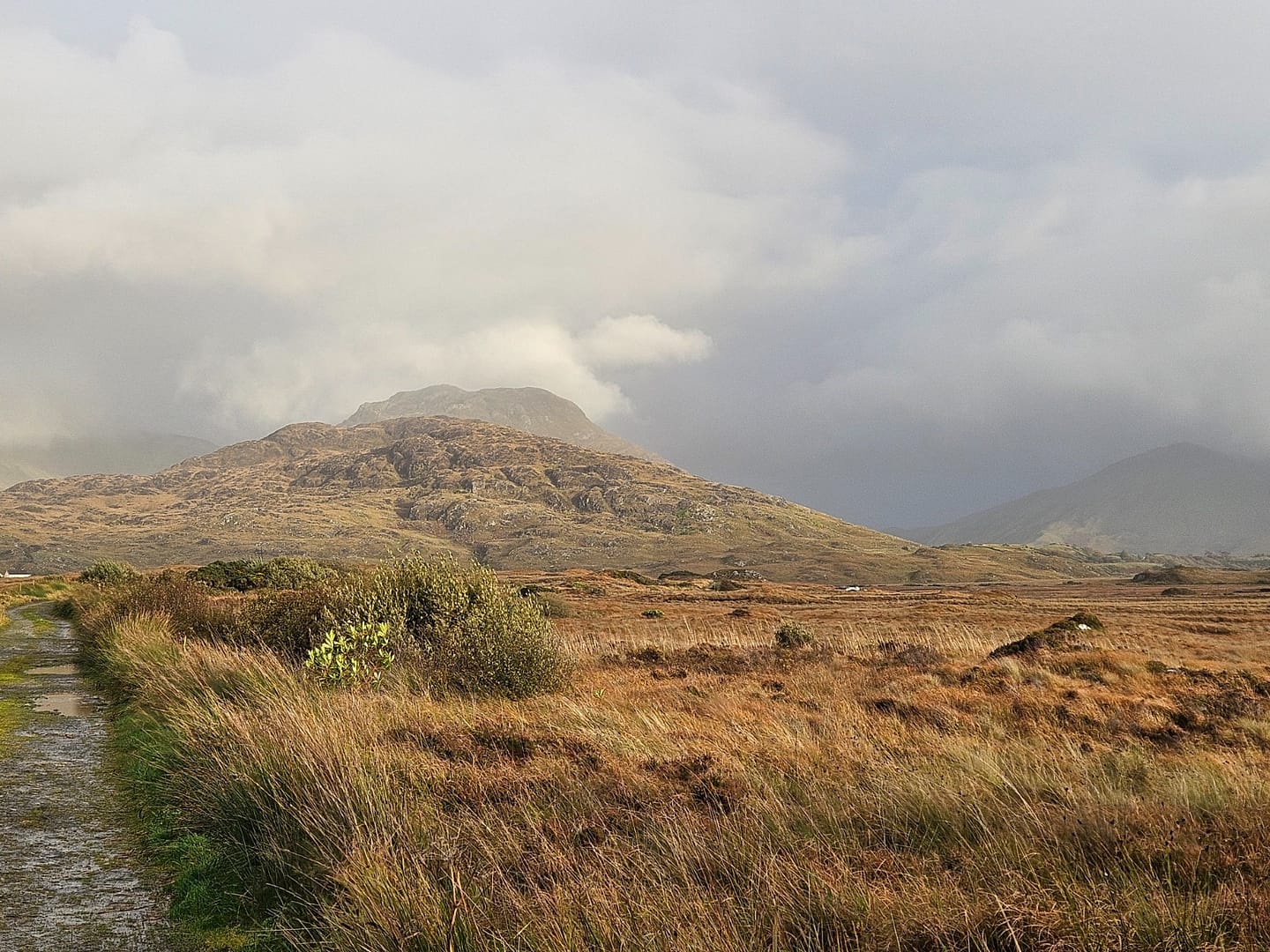 Nach cam 2,1 km wechselten wir direkt auf den Upper Diamond Hill Walk. Der Anstieg wird hier steiler, führt über Steinstufen und felsige Abschnitte – aber alles sehr gut ausgebaut und absolut machbar. Oben angekommen, haben wir den Gipfel mit dem fantastisch Rundumblick einfach genossen! Die Twelve Bens, das offene Meer, kleine Seen – man weiß gar nicht, wo man zuerst hinschauen soll.