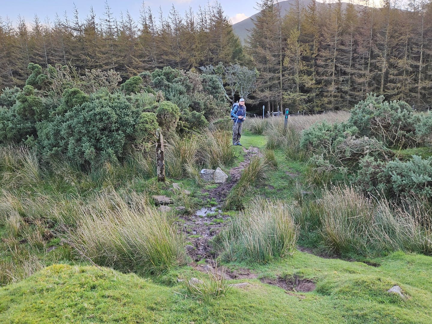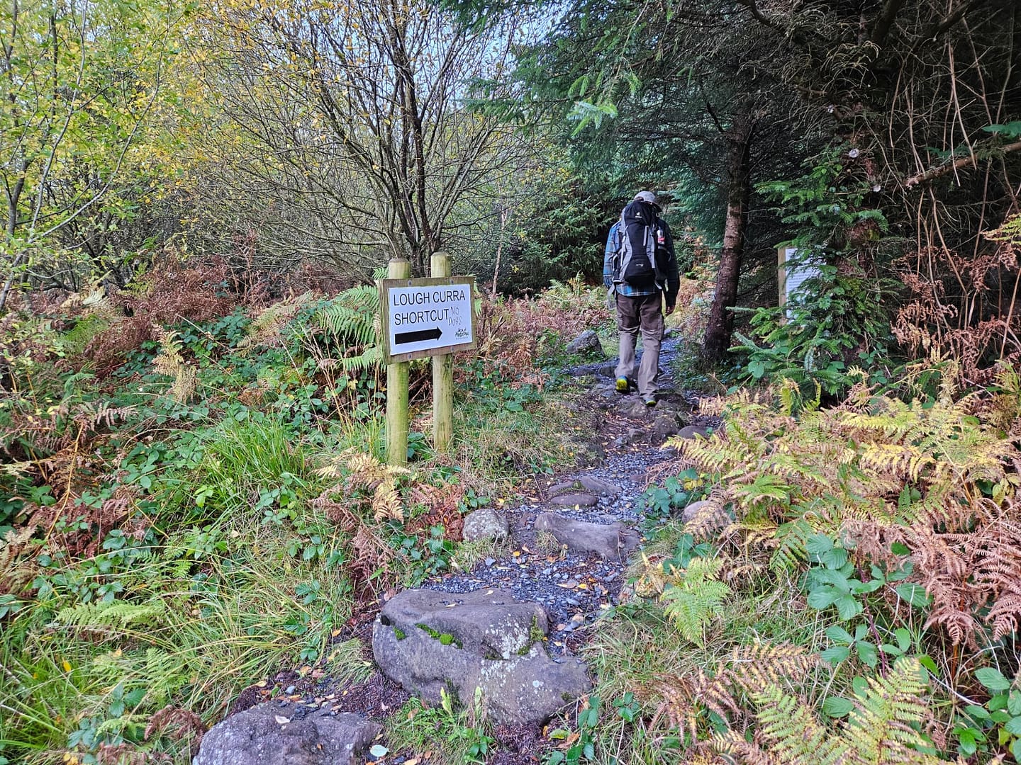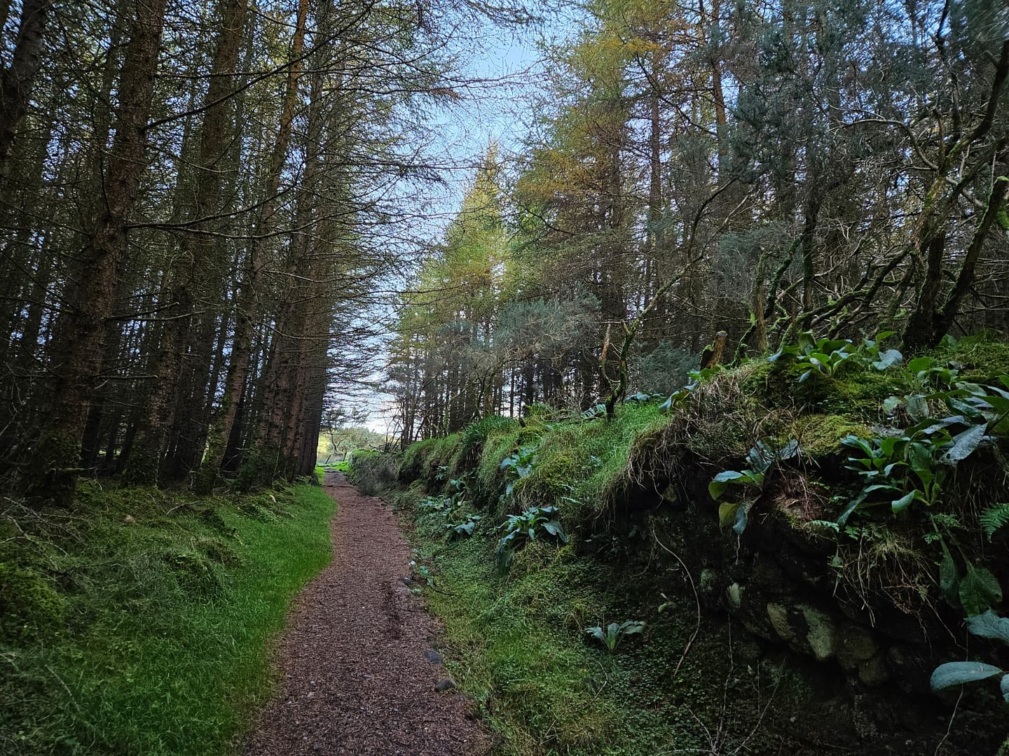 Vom ausgeschilderten Parkplatz Cush Car Park (Galtymore North) folgen wir der Forststraße in südlicher Richtung. Nach etwa 1,2 km erreichen wir eine Abzweigung, die mit „Shortcut“ gekennzeichnet ist – eine kleine Abkürzung durch den Wald, die ein kurzes Stück des Weges über die Forststraße erspart. Nach insgesamt 1,9 km gelangen wir zu einem weiteren Parkplatz. Wer sich die ersten Meter sparen möchte, kann auch hier parken.