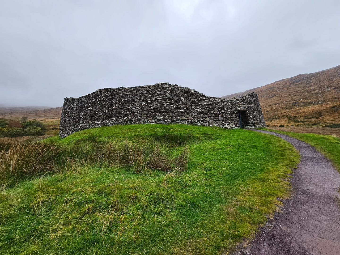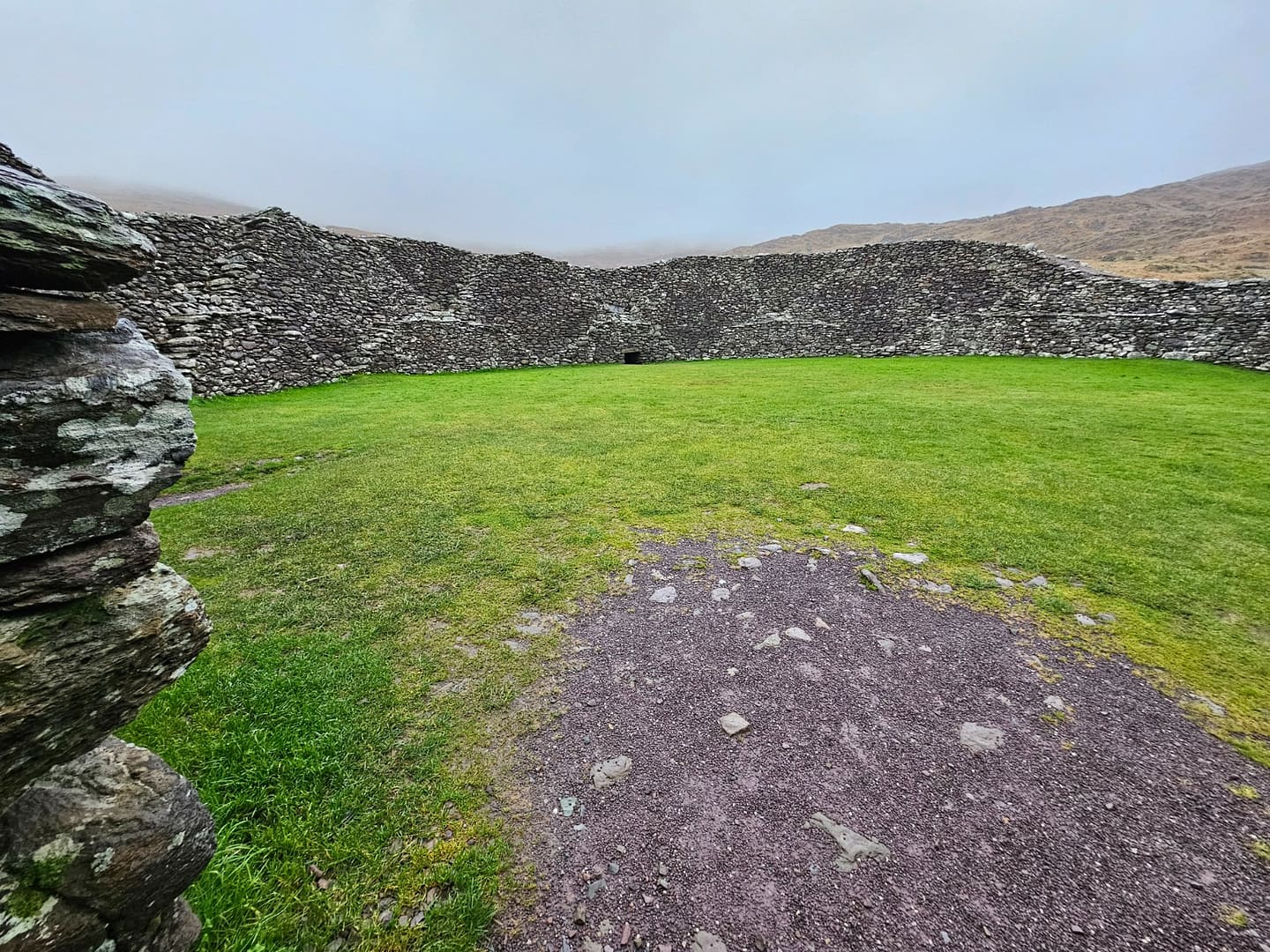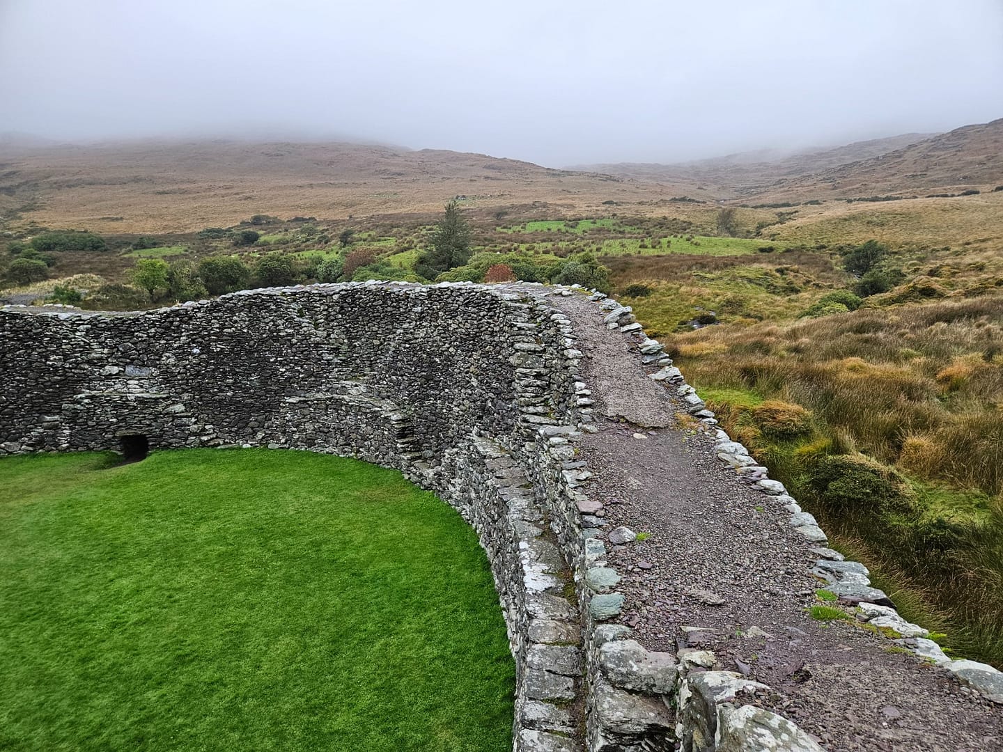 Staigue Fort ist ein beeindruckendes, gut erhaltenes Ringfort aus der Eisenzeit, vermutlich zwischen 300 und 400 n. Chr. errichtet. Es liegt abgelegen auf der Iveragh-Halbinsel im County Kerry – nicht weit vom berühmten Ring of Kerry entfernt. Das Fort wurde vollständig aus trocken geschichtetem Stein gebaut, also ohne Mörtel. Die Mauern sind bis zu 5,5 Meter hoch und rund 4 Meter dick – ein bauliches Meisterwerk für seine Zeit. Im Inneren sieht man Treppen, die in die Mauern eingelassen sind, sowie kleine Kammern. Wahrscheinlich diente es als Wohnsitz eines regionalen Häuptlings und zugleich als Schutzanlage für Familie, Vieh und Vorräte.