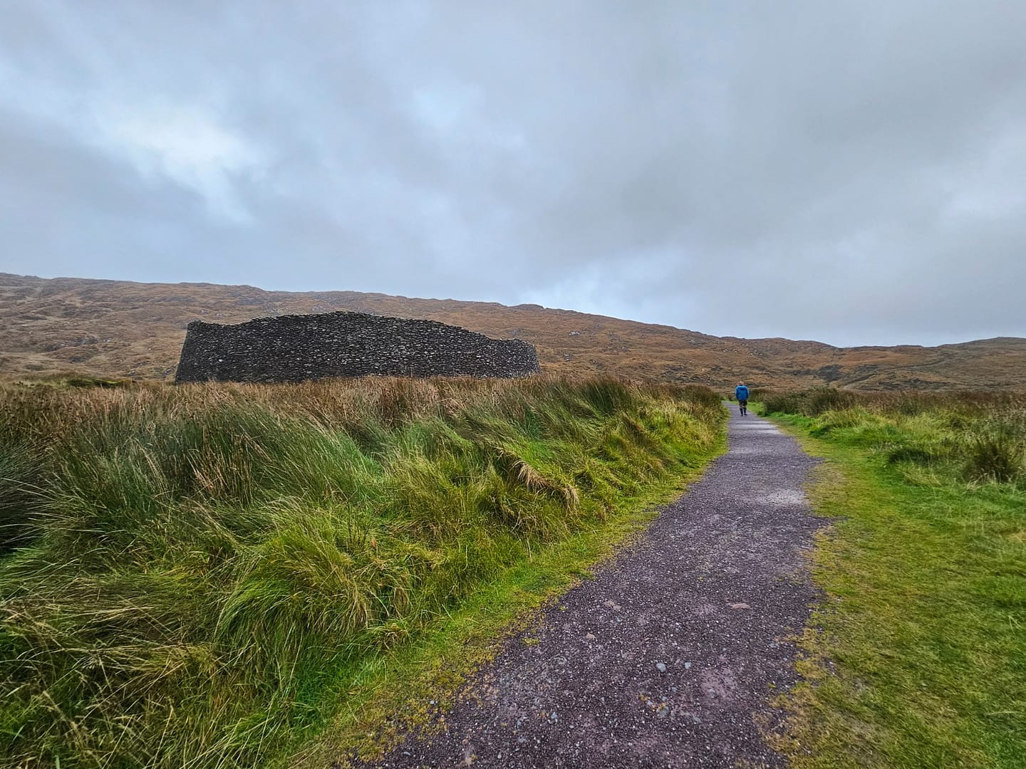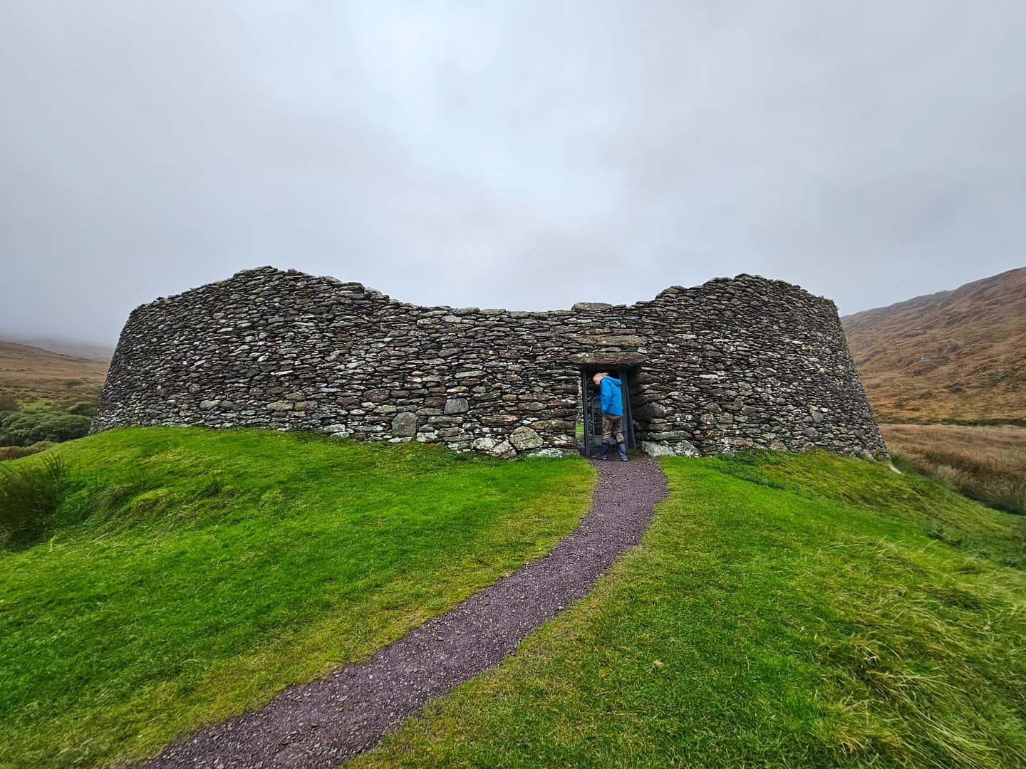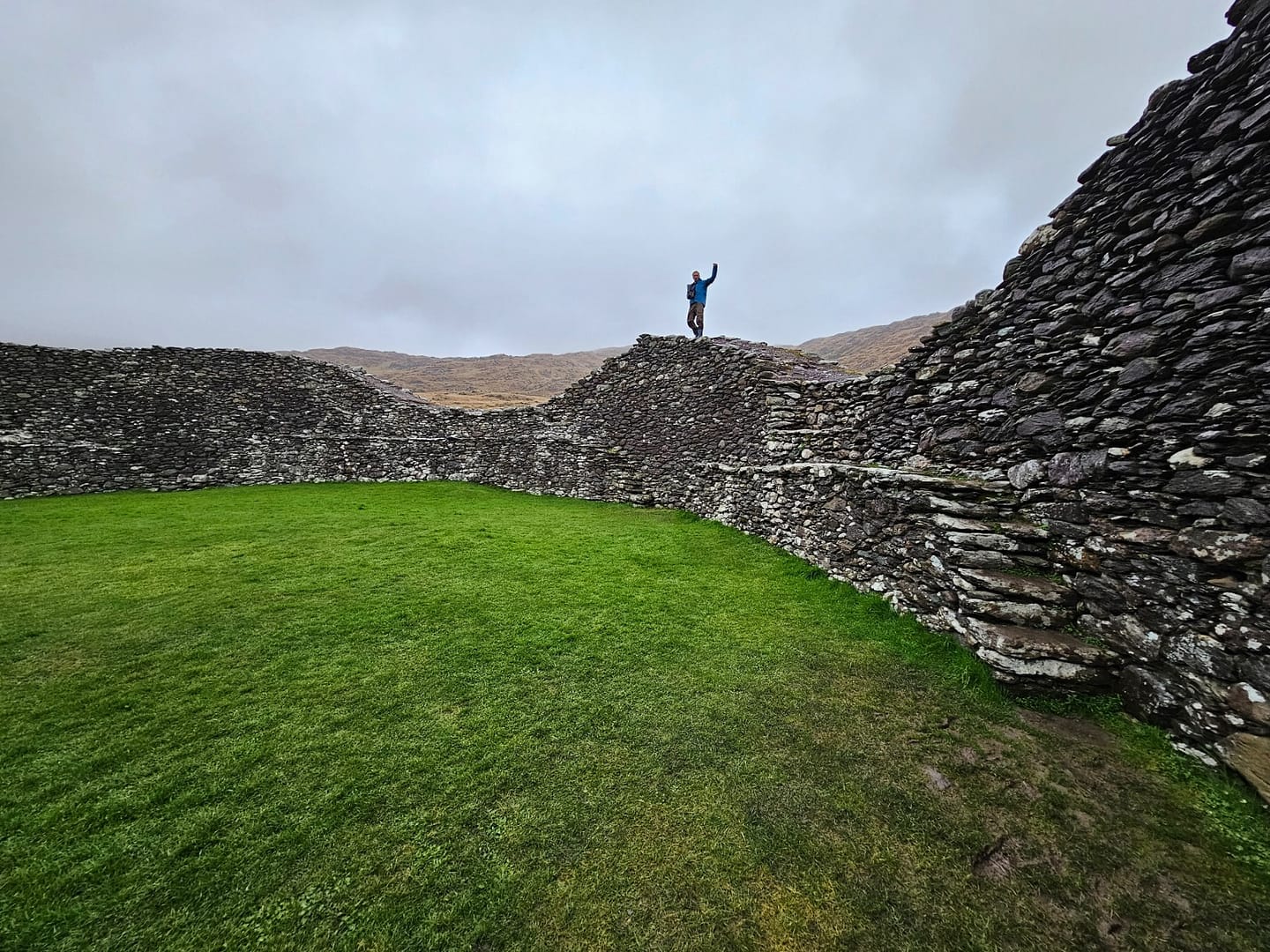 Staigue Fort ist ein beeindruckendes, gut erhaltenes Ringfort aus der Eisenzeit, vermutlich zwischen 300 und 400 n. Chr. errichtet. Es liegt abgelegen auf der Iveragh-Halbinsel im County Kerry – nicht weit vom berühmten Ring of Kerry entfernt. Das Fort wurde vollständig aus trocken geschichtetem Stein gebaut, also ohne Mörtel. Die Mauern sind bis zu 5,5 Meter hoch und rund 4 Meter dick – ein bauliches Meisterwerk für seine Zeit. Im Inneren sieht man Treppen, die in die Mauern eingelassen sind, sowie kleine Kammern. Wahrscheinlich diente es als Wohnsitz eines regionalen Häuptlings und zugleich als Schutzanlage für Familie, Vieh und Vorräte.