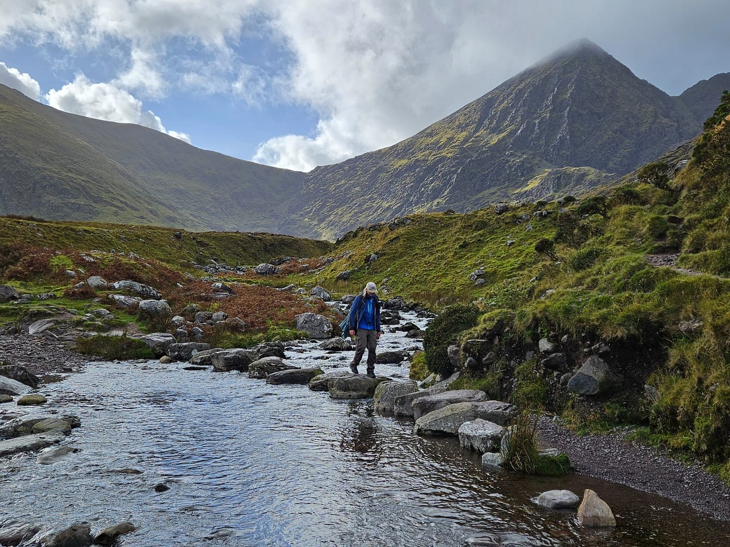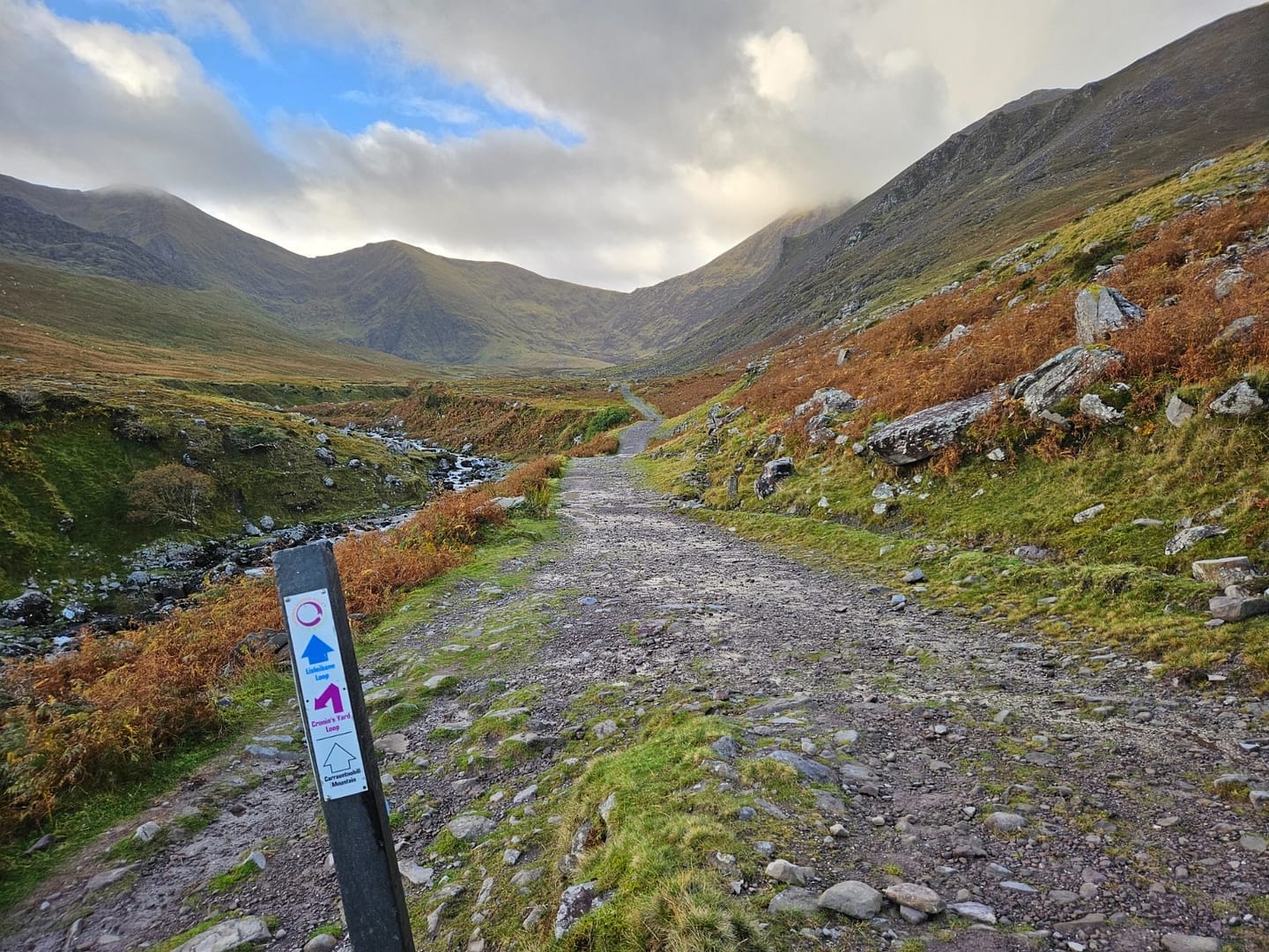 Vom Parkplatz aus betreten wir direkt die weiten Schafweiden. Nach einem sanften Rechtsbogen folgen wir einem Bachlauf in südlicher Richtung auf die beeindruckende Bergkette zu. Schon jetzt erhebt sich unser Gipfelziel, Carrauntoohil, der höchste Berg Irlands, majestätisch vor uns.